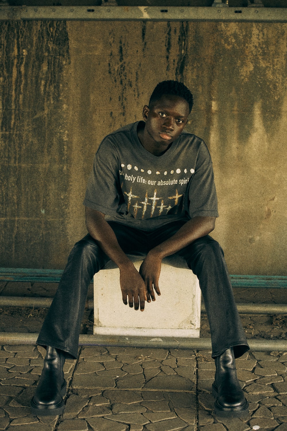 A printed T-shirt adorned with motifs related to "holiness", including light, a cross, and the word "GOD" on the back.