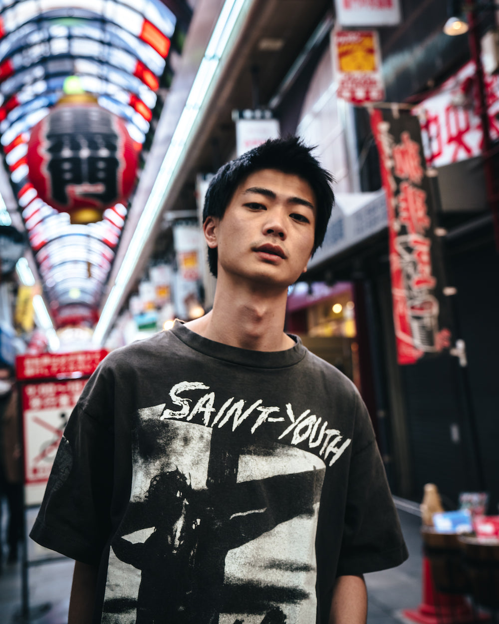 This cut sew has the graphic of the crucifixion of Christ and "SAINT YOUTH" on the front, and the graphic of Mary and the characteristic of SAINT Mxxxxxx on the back.