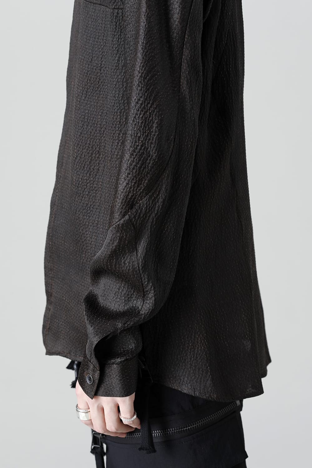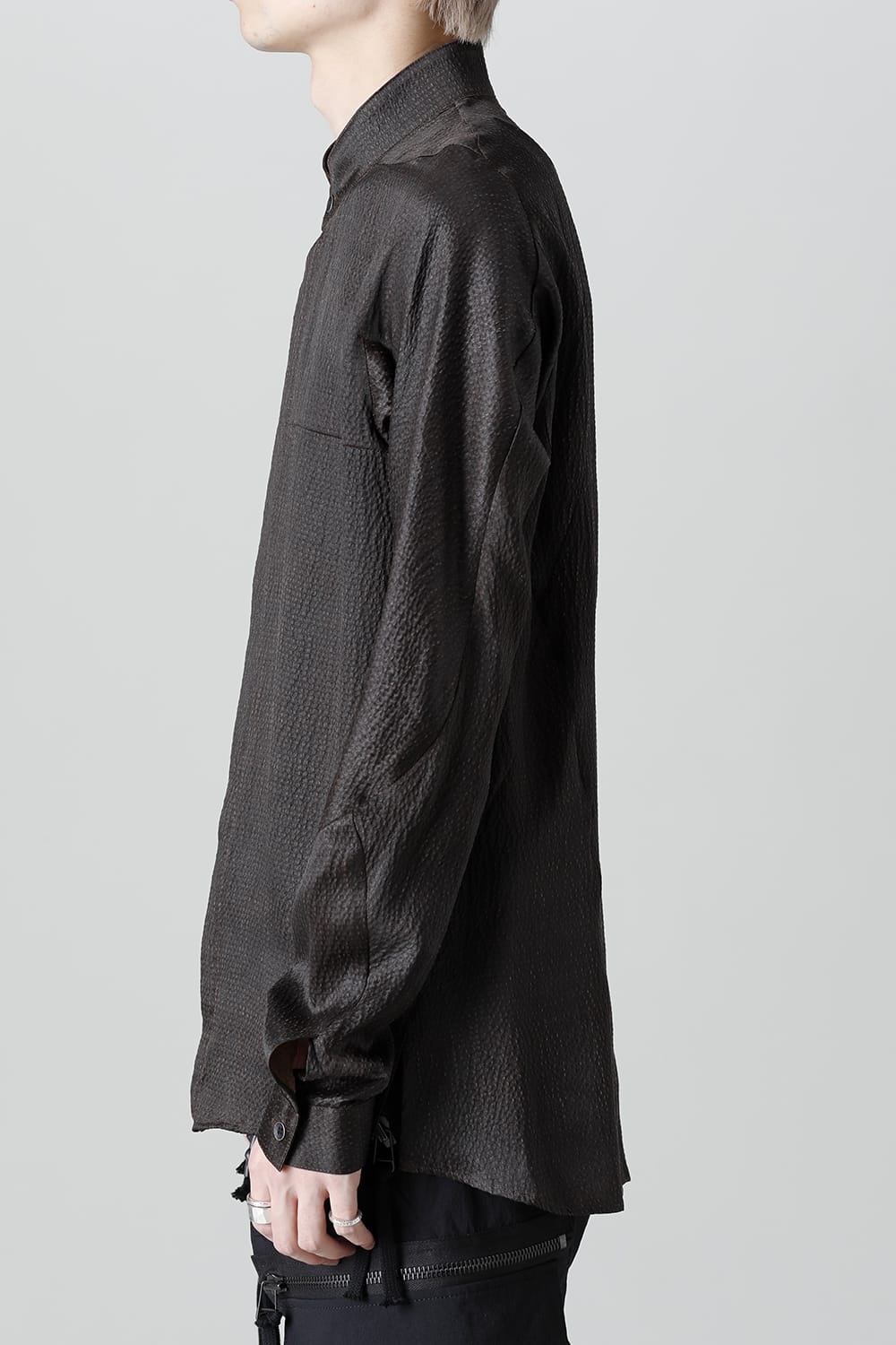 The body and sleeves are made in a one-piece pattern to create a three-dimensional silhouette. Matte black painted metal buttons with shaved edges.