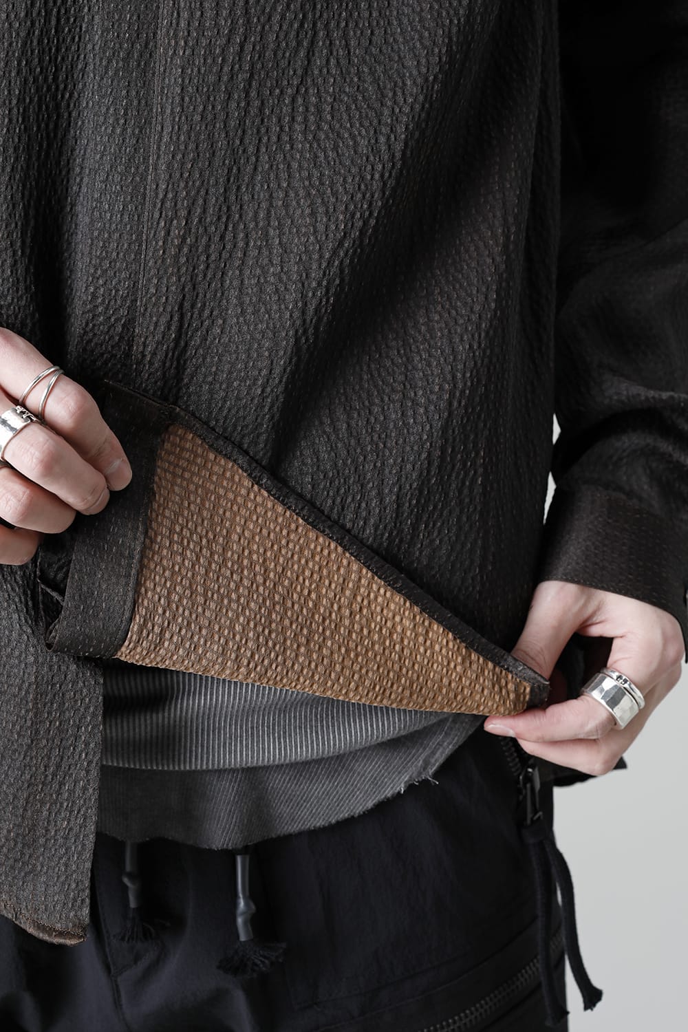 A very smooth football weave silk fabric, dyed with mud. After the dyeing process, the fabric is roasted with iron to increase the density of the mud, resulting in a unique mixture of brown mud and black iron.