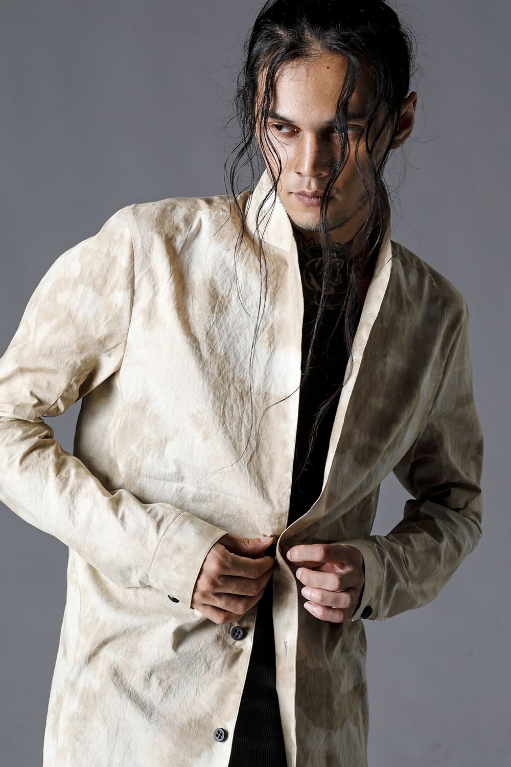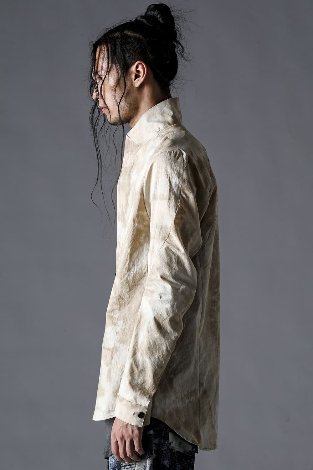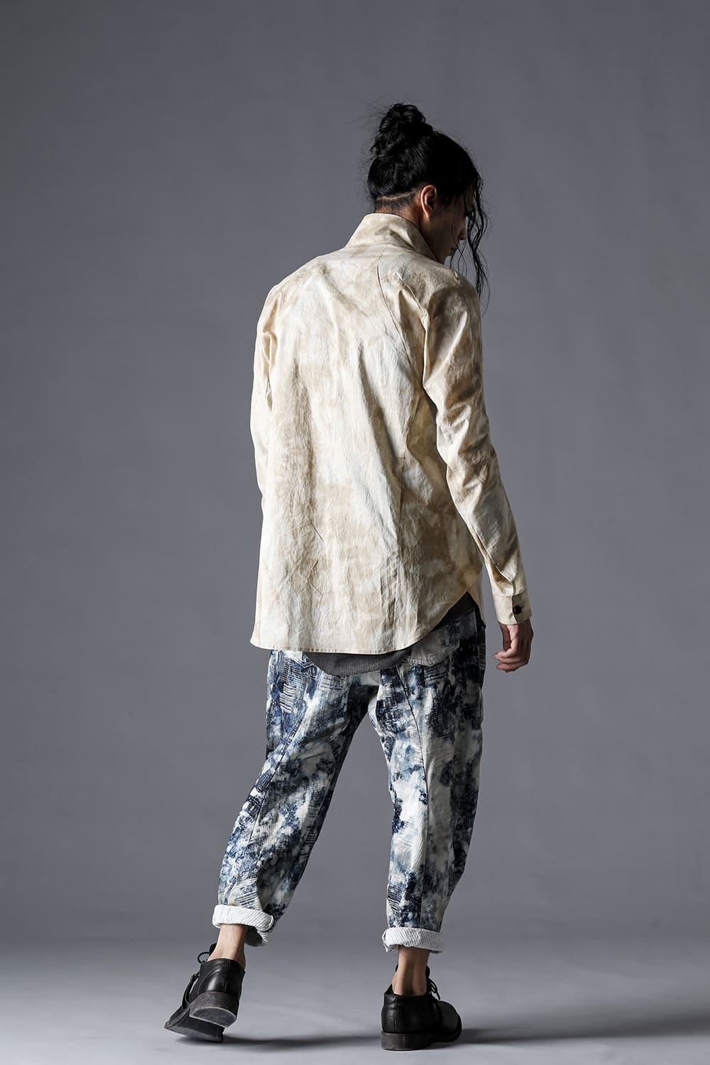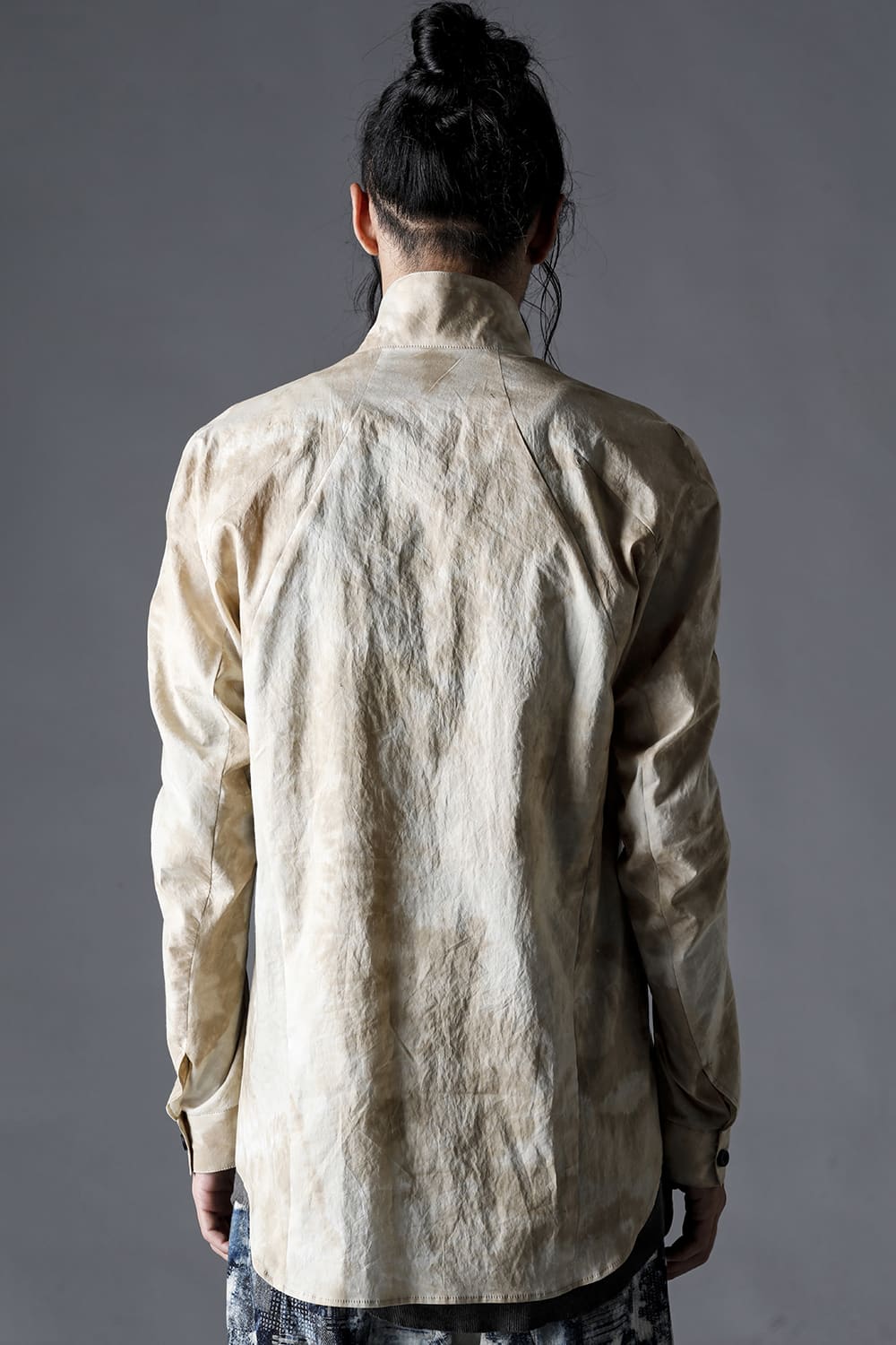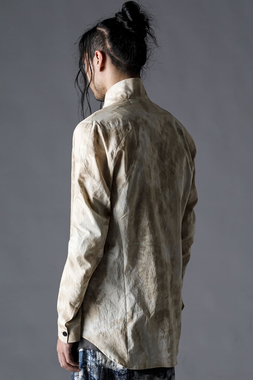 Pattern composed of a one-piece pattern from the back of the body to the sleeves. Handmade cordovan buttons are used for the buttons.