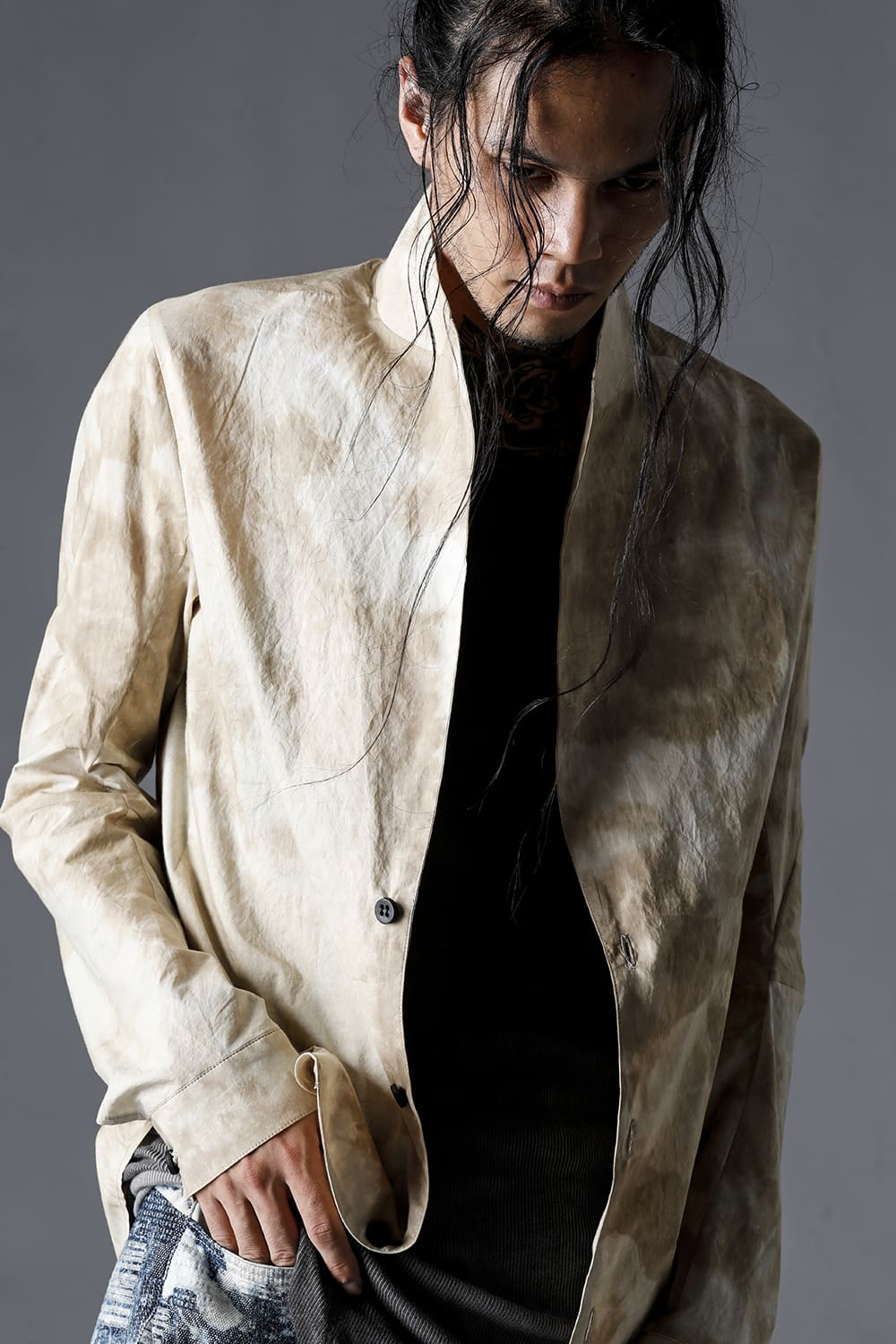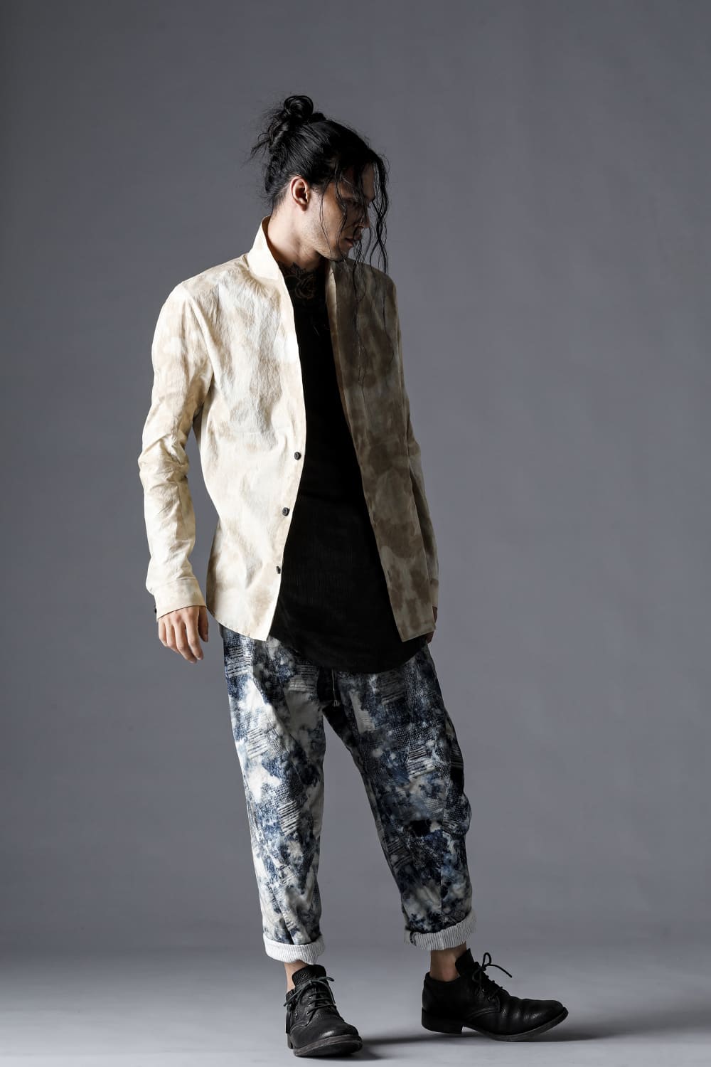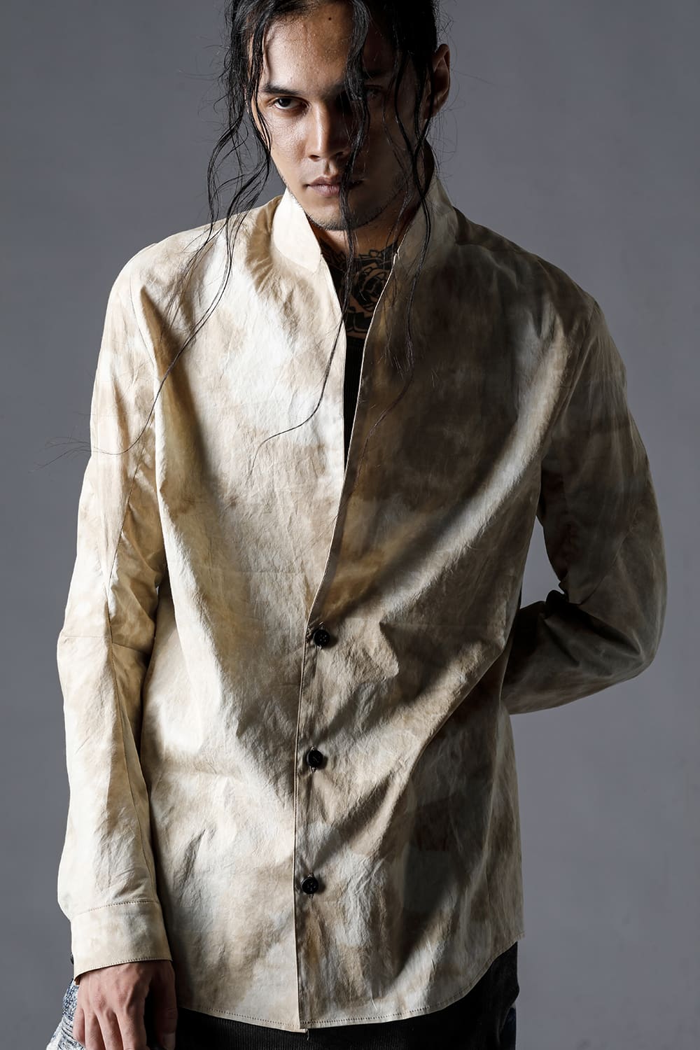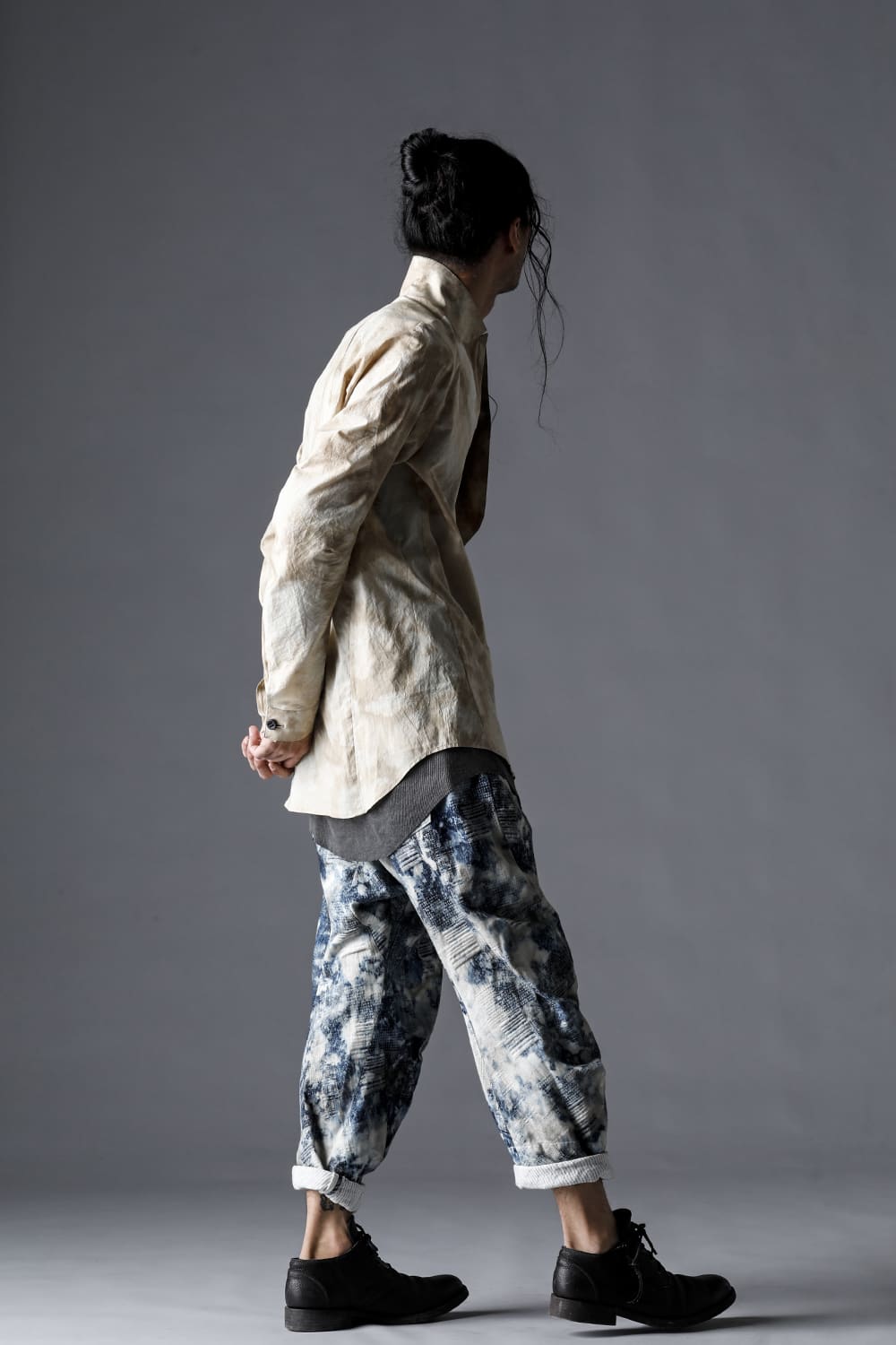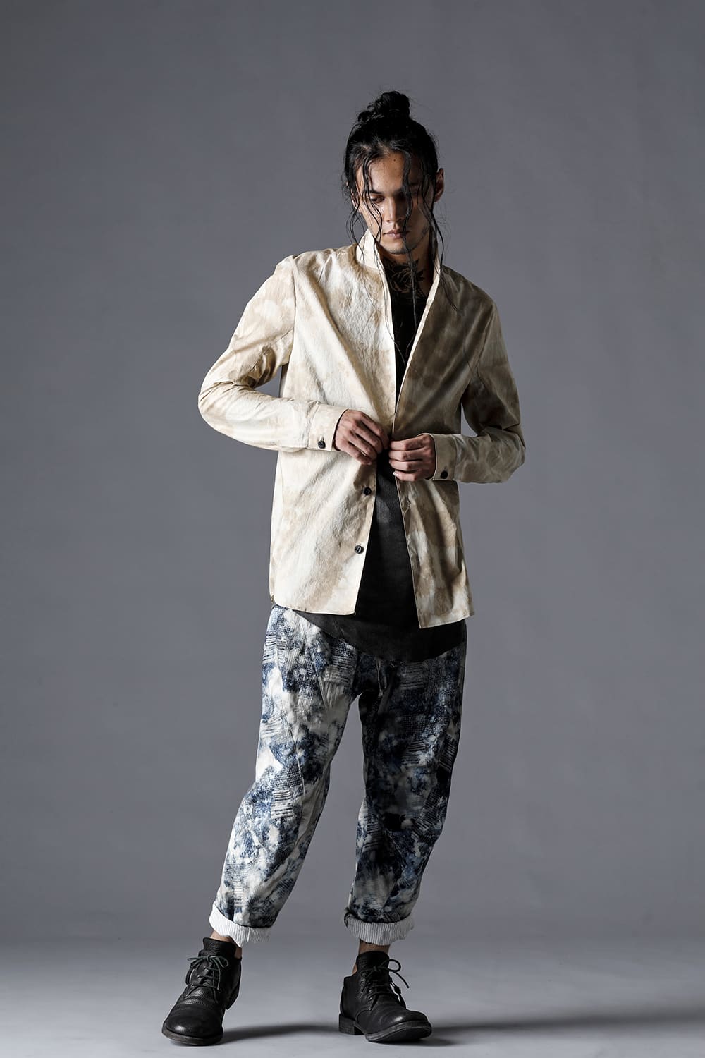 Pattern composed of a one-piece pattern from the back of the body to the sleeves. Handmade cordovan buttons are used for the buttons.