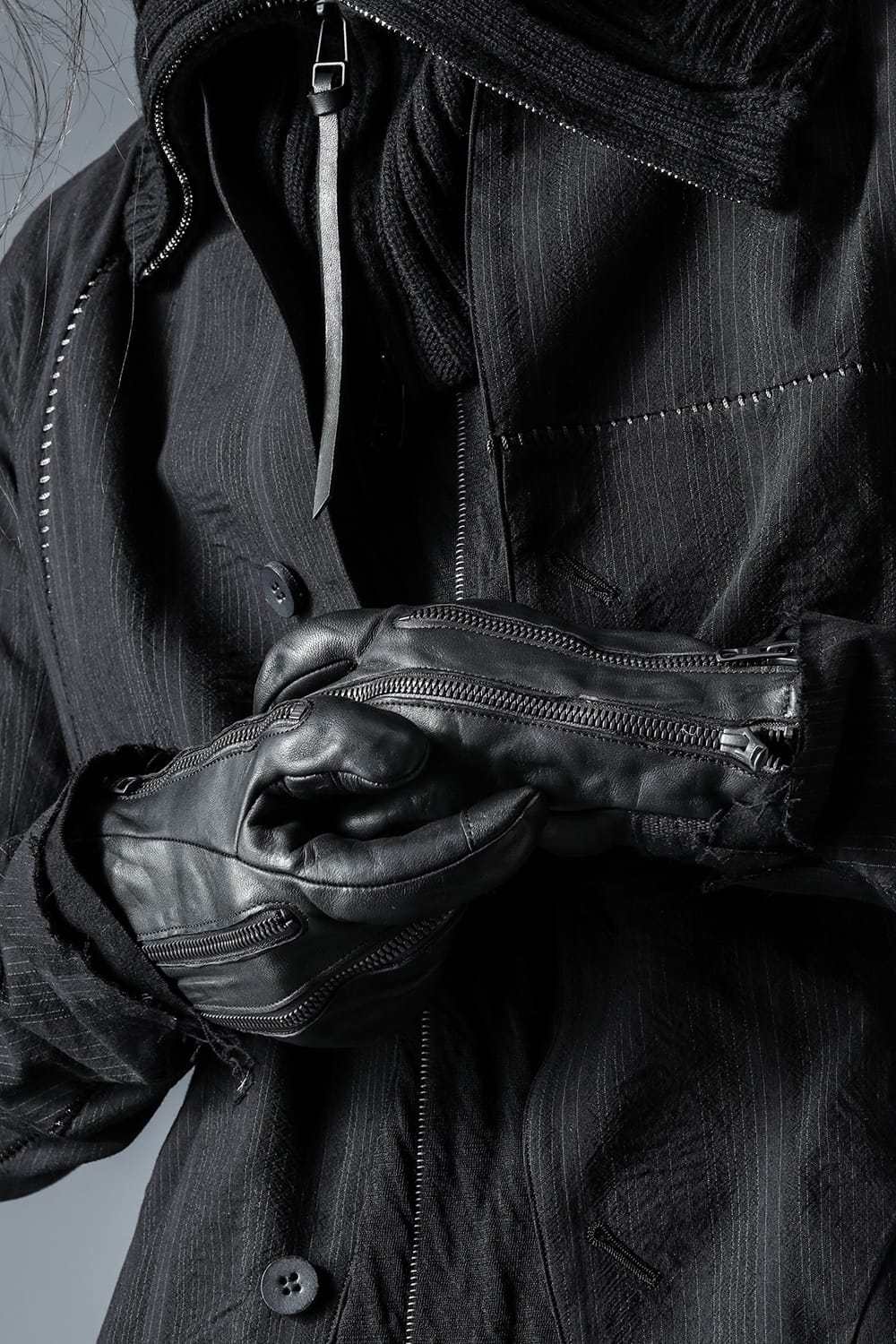 ・This is a collaboration item with NUDE: mm. Three zippers are placed on one hand, and the design and silhouette can be arranged by opening and closing.