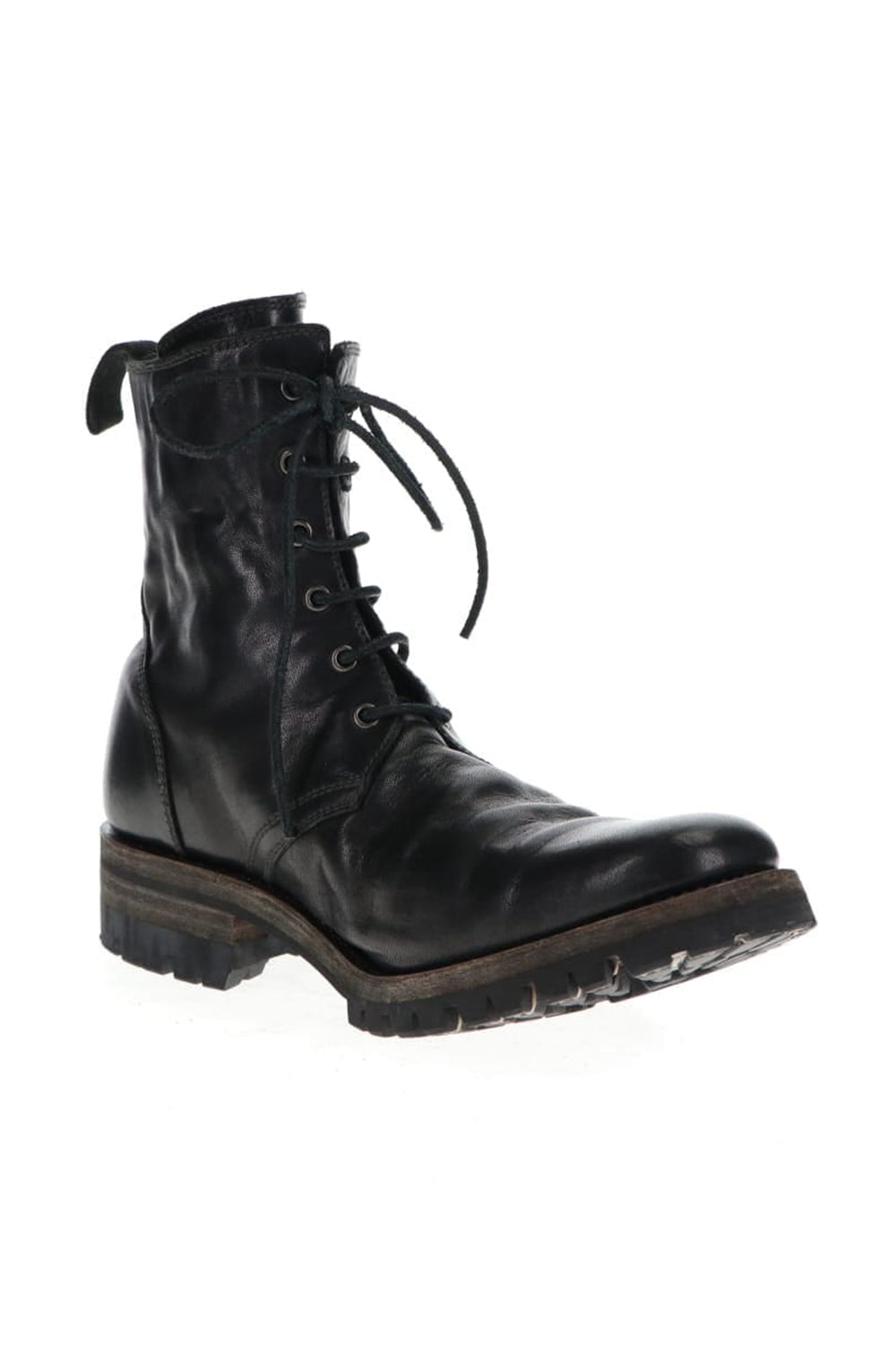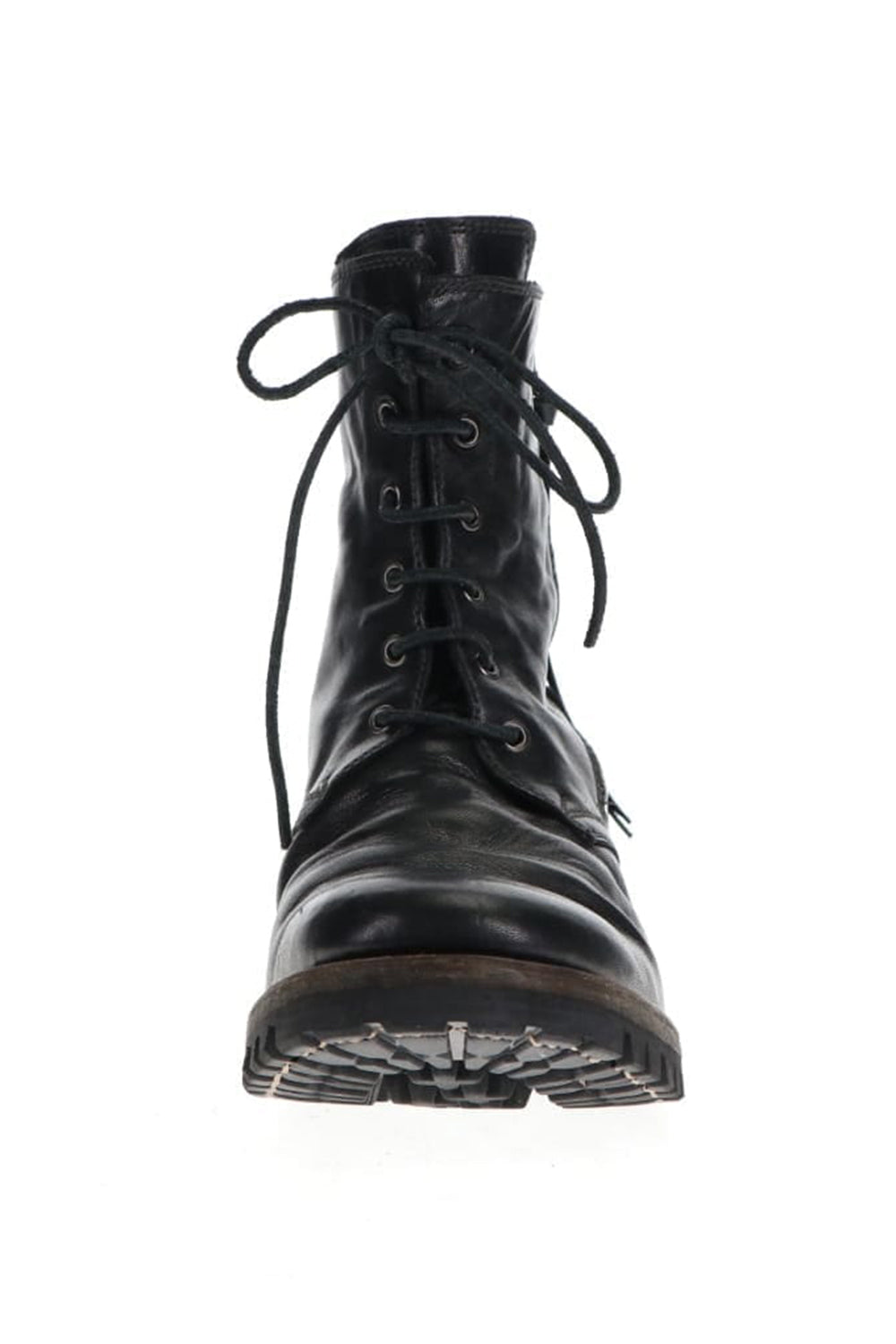 The lace-up boots are made of 1.5mm full vegetable-tanned horse leather, with a flat and smooth round toe, a voluminous waist and a slender ankle-length shaft.