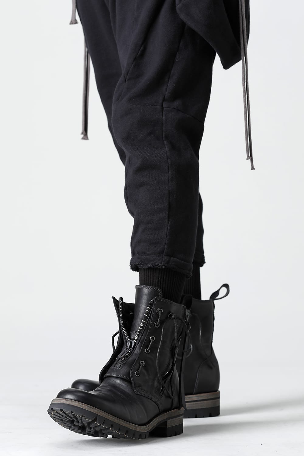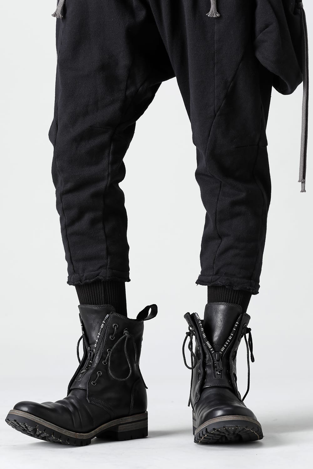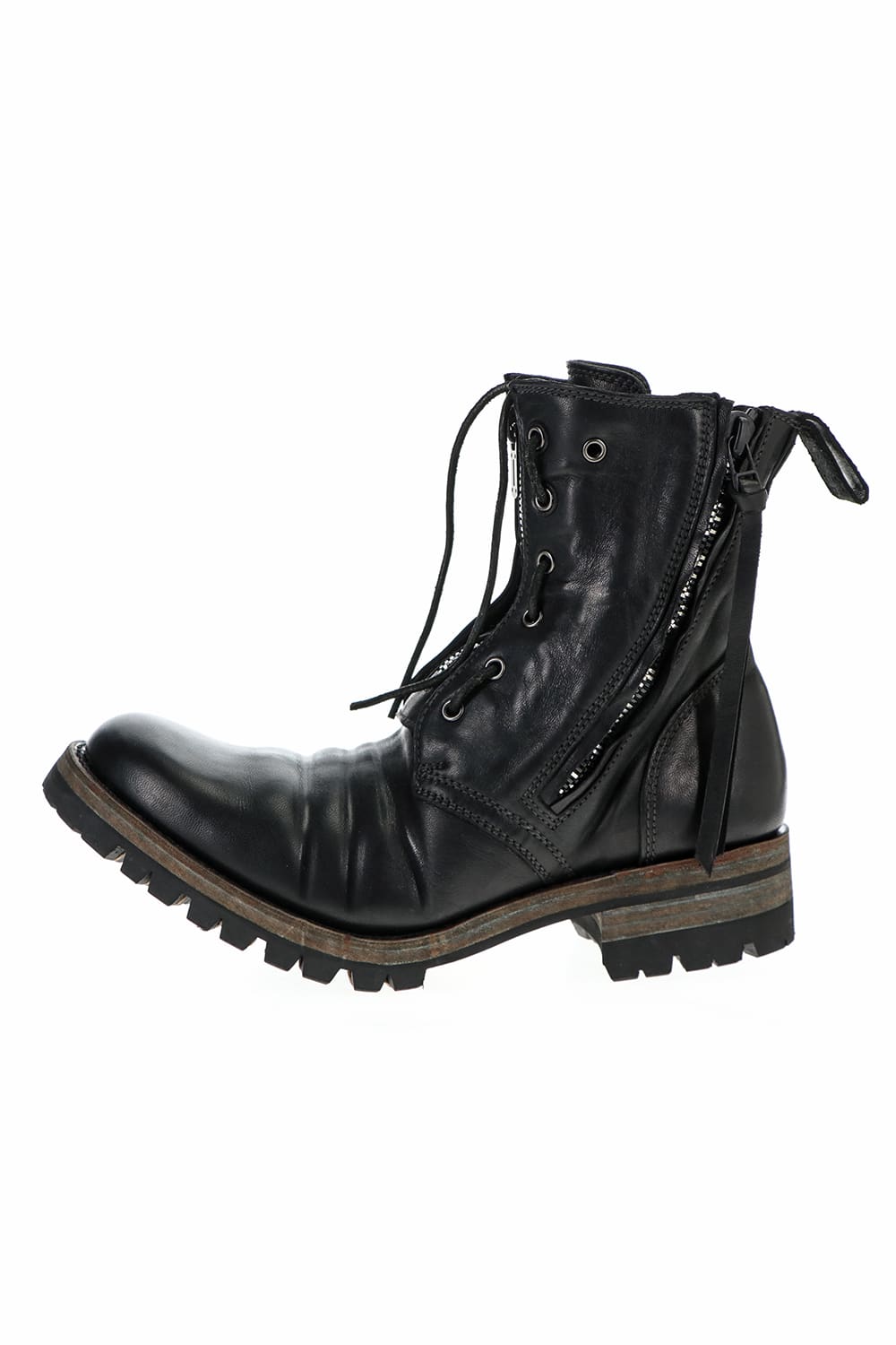 It is made of horse leather tanned with 1.5 mm thick full vegetable tannin. The attachment of Fireman boots is attached to the front, and you can smoothly put on and take off by opening and closing the zipper. It is a lace-up boots with flat and smooth round toe, voluminous width to ankle length and thin shaft, and a sharp silhouette.