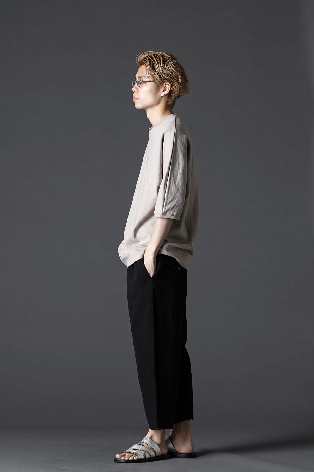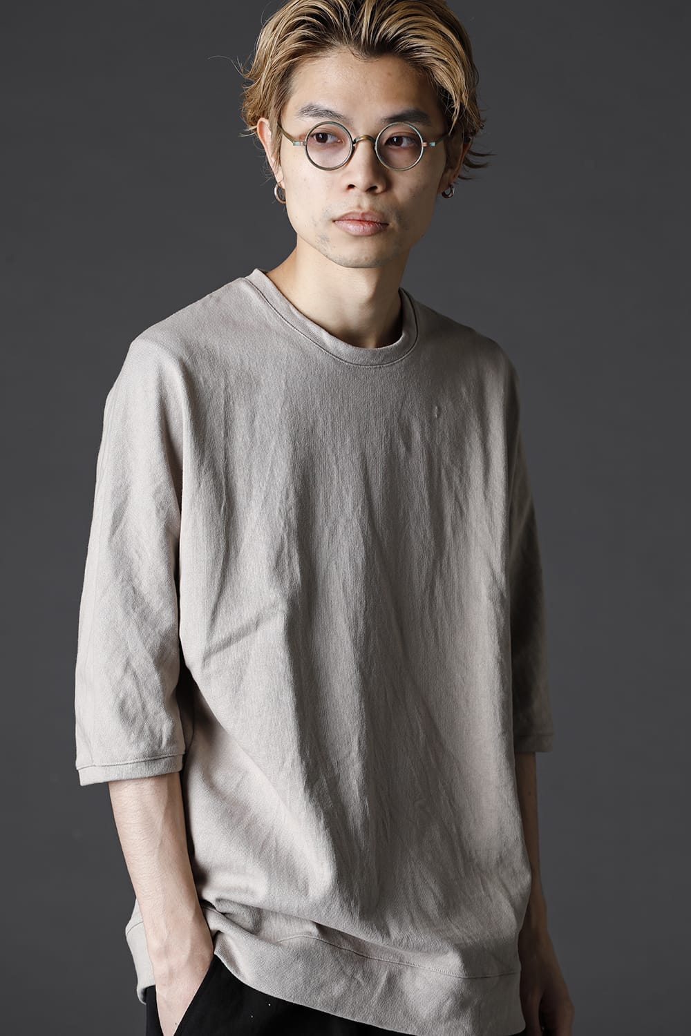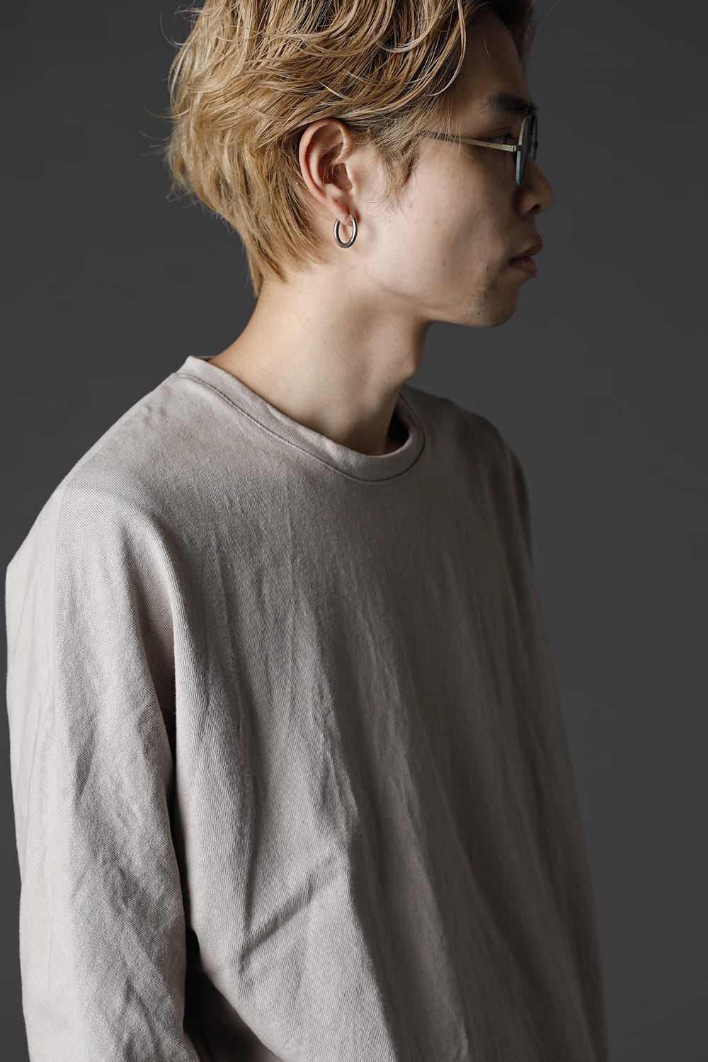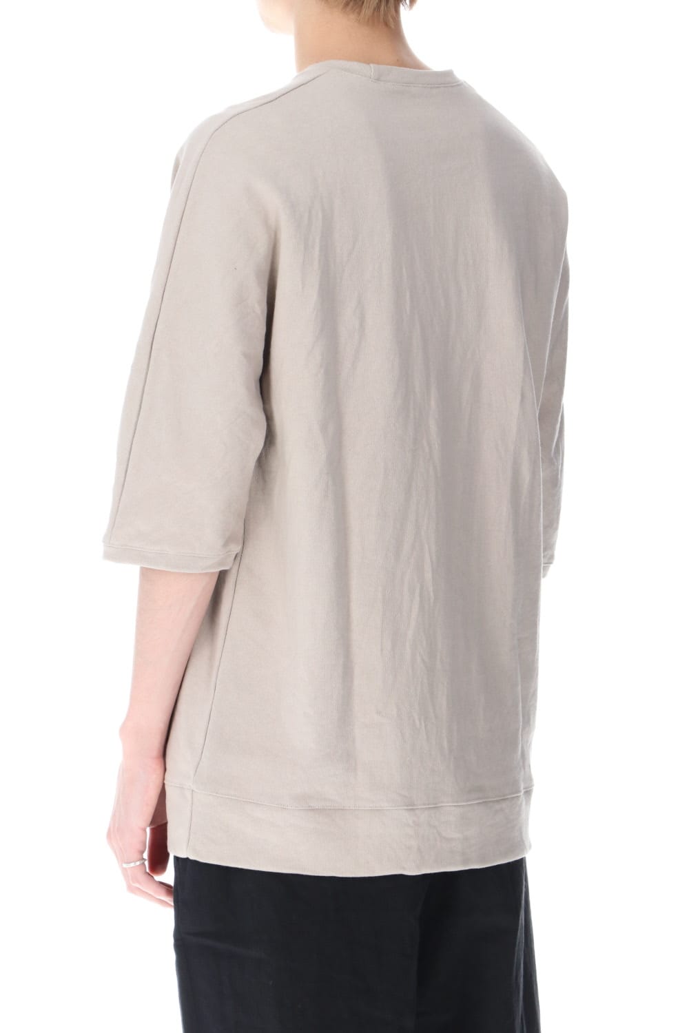 Dolman sleeve cut sew with a boxy silhouette. In addition to the loose sleeves, the width of the body is wide for a relaxed feel. The color is gray-beige which is easy to coordinate. The material is a medium gauge from the ware standard jersey fabric. The box silhouette has just the right amount of tension, so it can be worn as a top by itself. The neck, sleeves, and hem are all made with a binder.