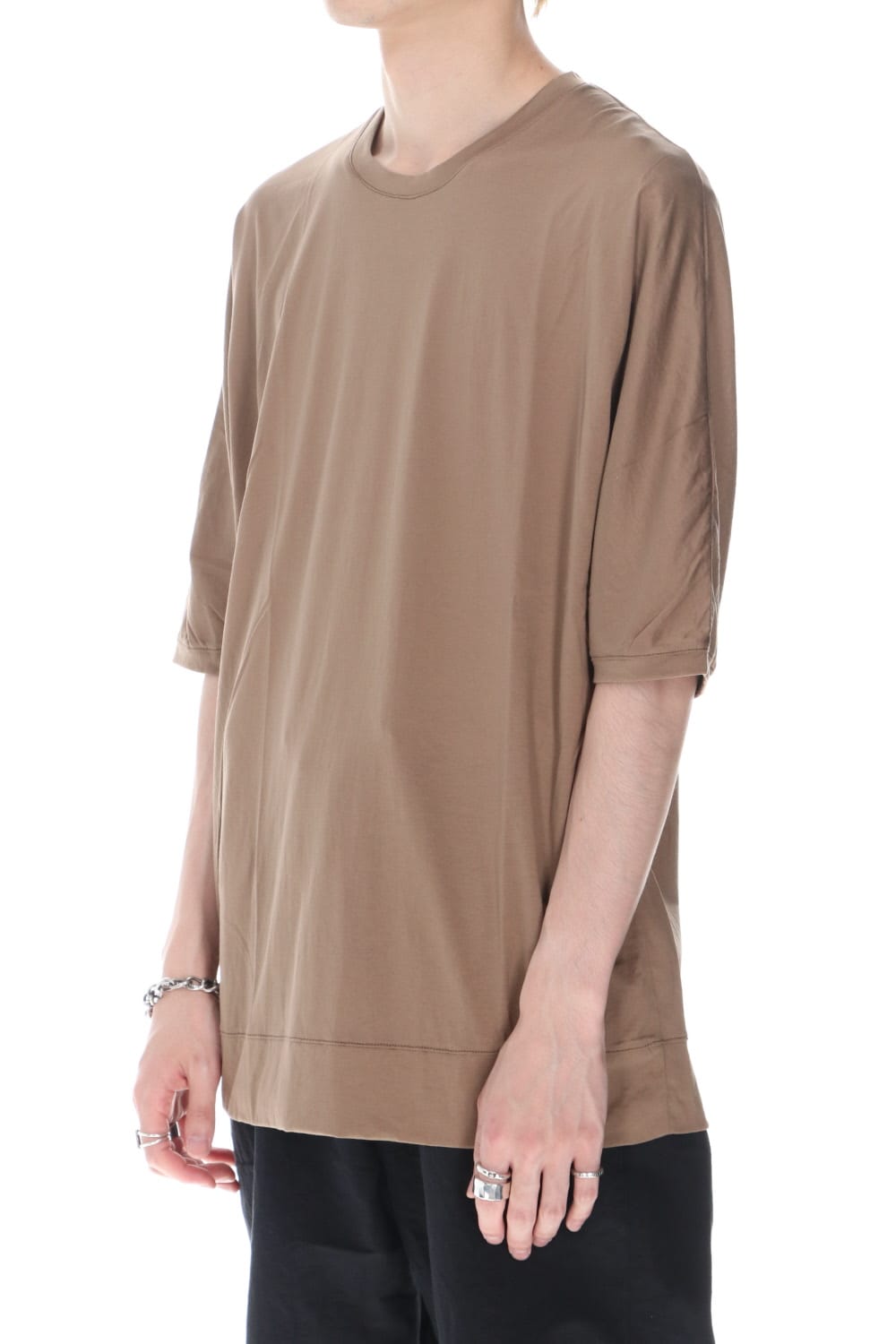 Giza Cotton Jersey Half Sleeve Dolman T-Shirt This dolman sleeve cut sew is made of the premium fabric selected from among GIZA's king of cotton. GIZA cotton is said to be super long cotton, a rare breed with very long fibers. It has a supple texture, light and durable. This fabric is in the GIZA cotton, and it has a thickness and luster like silk which is different from the so-called smoothness. The details are loose sleeves and a pattern with a wide body. The drape with a shadow is created by combining with the texture of the fabric. The relaxed silhouette has a very elegant look. The sleeves and hems are all made with a binder, and since it gives a moderate volume even when worn alone, this cut sew is very useful as an outer to create a good overall balance. The color is a calm dark beige that brings out the voluptuous feel of the fabric.