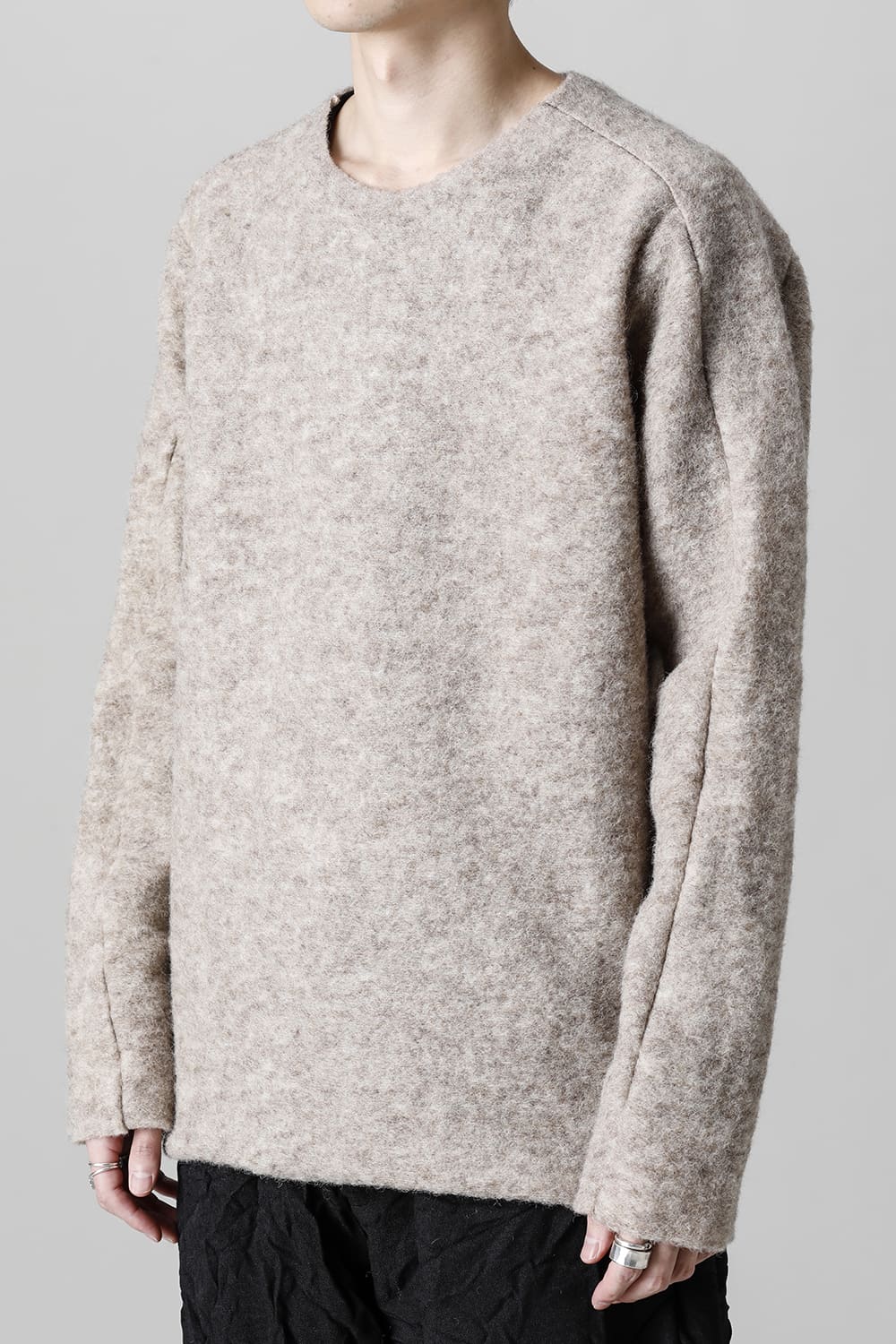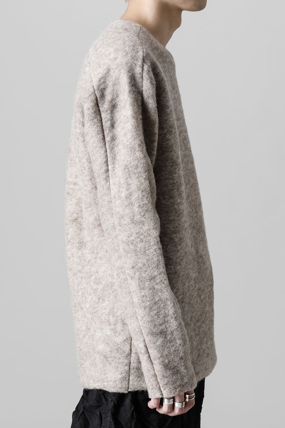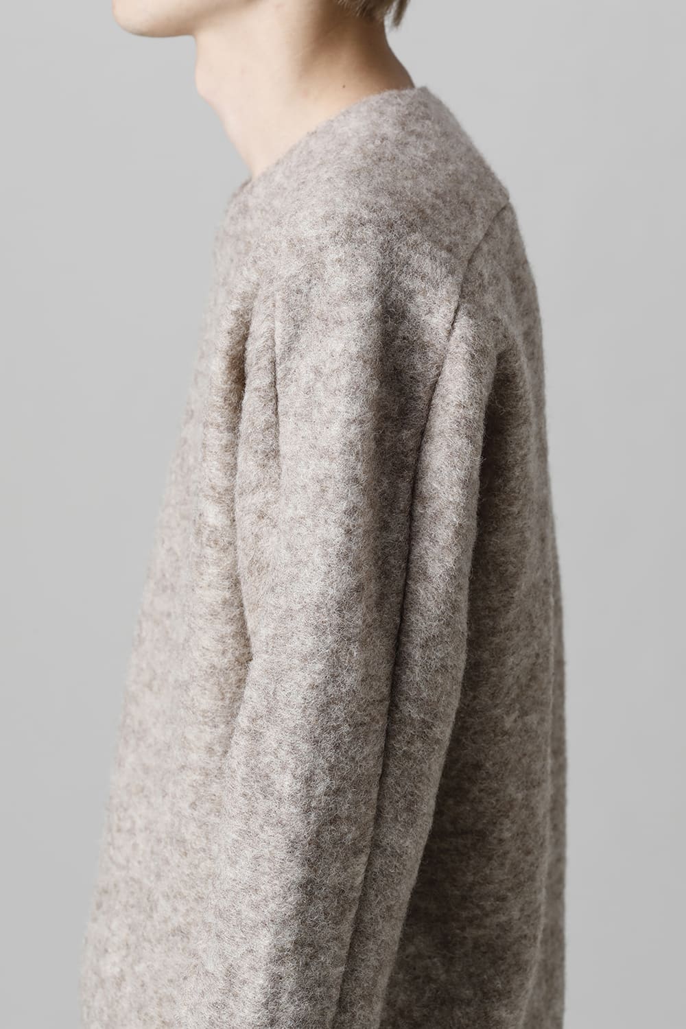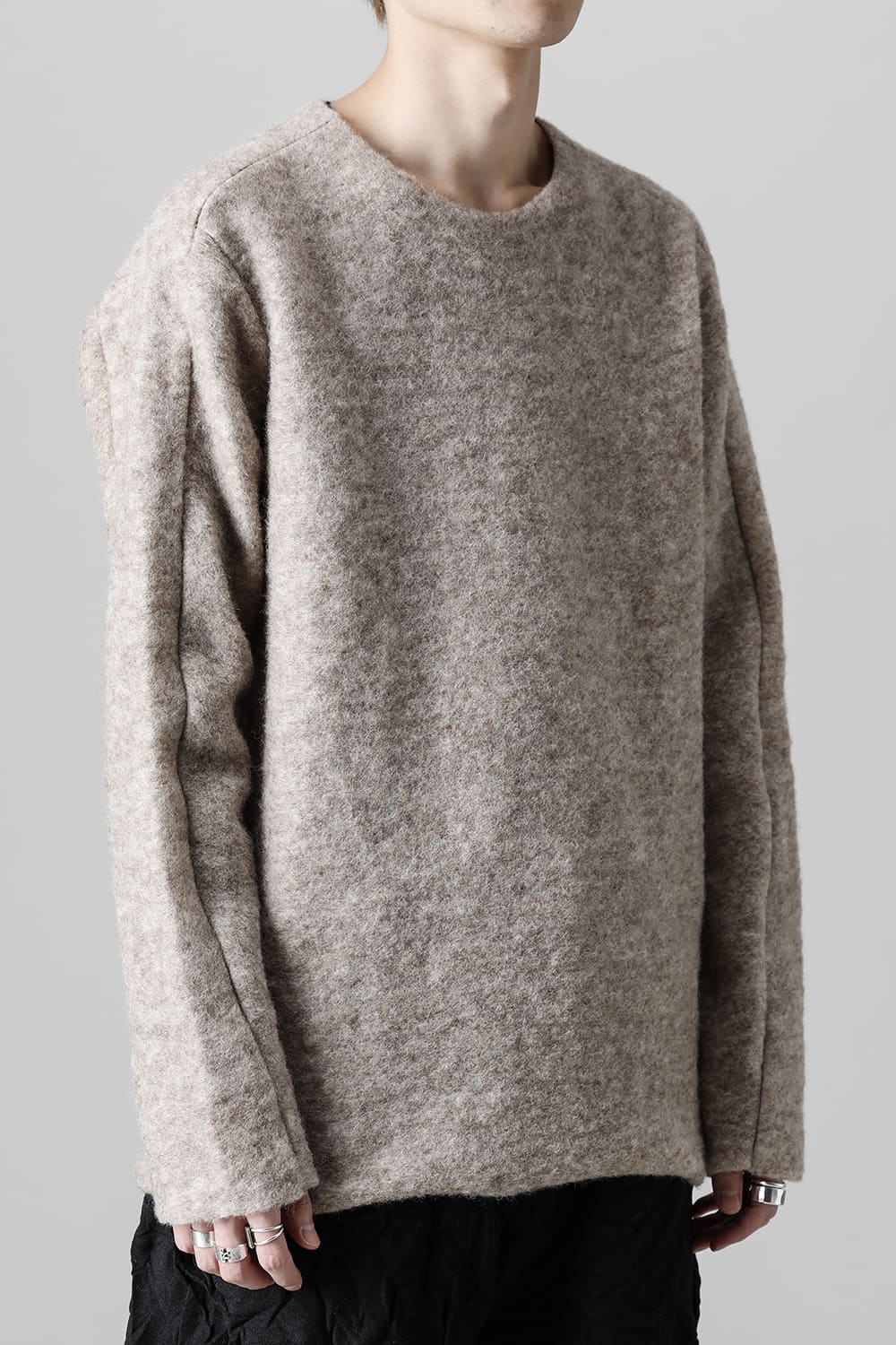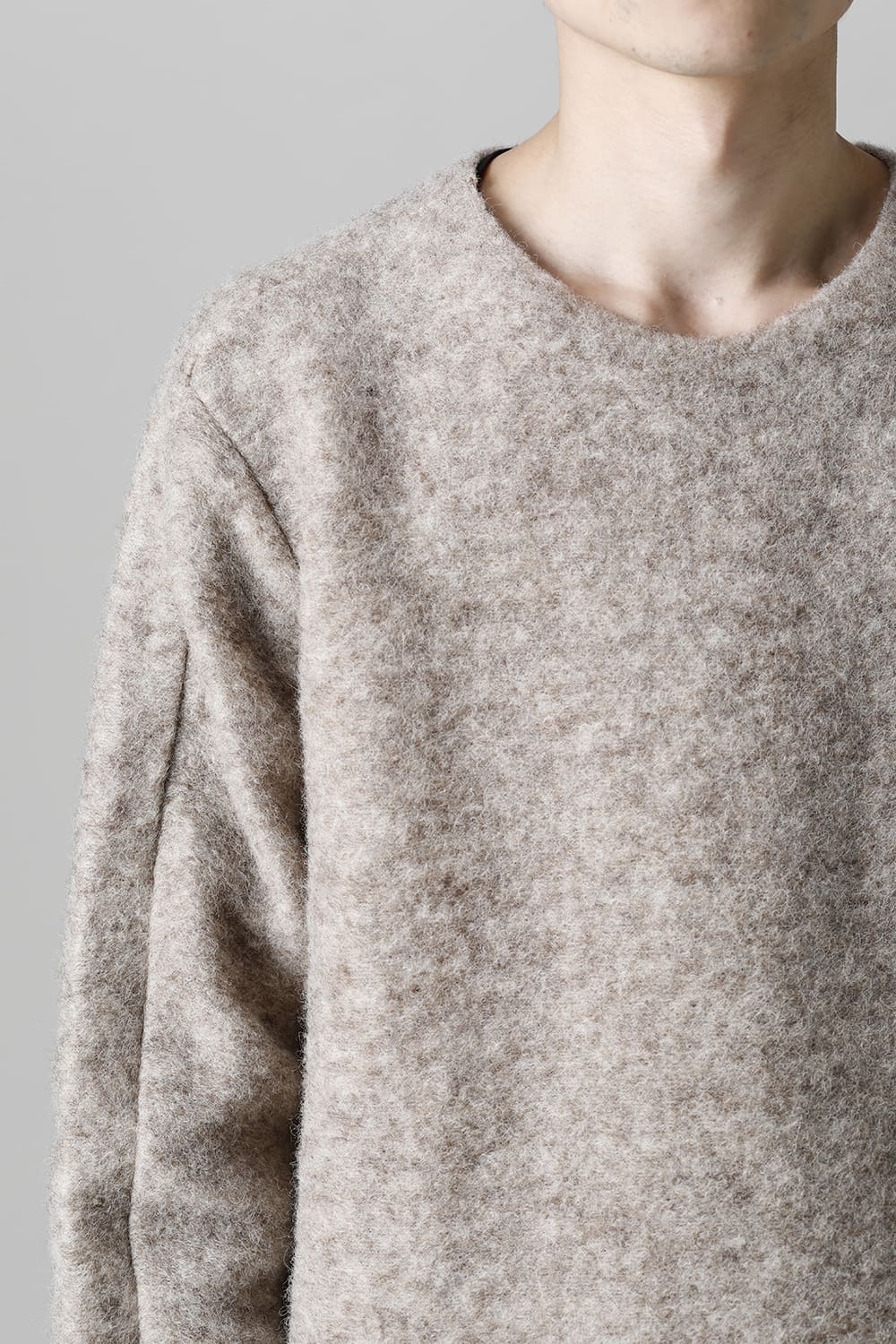 Ware's standard crew neck knit. The minimalist design without any peculiarities makes it a useful piece regardless of coordination. The ingenious cutting from the shoulders to the arms creates a straight silhouette without any bulk, and the fit is excellent when layered with outerwear. The neck, sleeve ends, and hem are all cut off. The material is an Italian wool blend knit. The underside has short pile and a smooth feel. It is very light and easy to wear like a fleece. Two colors are available: basic pluck and mixed beige with brown and light beige.