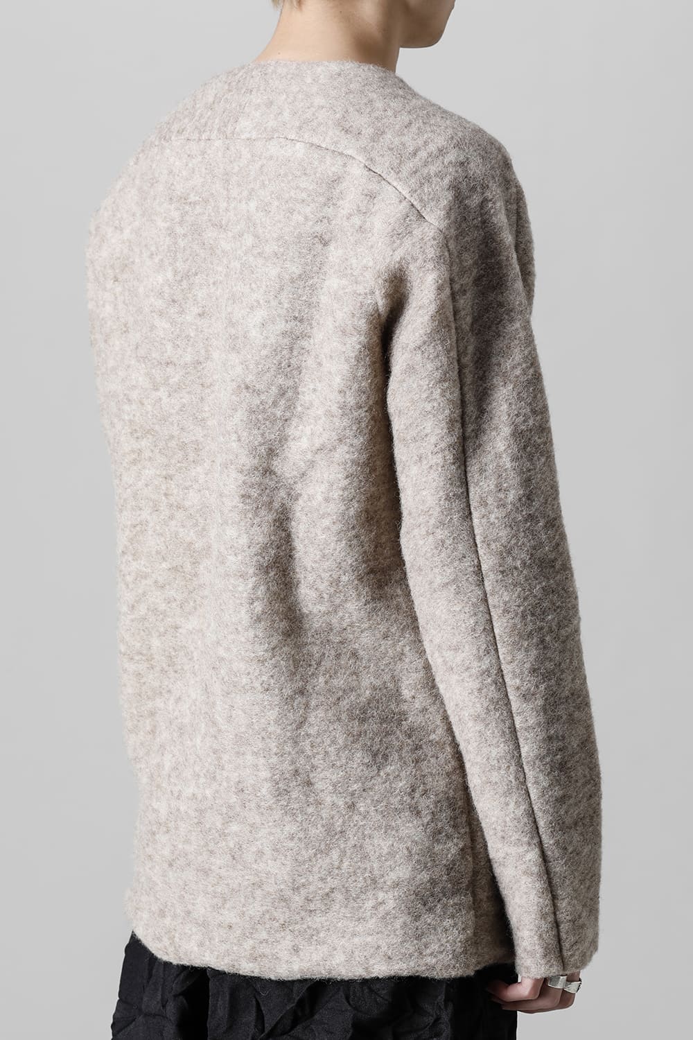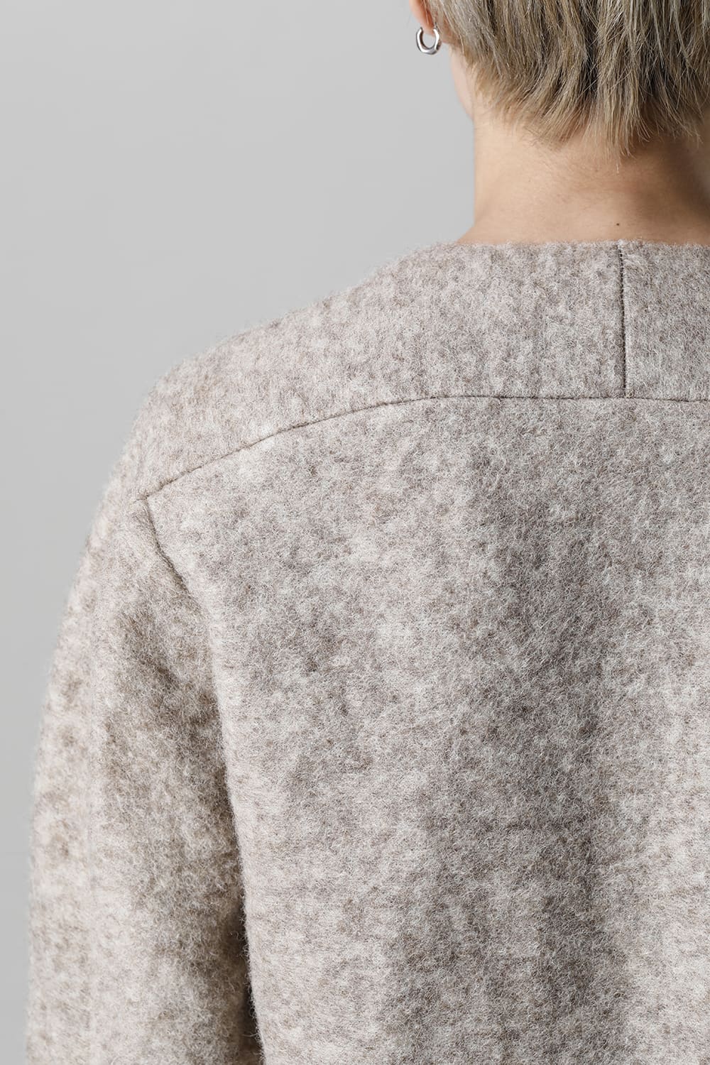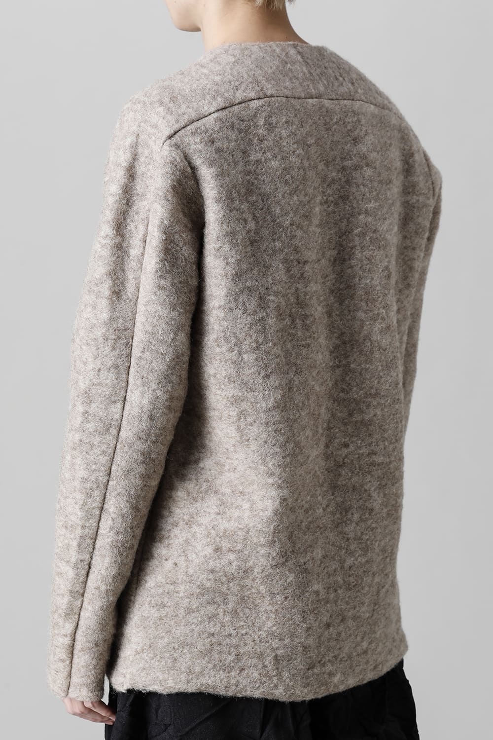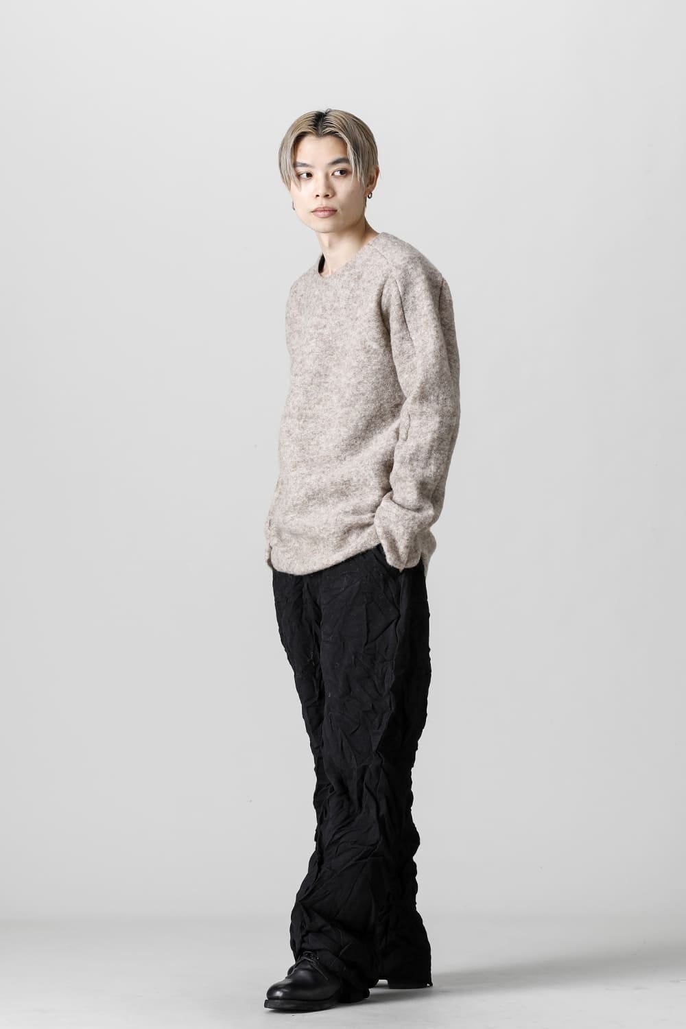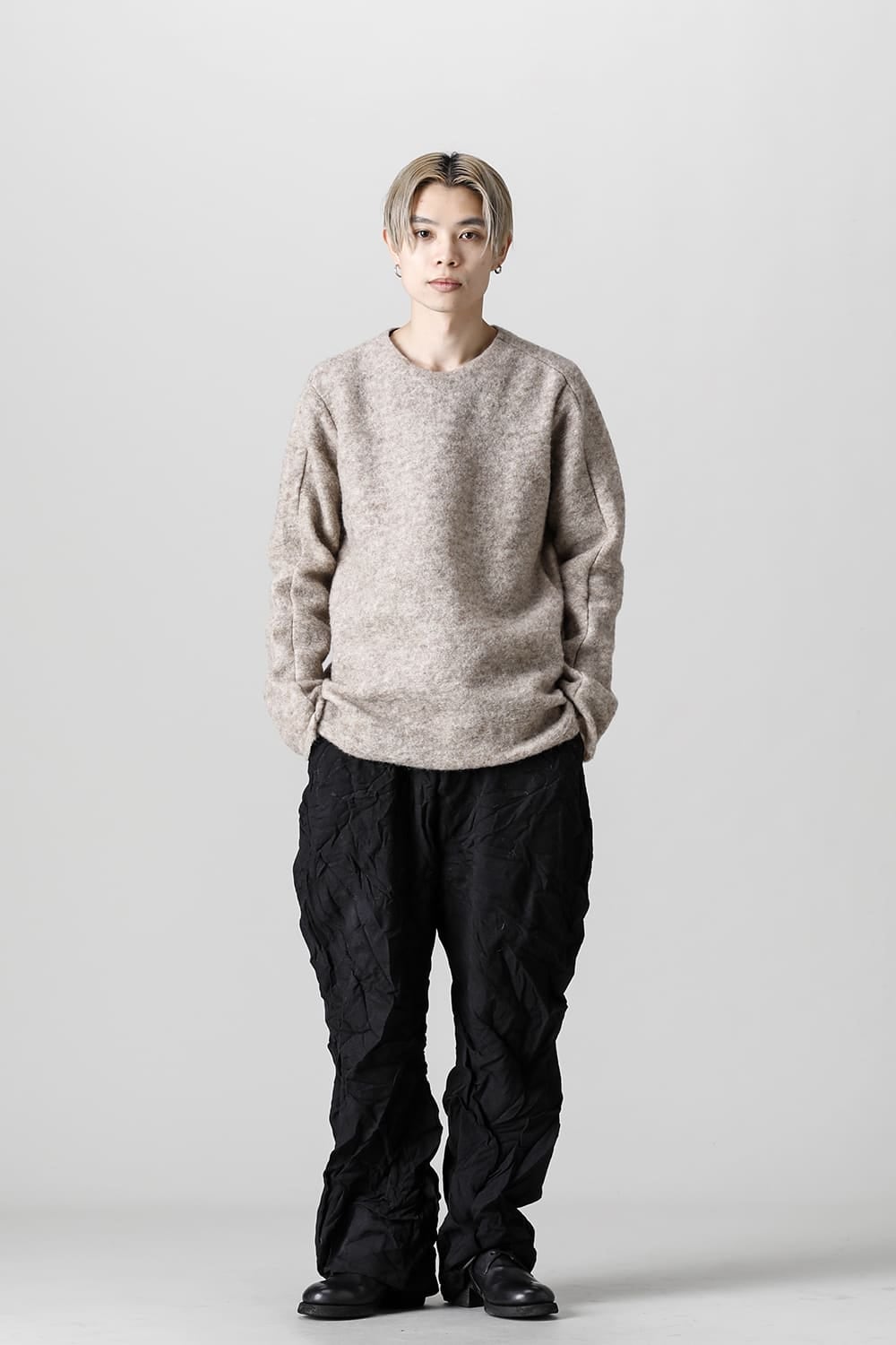 Ware's standard crew neck knit. The minimalist design without any peculiarities makes it a useful piece regardless of coordination. The ingenious cutting from the shoulders to the arms creates a straight silhouette without any bulk, and the fit is excellent when layered with outerwear. The neck, sleeve ends, and hem are all cut off. The material is an Italian wool blend knit. The underside has short pile and a smooth feel. It is very light and easy to wear like a fleece. Two colors are available: basic pluck and mixed beige with brown and light beige.