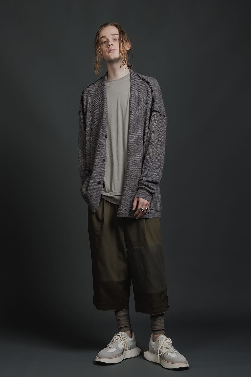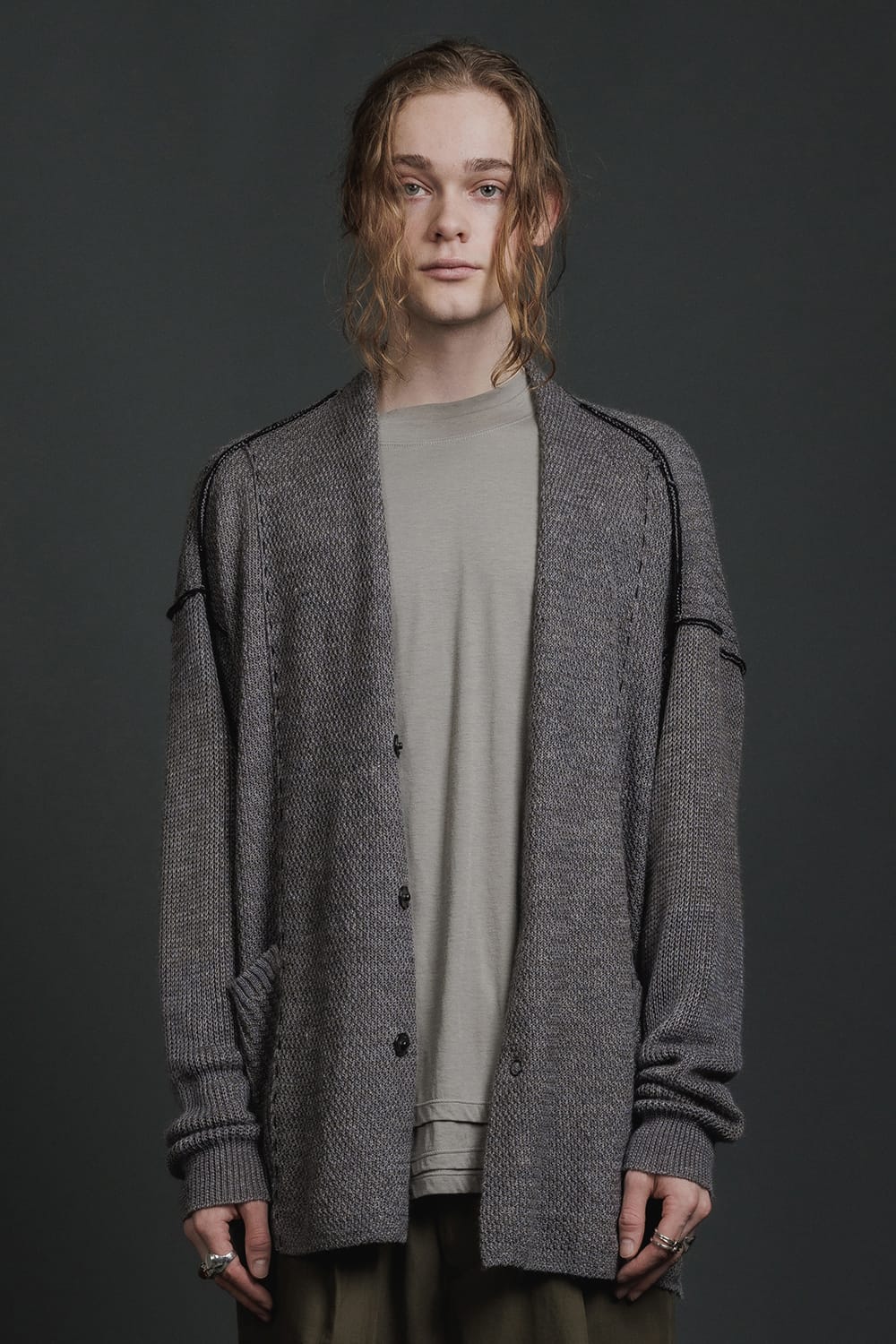 ・Cardigan combining multiple knitting fabrics such as moss and thermal.