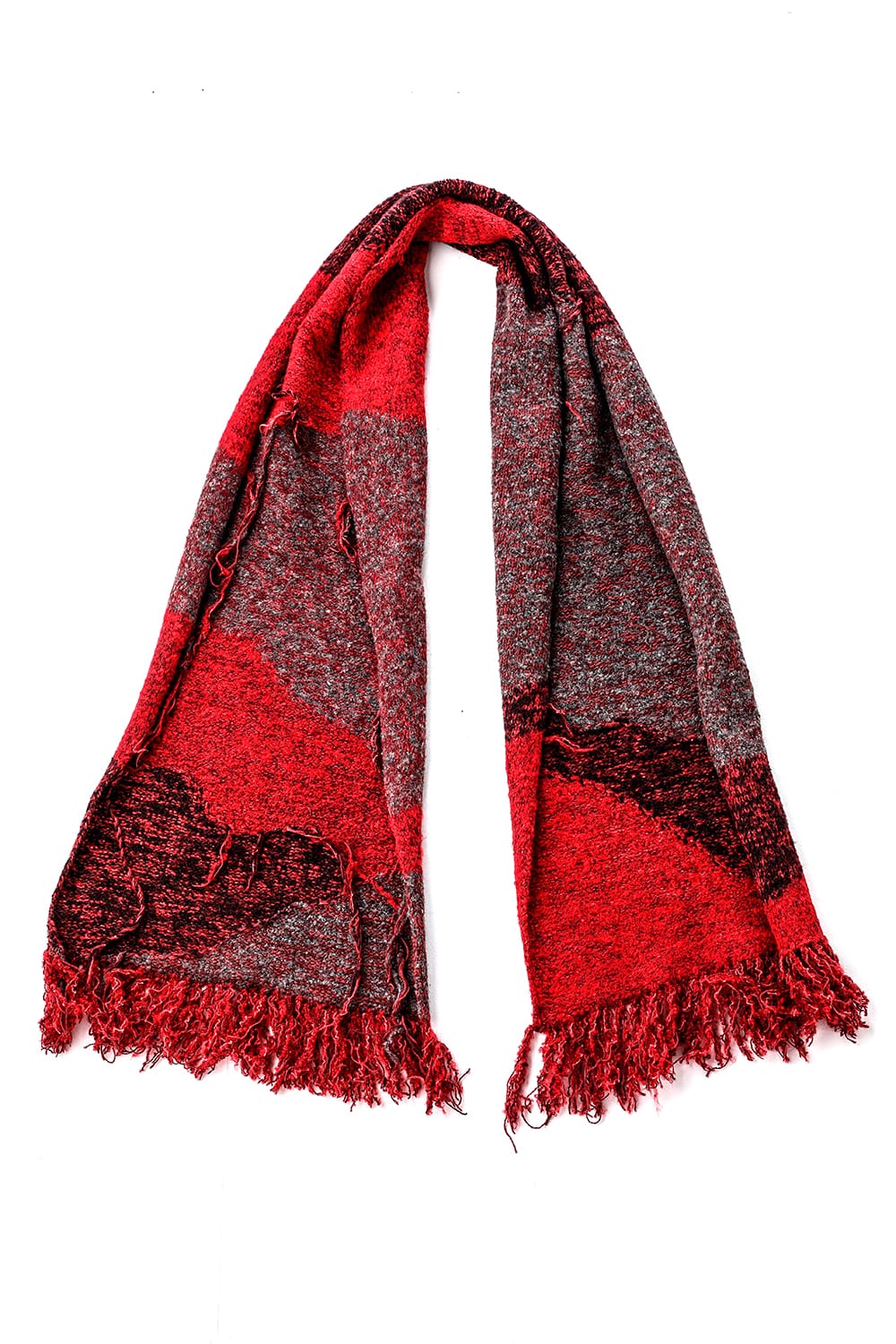 A voluminous scarf knitted by combining multiple different materials and shapes of yarn.