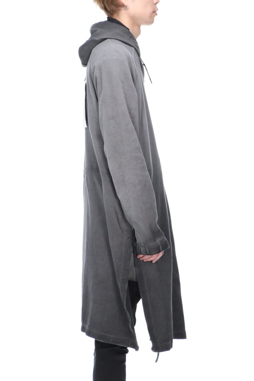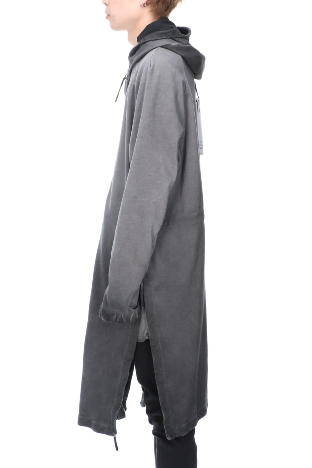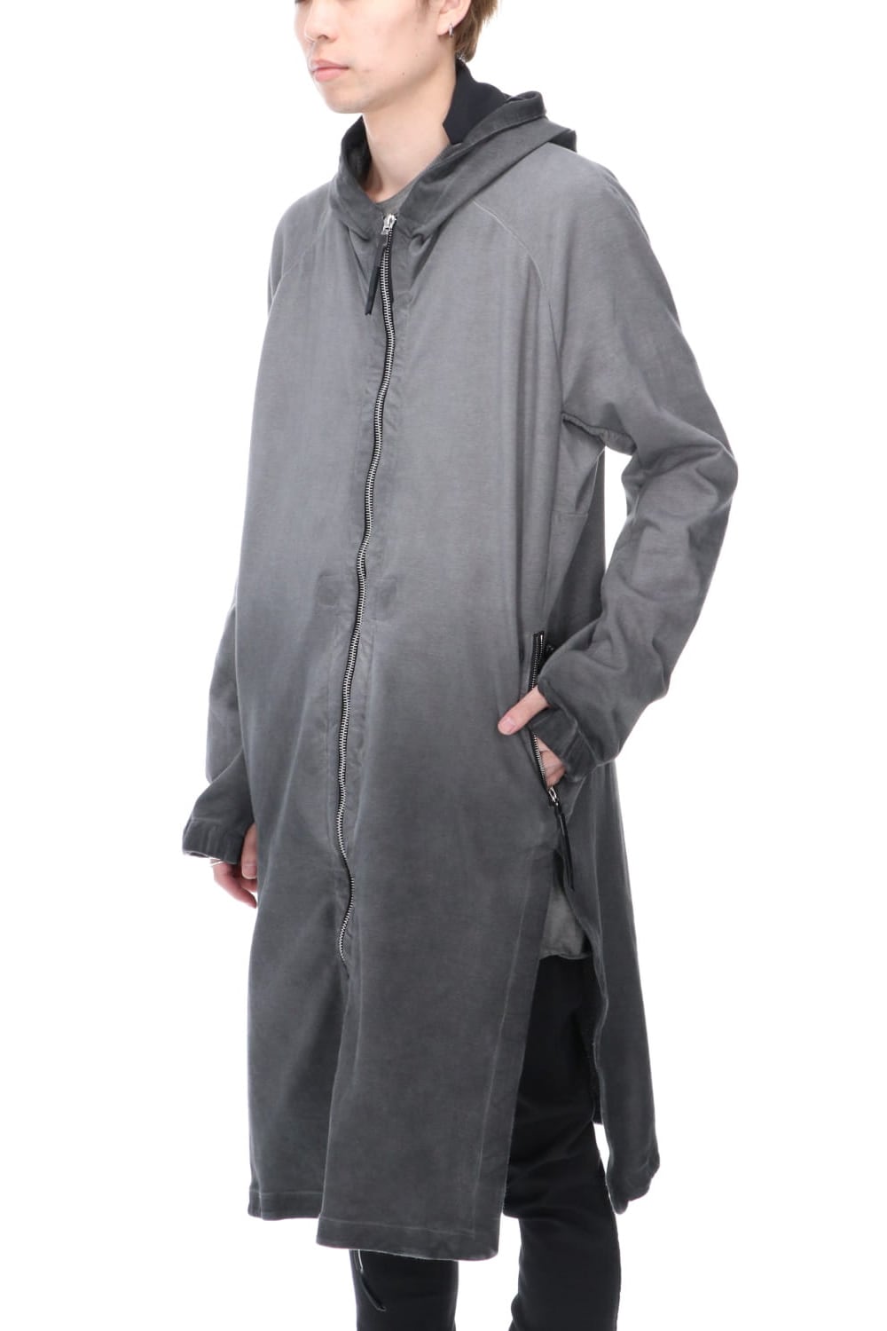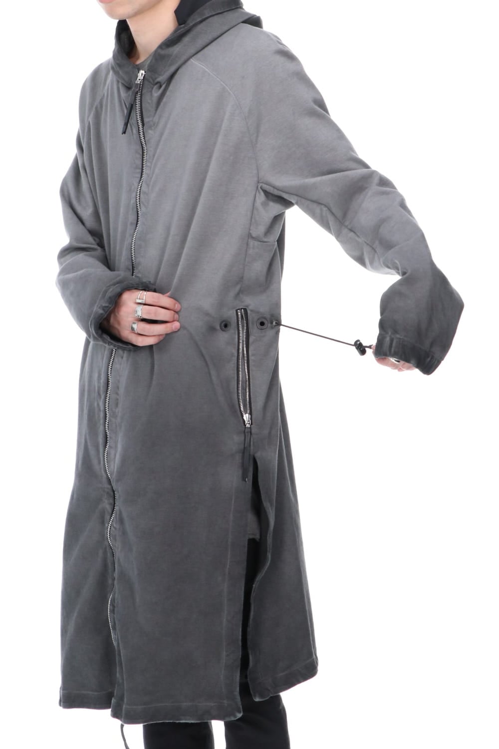 The silhouette can be narrowed by the large slit and the draw cord that is on the waist.