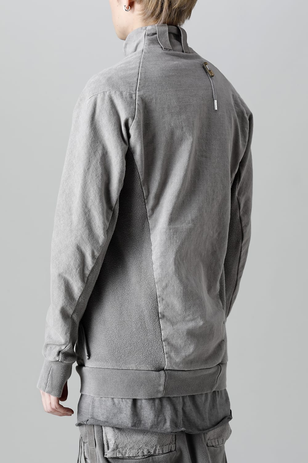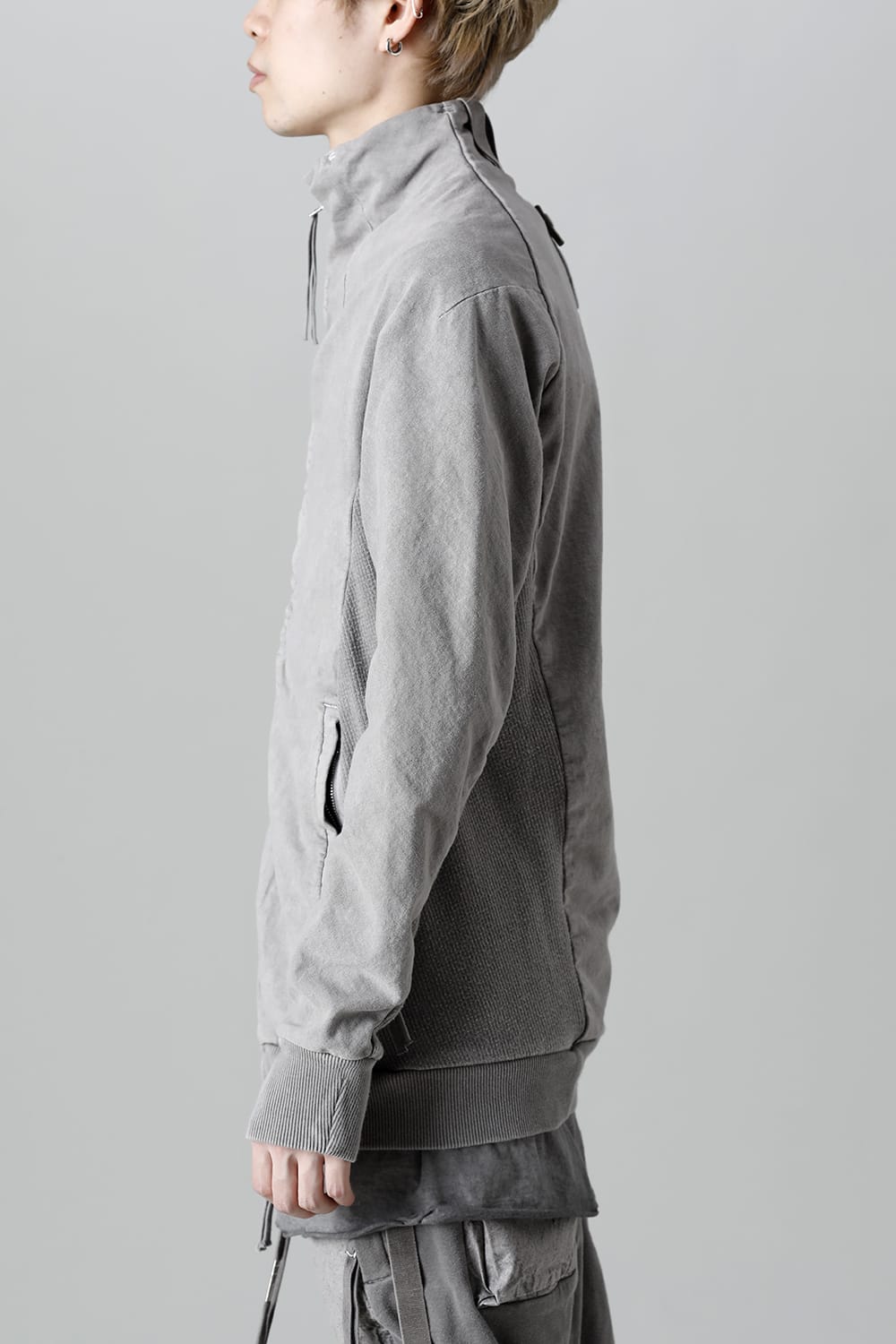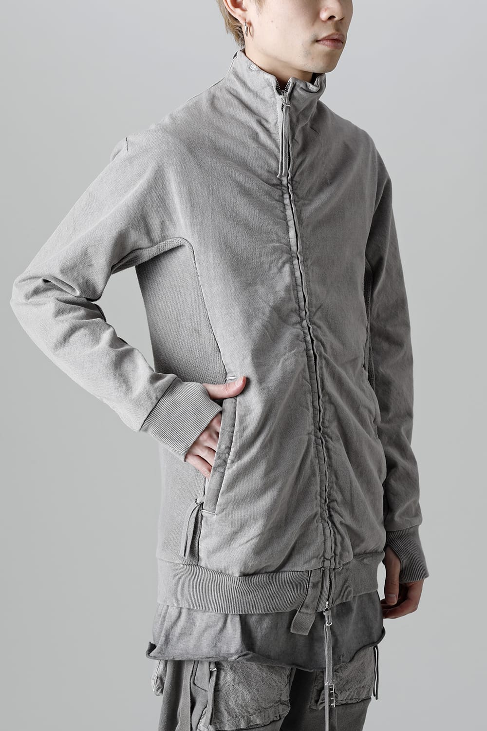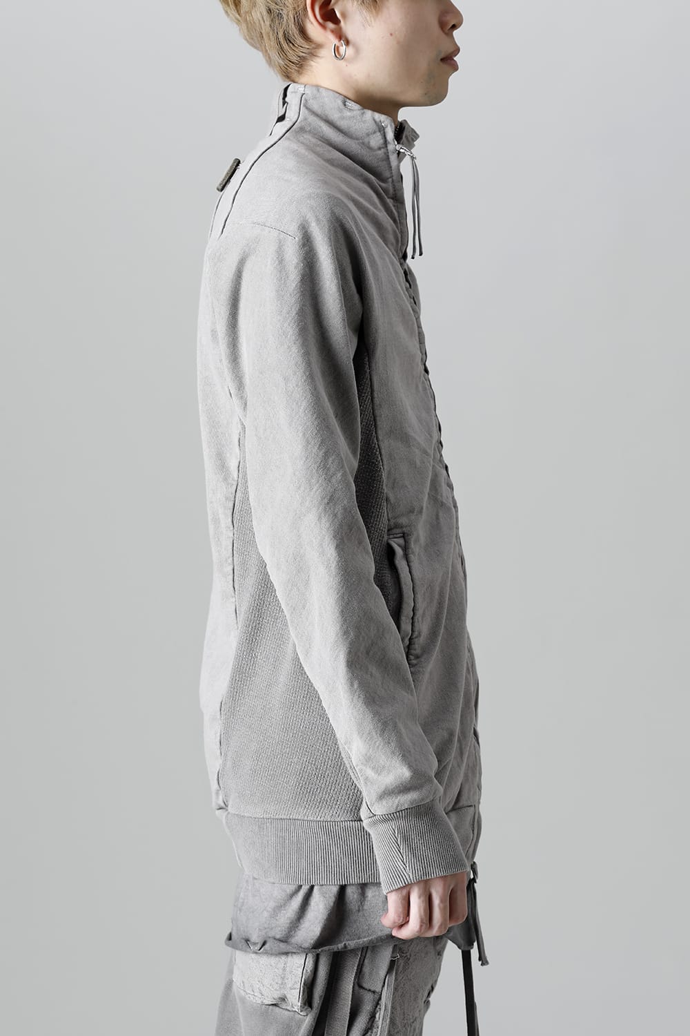 This high neck blouson "ZIPPER1" has been released for a long time as one of the representative items of the brand. With sweat as the main item, the sides are made of thick ribbed teleco fabric. The loose silhouette creates a rough look that can be worn casually. The look of the material and the fine details of each piece create a unique world view that makes you feel a certain weight. Combining the details of street culture and military items, with a no-waste design, this item has a delicate balance of originality and versatility with fine details.
