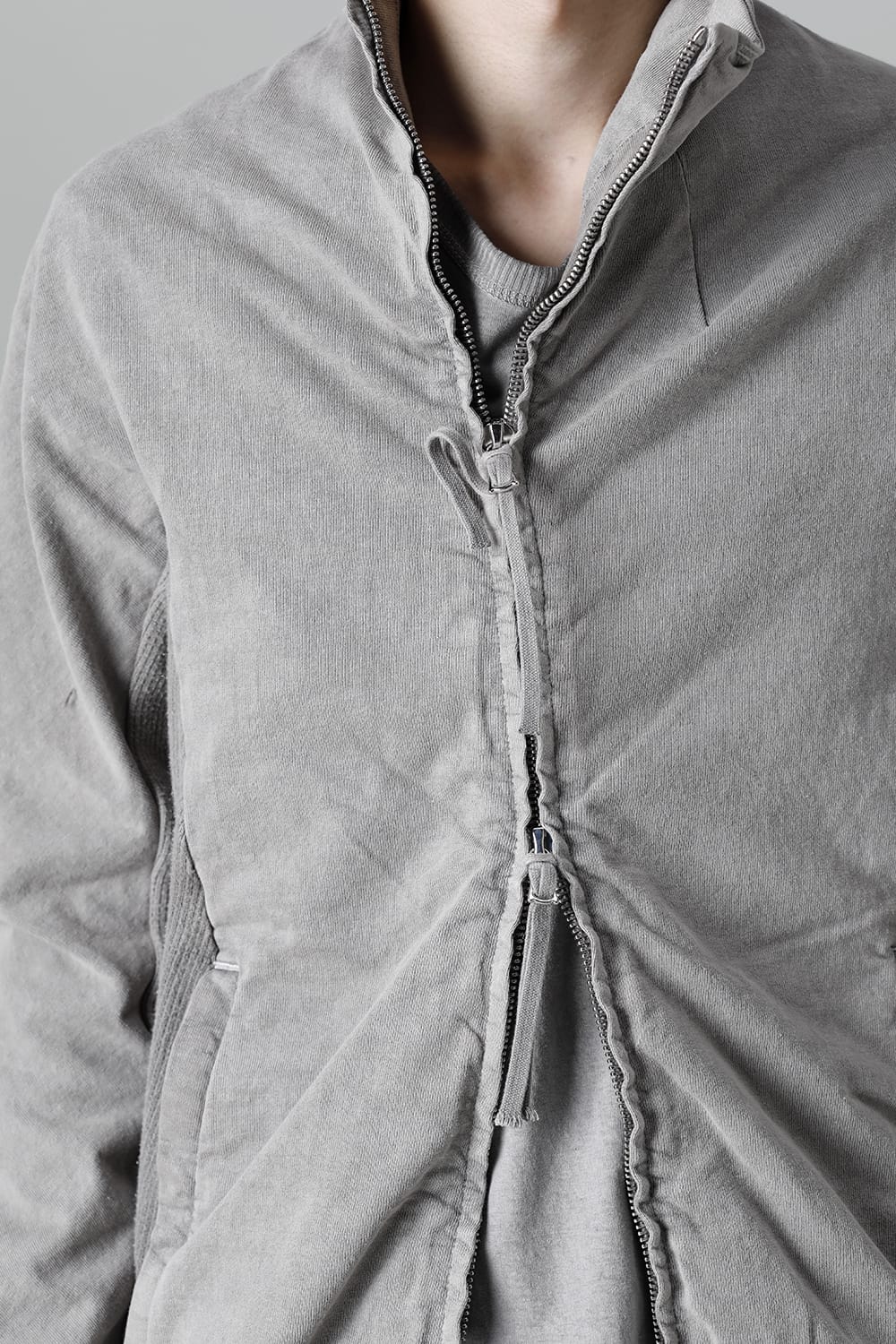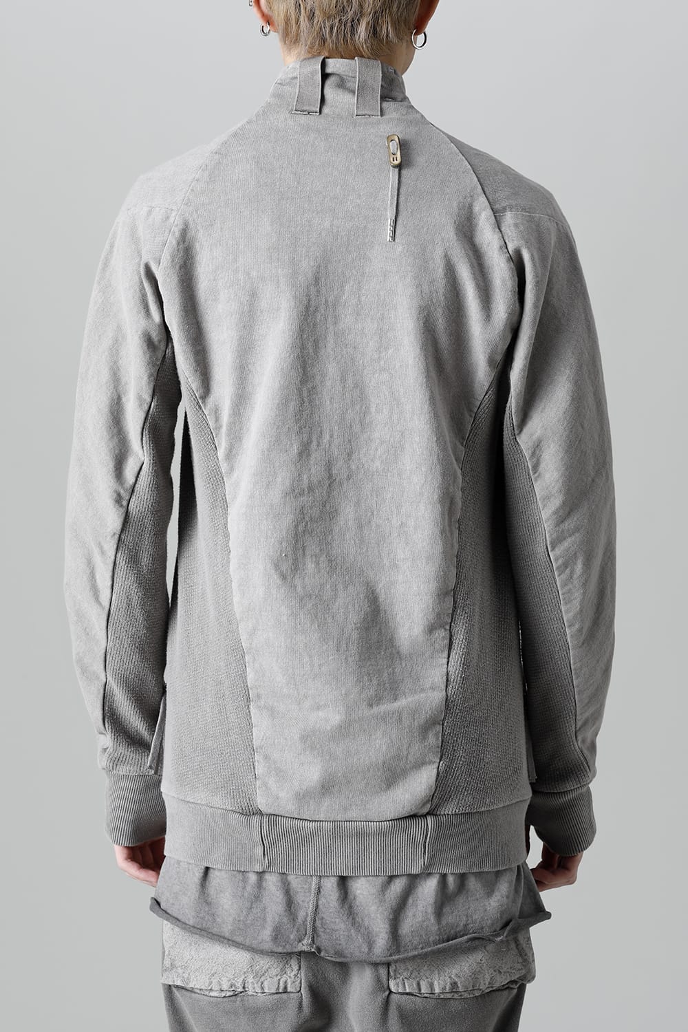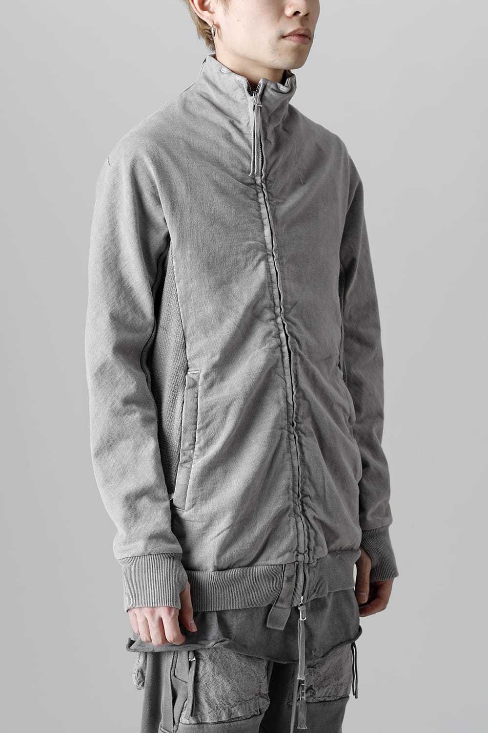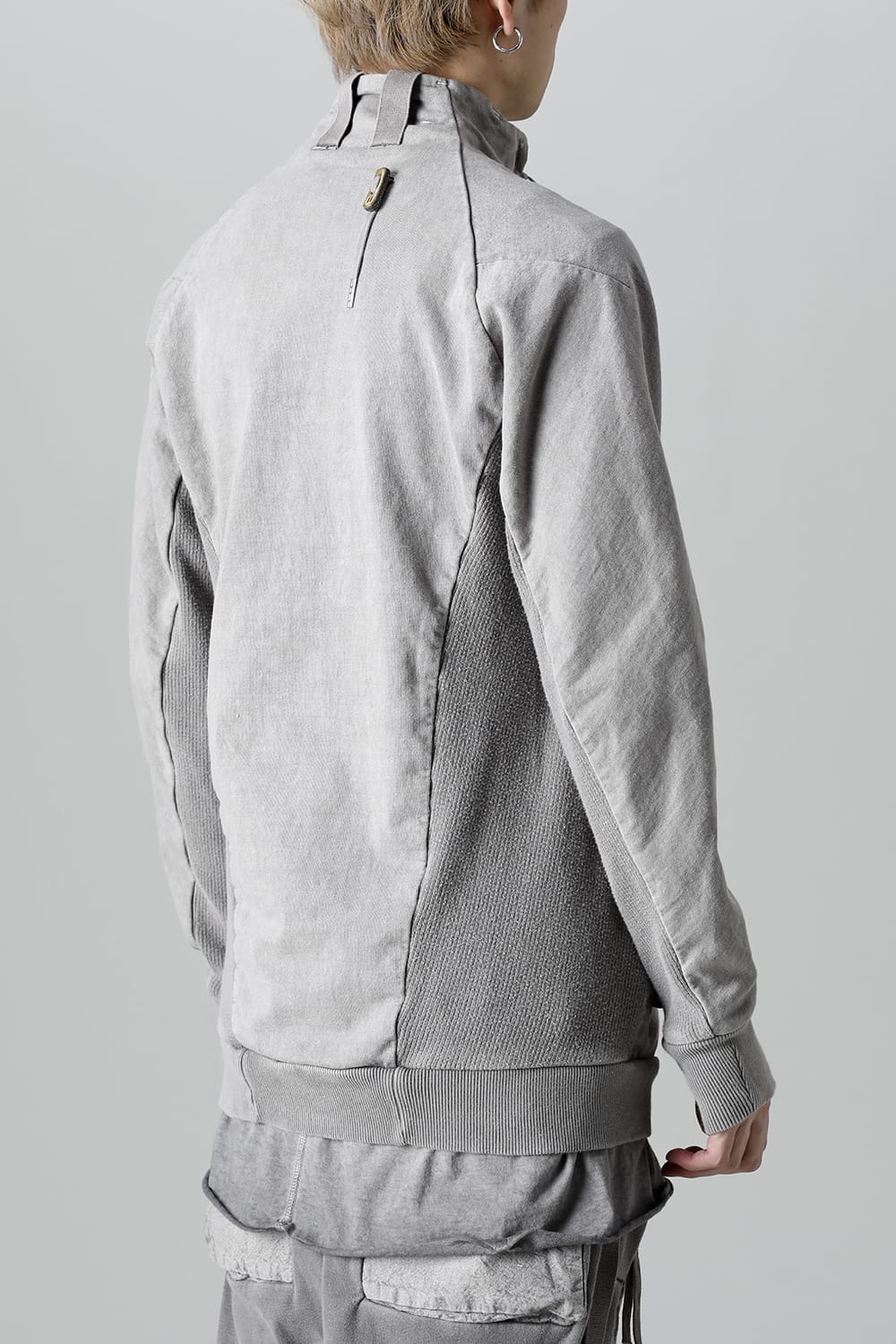 This high neck blouson "ZIPPER1" has been released for a long time as one of the representative items of the brand. With sweat as the main item, the sides are made of thick ribbed teleco fabric. The loose silhouette creates a rough look that can be worn casually. The look of the material and the fine details of each piece create a unique world view that makes you feel a certain weight. Combining the details of street culture and military items, with a no-waste design, this item has a delicate balance of originality and versatility with fine details.