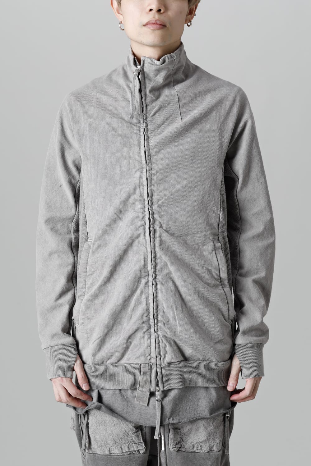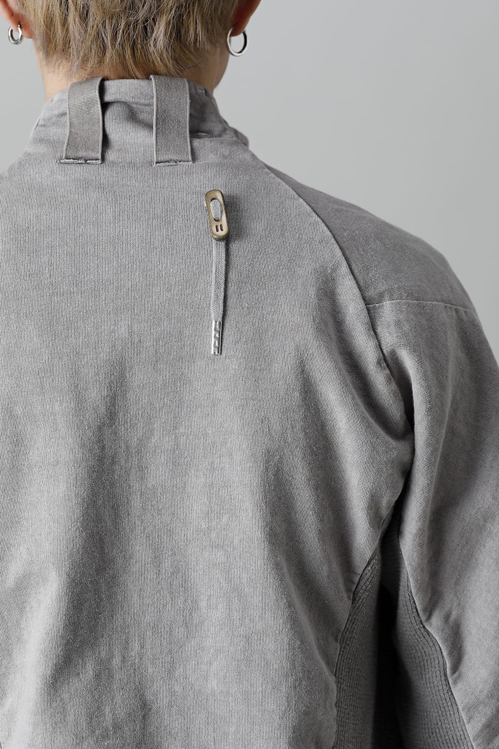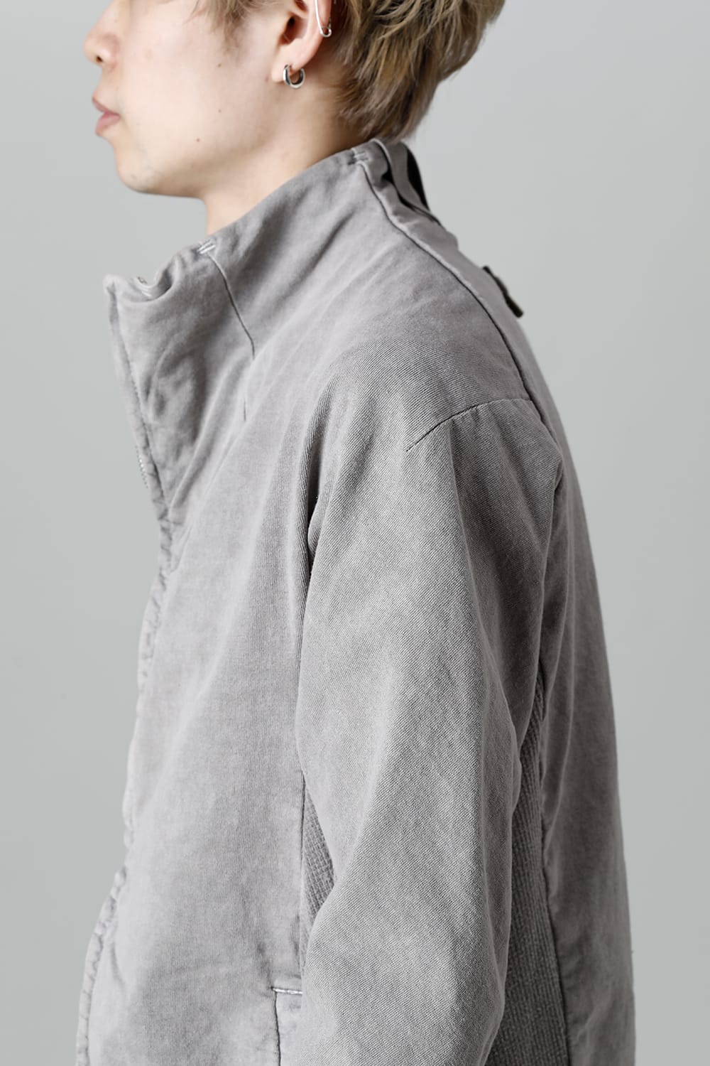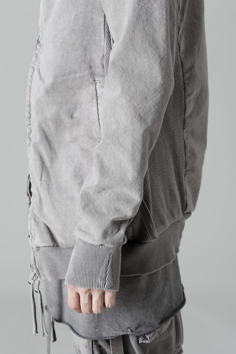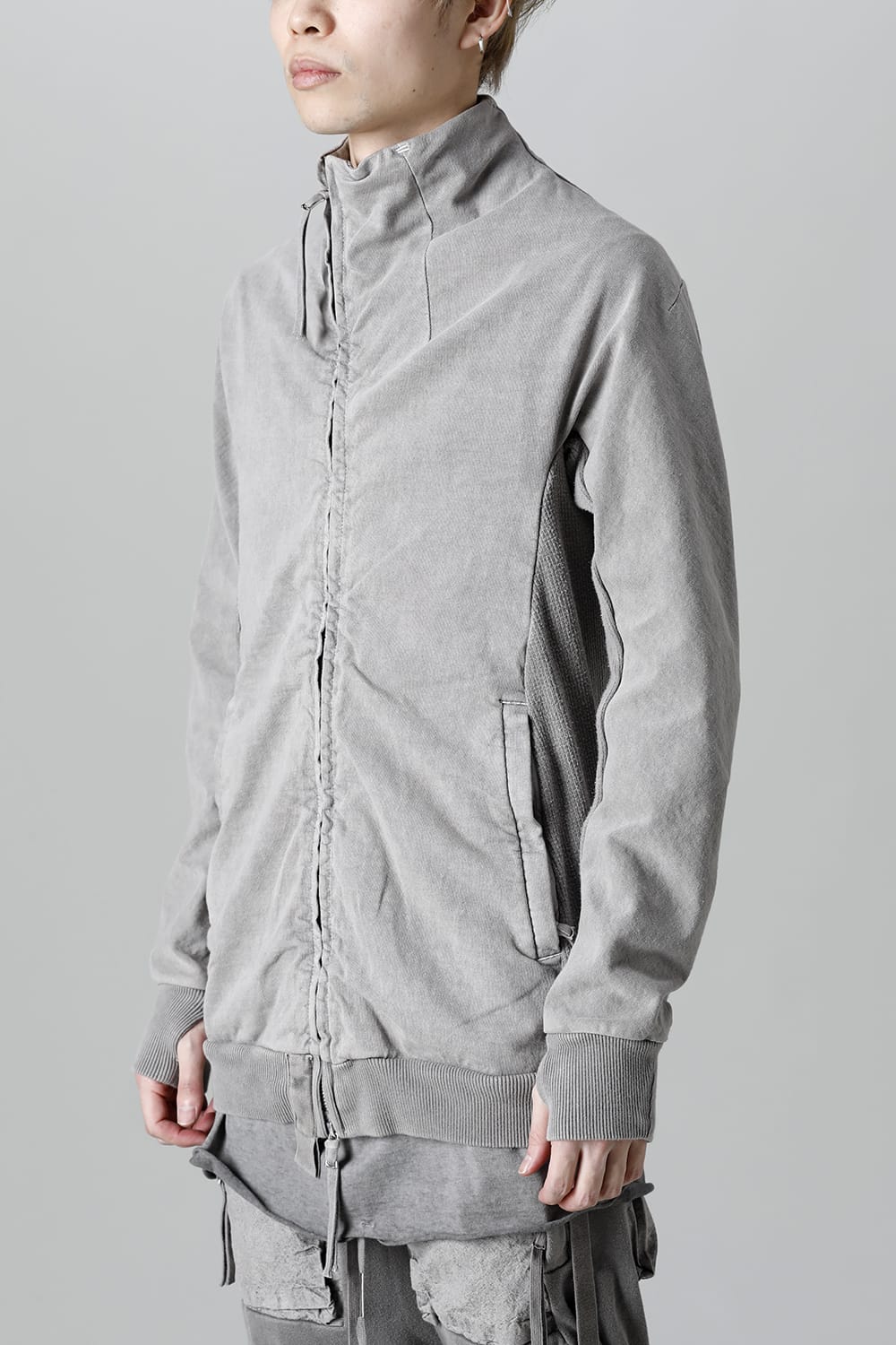 This high neck blouson "ZIPPER1" has been released for a long time as one of the representative items of the brand. With sweat as the main item, the sides are made of thick ribbed teleco fabric. The loose silhouette creates a rough look that can be worn casually. The look of the material and the fine details of each piece create a unique world view that makes you feel a certain weight. Combining the details of street culture and military items, with a no-waste design, this item has a delicate balance of originality and versatility with fine details.