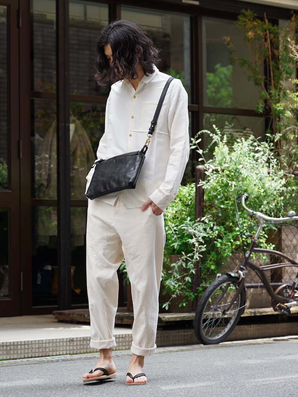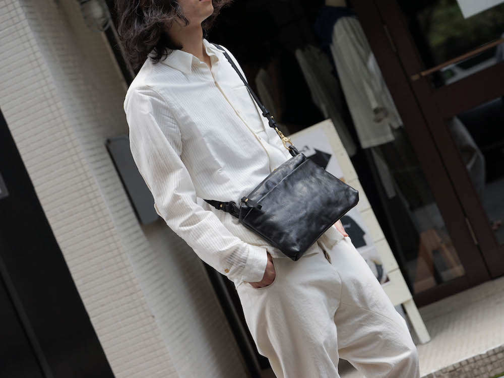 秋葉織りで表現したストライプの風通しの良いindividual sentiments - インディビジュアルセンチメンツの『Shirt SH32 Japanese Wash / Cotton Akiha Pique 1』とgolem - ゴーレムの『Drop Crotch Pants』で全体的に生成りのカラーで統一感を出し、普段遣いにちょうど良い大きさのcornelian taurus by daisuke iwanaga - コーネリアンタウラスの『Flat Shoulder Mini - Steer oil leather』をアクセントにしました。