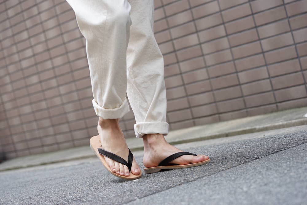 鼻緒には軽量で柔軟性と耐久性に優れたディアレザーを使用、調和のとれたインソールとのカラーリングの妙も見事な作品です。アウトソール部分はラバー素材で通常のビーチサンダルよりもクッション性とグリップ力に優れています。さらに、ラバー部分はソールの張り替えが可能なので、サンダルにもかかわらず、長く愛用していただけます。