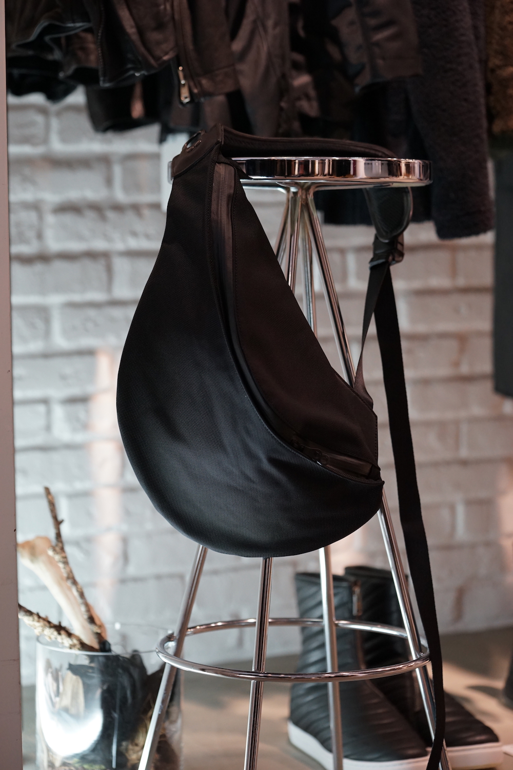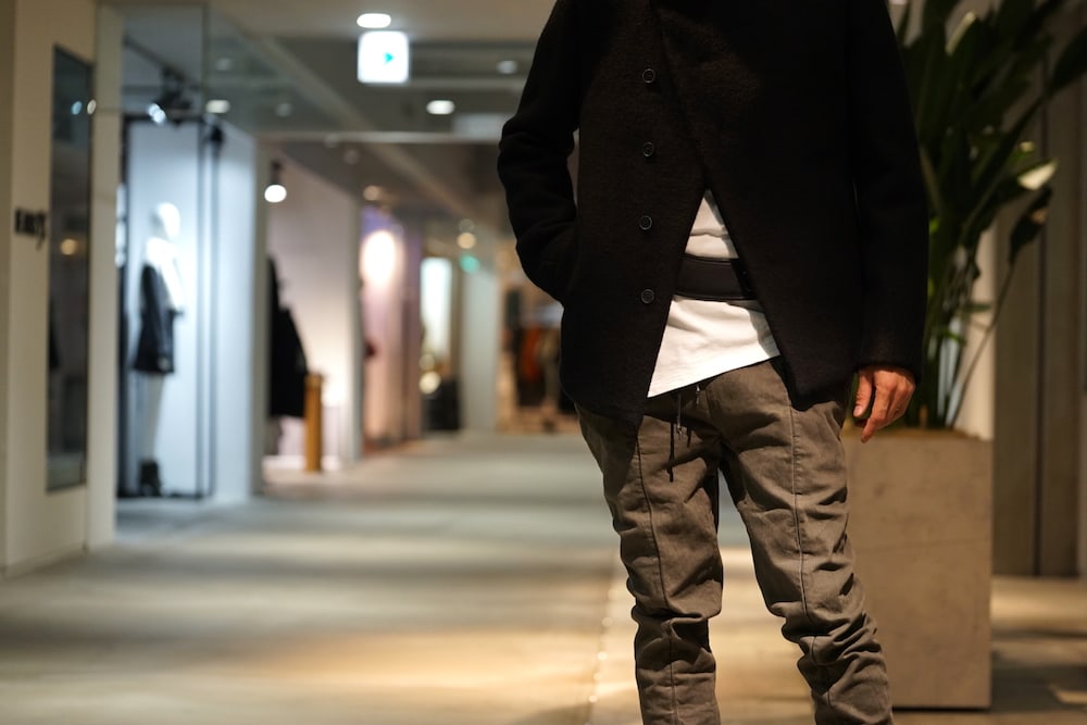 今回はHannibal.のメルトンコートに合わせるため、斜め掛けではなくウエストでスタイリングしています。