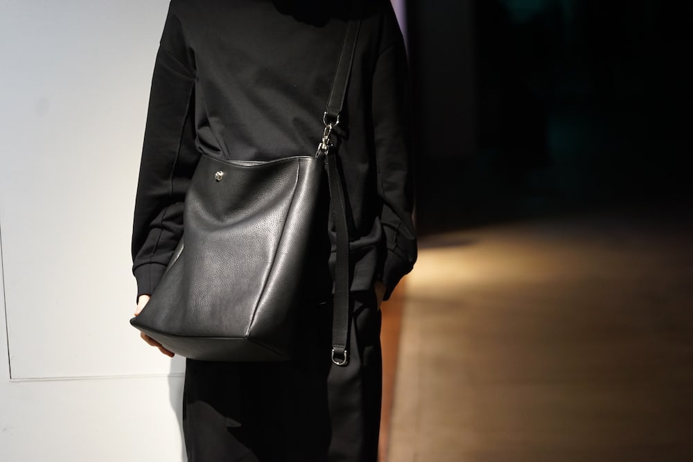傷が付きにくいシュリンクレザーを使用した、ダブルストラップショルダー。高級感漂う素材に、使い勝手のよいサイズを追求されたBAGは、ドイツホックとライニングに使用したキーリングがアクセントになっています。