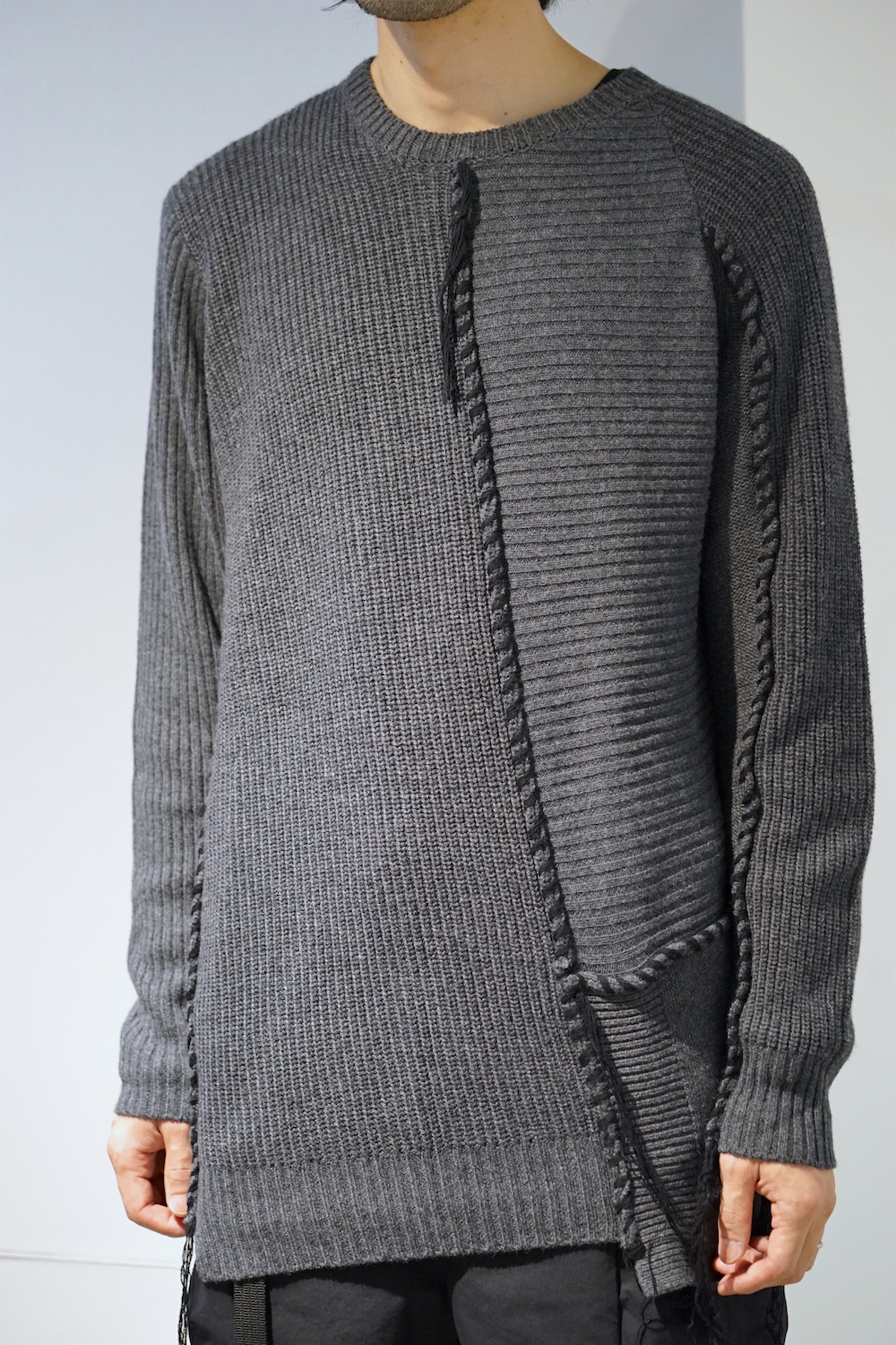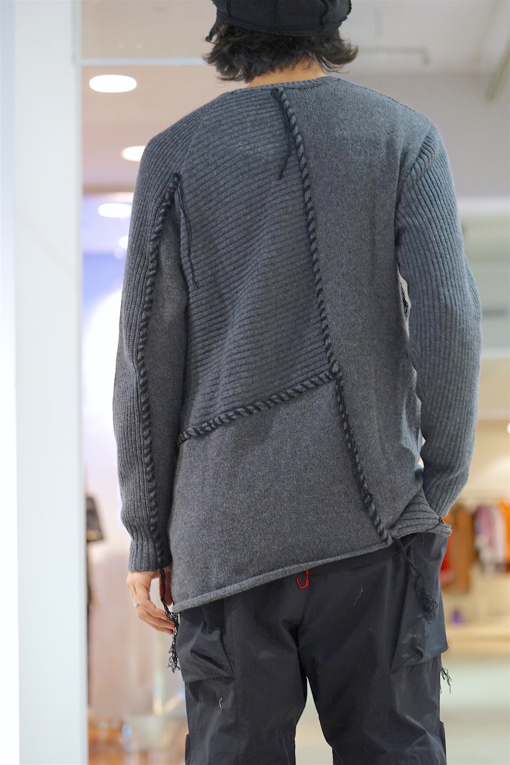 種類の編み地を引き揃えた糸でハンドパッチワークで仕上げたこだわりのデザインニットです。