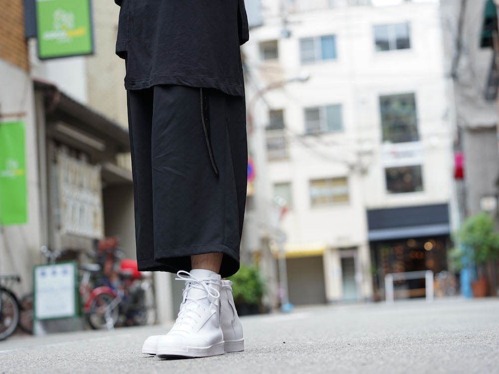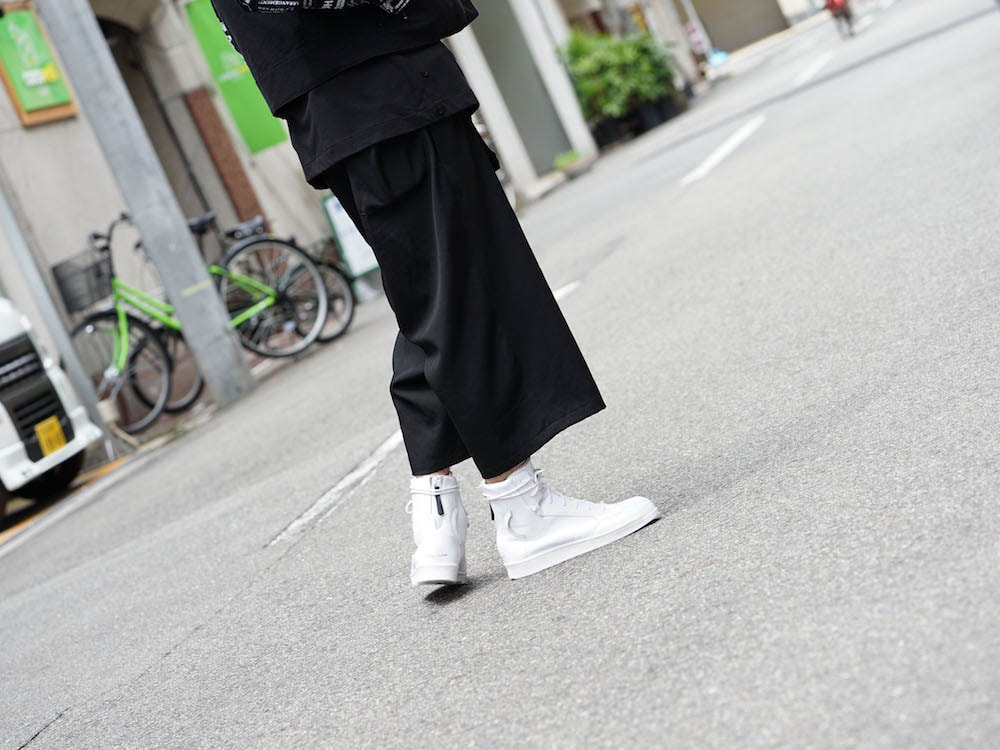 ハイカットですが足首周りがタイトで履き口の長さが平行なスニーカーですので7分丈のワイドパンツとの相性は抜群です。