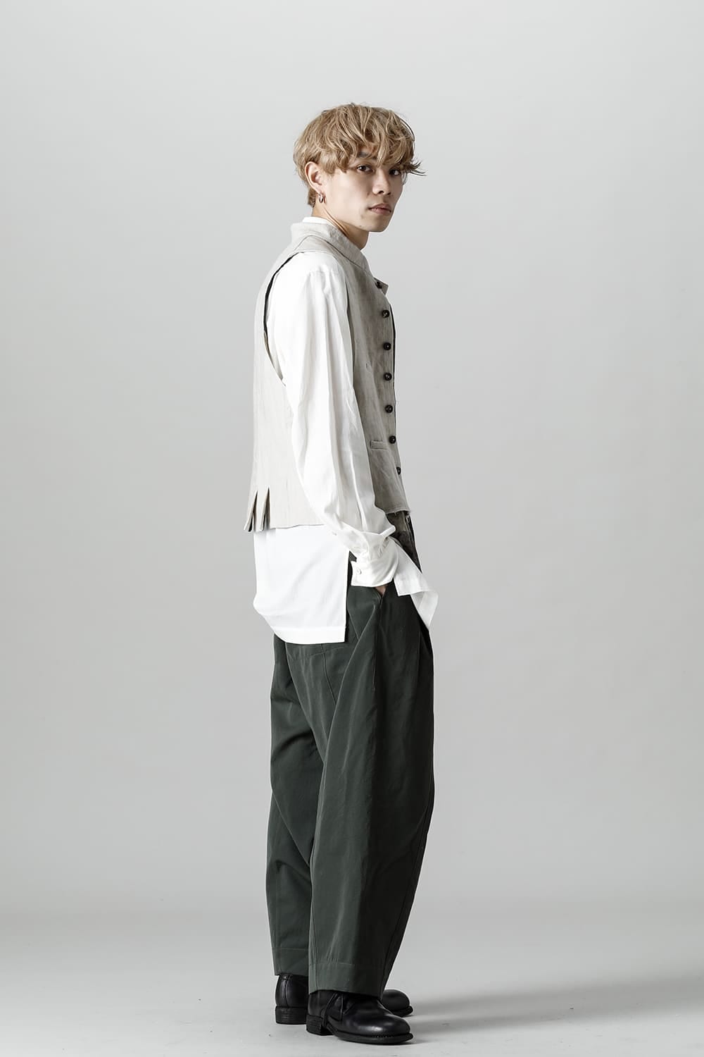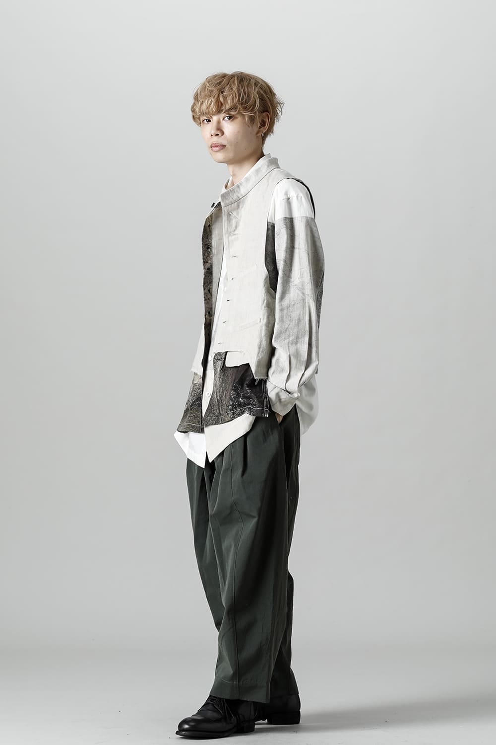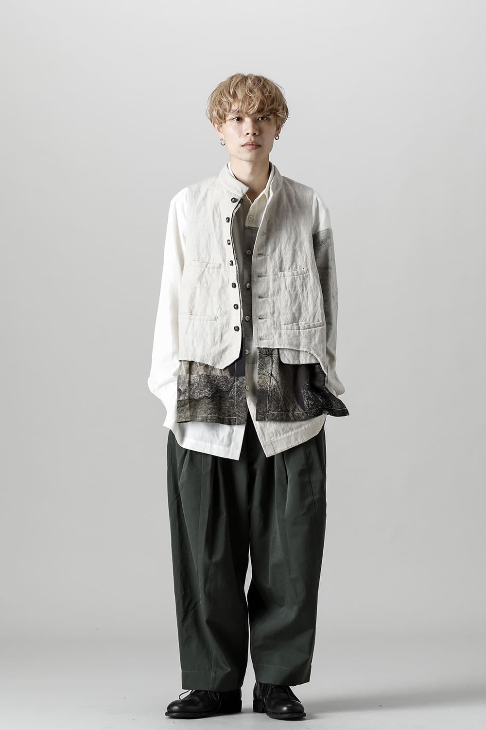 肌触りの良い柔らかなコールドダイウールのシングルベスト。マンダリンカラー、レギュラーフィットのニュートラルなシルエットに、特徴はフロント裾部のデザイン。アシンメトリーにカットされた端部より覗く、シャツを模したライニングがZIGGY CHENらしい常識に囚われない発想です。ライニングのプリントデザインは今期のコンセプト「SUGARDENS」の由来となっている蘇州古典庭園の風景をデザイナーが自ら撮影した写真を元としたグラフィック。総裏仕様で組み合わされるストライプ生地はシーズン性を曖昧なものにしたいというデザイナーの意図で20SSシーズンより引き続き使用されているもの。この生地はZIGGY CHENが機屋から染色工場まで指定し、イタリアにて独自に開発したものです。バックディテールもスリットが3本と随所の手間の掛けられた遊びが愉しめるアイテムです。