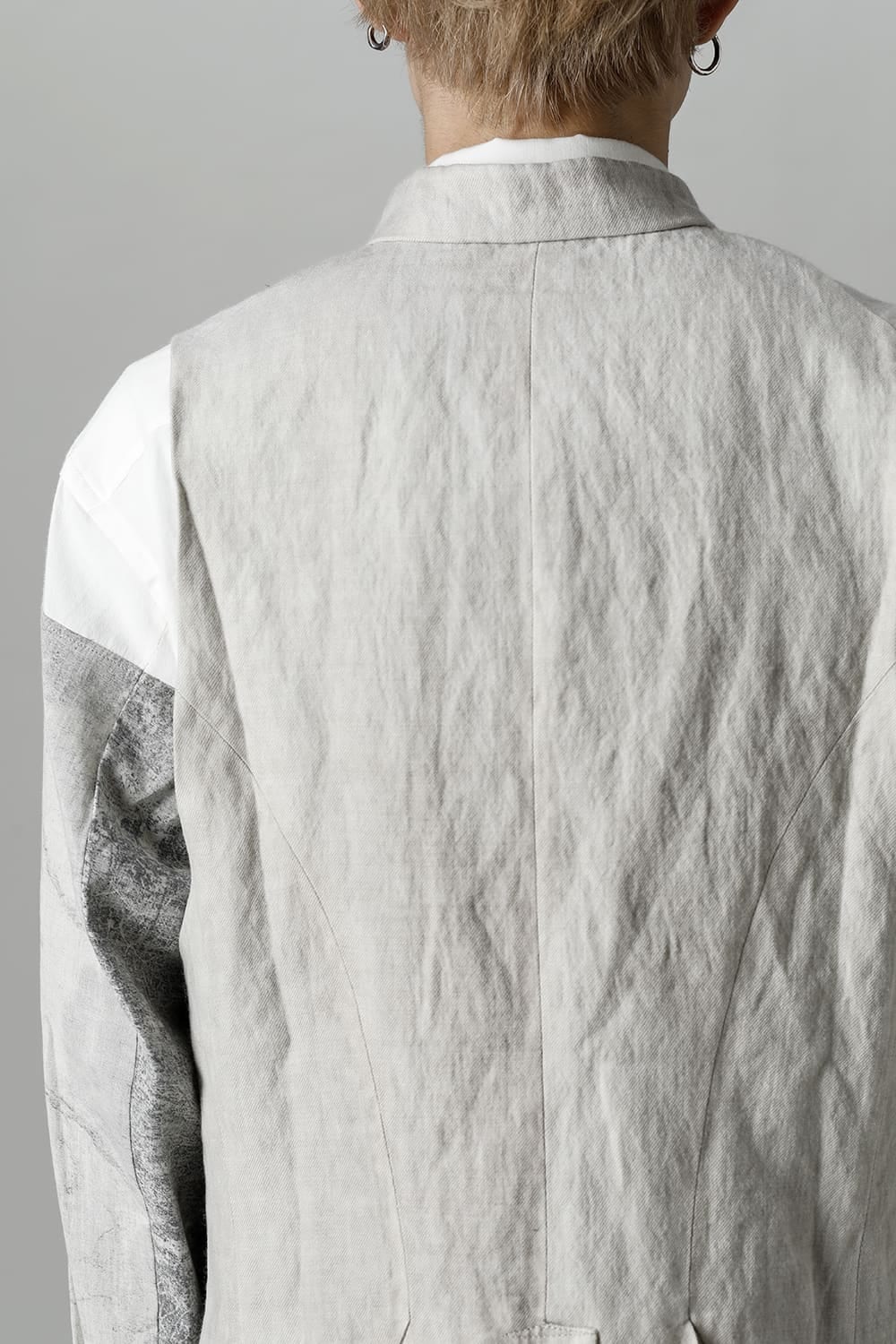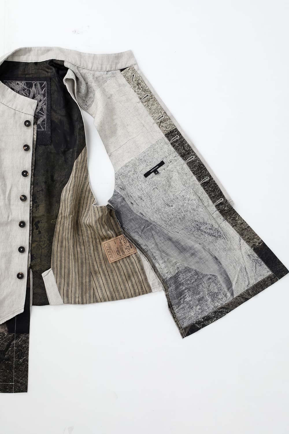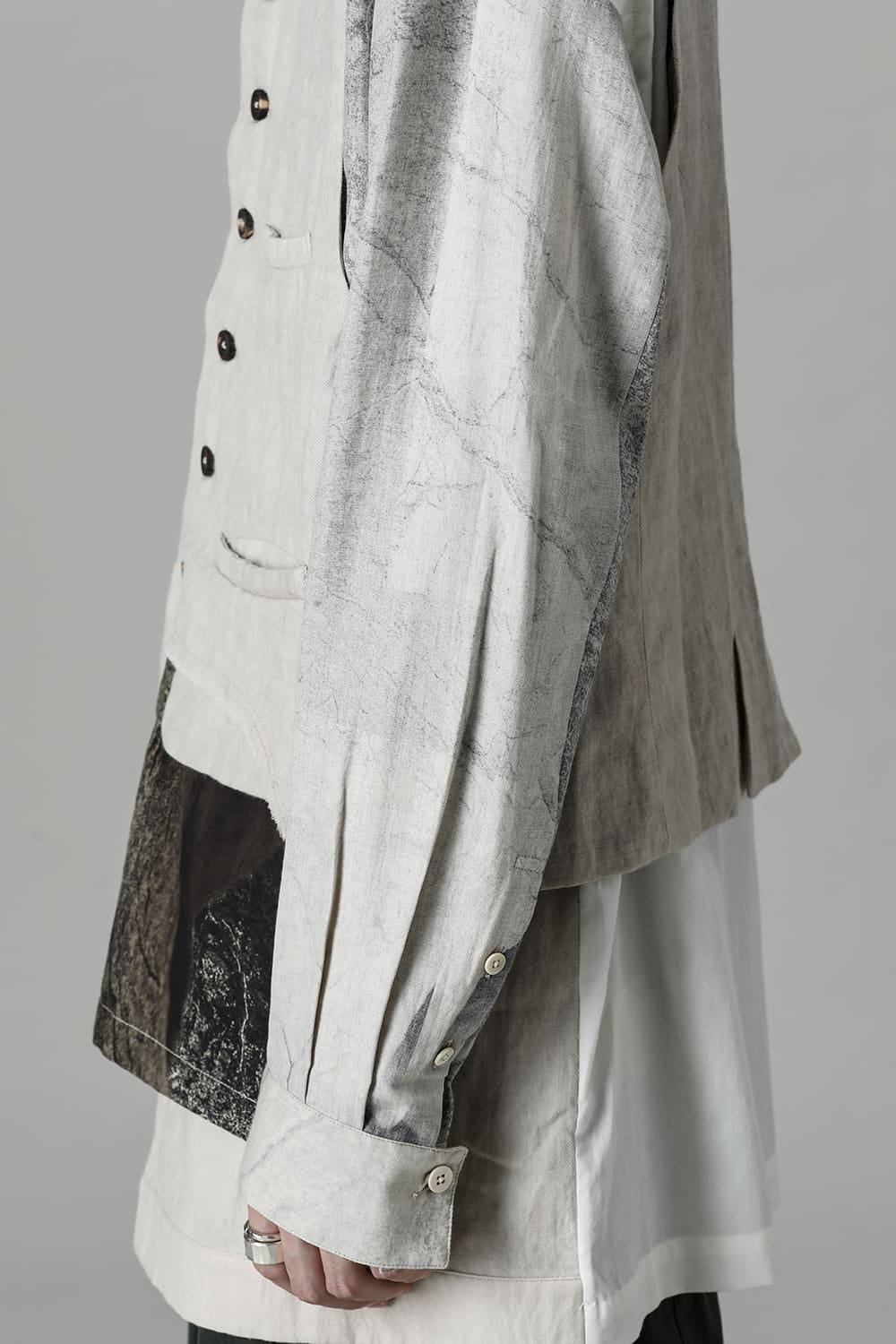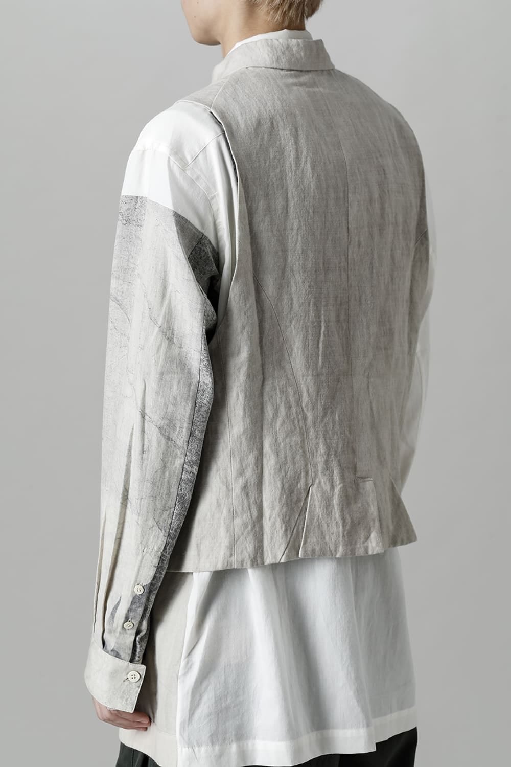 肌触りの良い柔らかなコールドダイウールのシングルベスト。マンダリンカラー、レギュラーフィットのニュートラルなシルエットに、特徴はフロント裾部のデザイン。アシンメトリーにカットされた端部より覗く、シャツを模したライニングがZIGGY CHENらしい常識に囚われない発想です。ライニングのプリントデザインは今期のコンセプト「SUGARDENS」の由来となっている蘇州古典庭園の風景をデザイナーが自ら撮影した写真を元としたグラフィック。総裏仕様で組み合わされるストライプ生地はシーズン性を曖昧なものにしたいというデザイナーの意図で20SSシーズンより引き続き使用されているもの。この生地はZIGGY CHENが機屋から染色工場まで指定し、イタリアにて独自に開発したものです。バックディテールもスリットが3本と随所の手間の掛けられた遊びが愉しめるアイテムです。