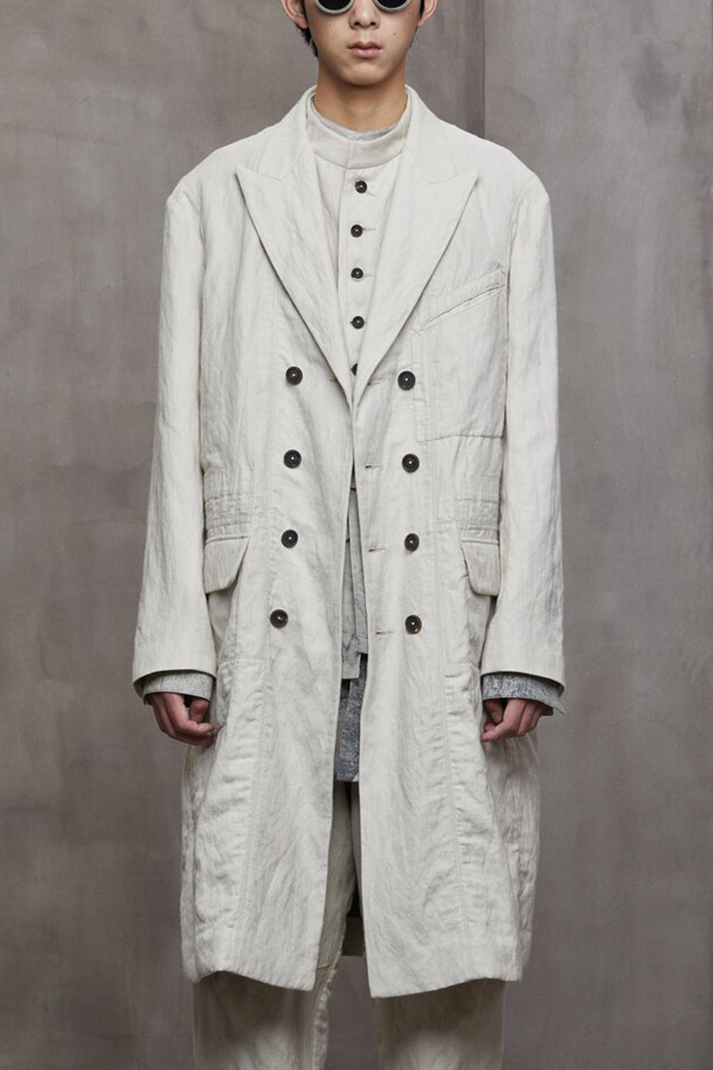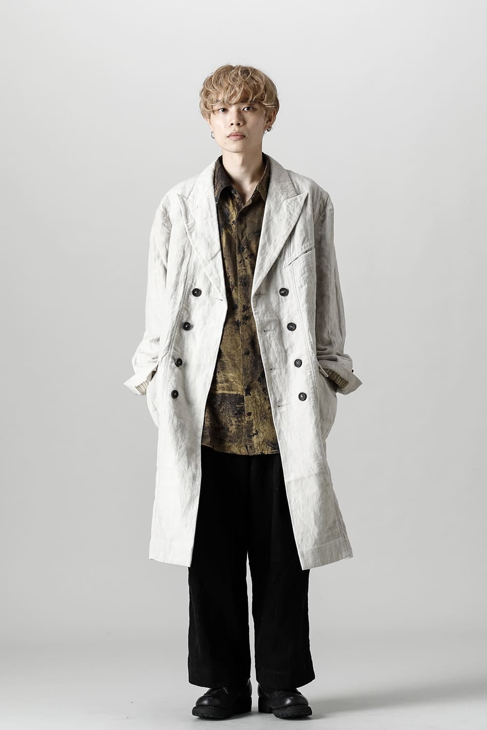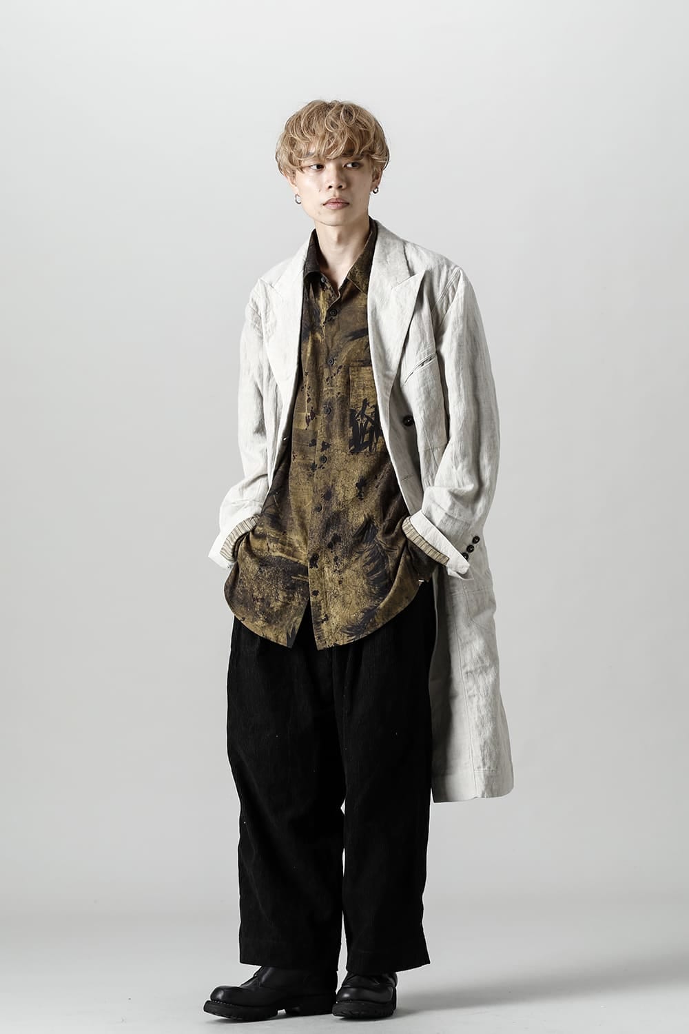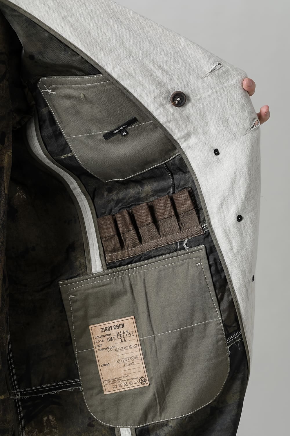 肌触りの良い柔らかなウール素材にコールドダイを施したダブルブレストコート。ゆとりのあるボディとアームに、広目のピークラペルと膝下ほどのロング丈が相まってとてもクラシカルな印象です。胸元にはジェットポケット、サイド下部にはフラップポケットのフロントディテール、本切迫5つボタン仕様。バックはセンタースリットとウエスト部に仕込まれたやや伸縮性のあるラバーバンドによるストレスフリーな仕上げ。内部はバレットホルダーをモチーフとしたZIGGY CHENらしい技巧を凝らしたデザインが施され、ホルダーを構成するステッチは表地に浮かび上がり、表情の変化を演出しています。目を惹くプリントライニングは今期のコンセプト「SUGARDENS」の由来となっている蘇州古典庭園の風景をデザイナーが自ら撮影した写真を元としたグラフィックです。