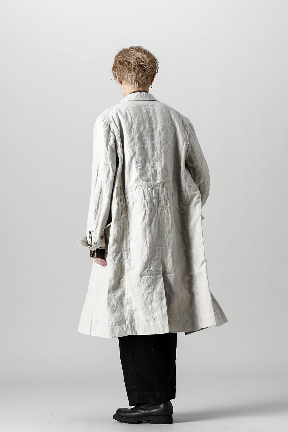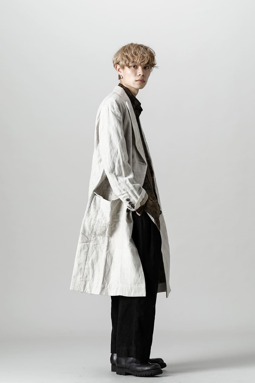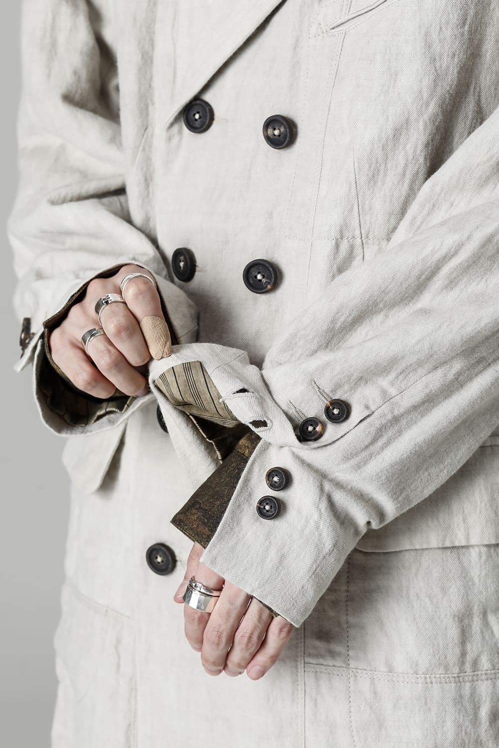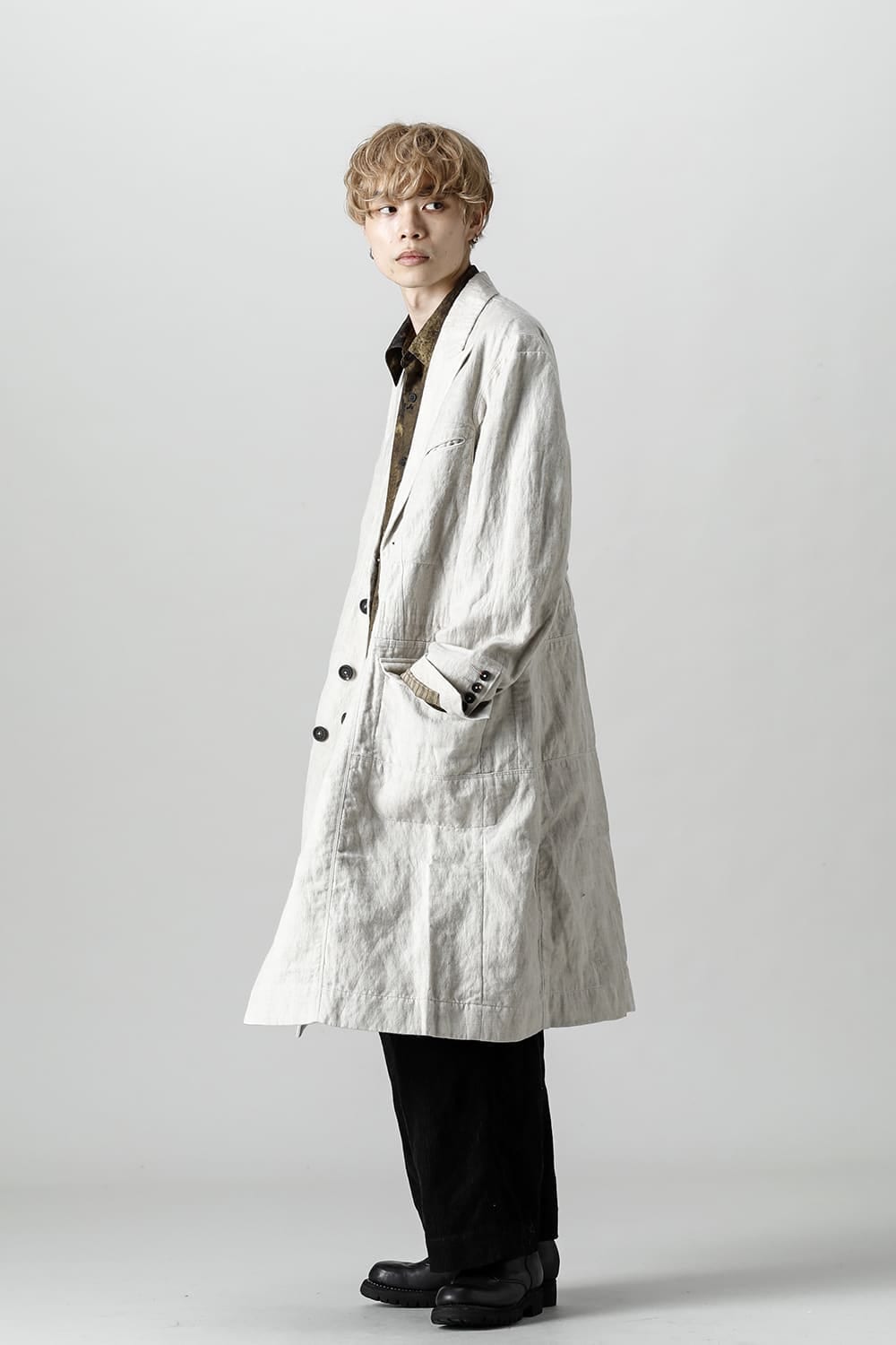肌触りの良い柔らかなウール素材にコールドダイを施したダブルブレストコート。ゆとりのあるボディとアームに、広目のピークラペルと膝下ほどのロング丈が相まってとてもクラシカルな印象です。胸元にはジェットポケット、サイド下部にはフラップポケットのフロントディテール、本切迫5つボタン仕様。バックはセンタースリットとウエスト部に仕込まれたやや伸縮性のあるラバーバンドによるストレスフリーな仕上げ。内部はバレットホルダーをモチーフとしたZIGGY CHENらしい技巧を凝らしたデザインが施され、ホルダーを構成するステッチは表地に浮かび上がり、表情の変化を演出しています。目を惹くプリントライニングは今期のコンセプト「SUGARDENS」の由来となっている蘇州古典庭園の風景をデザイナーが自ら撮影した写真を元としたグラフィックです。