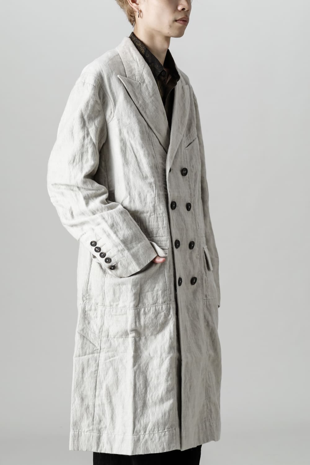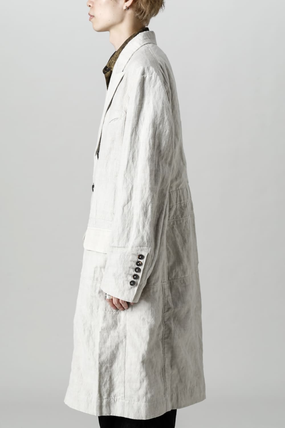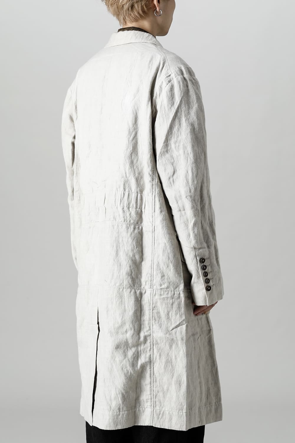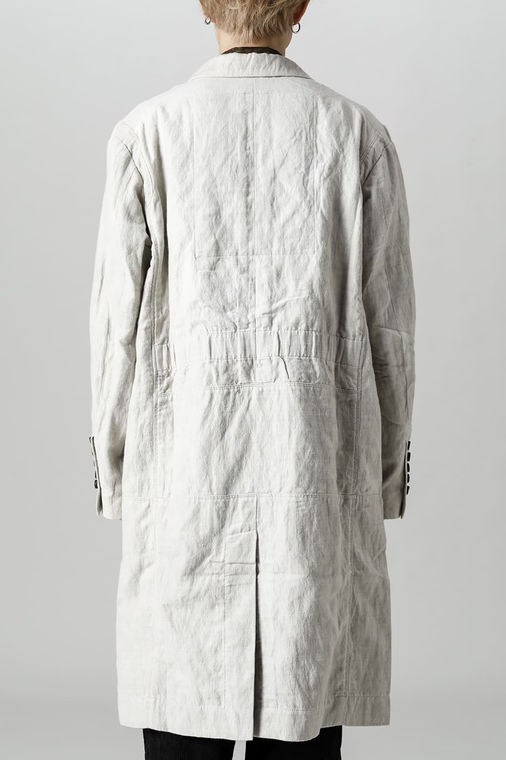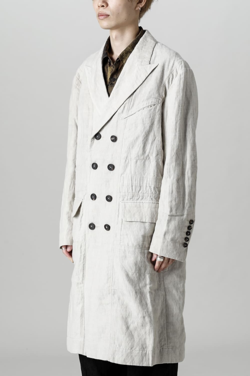 肌触りの良い柔らかなウール素材にコールドダイを施したダブルブレストコート。ゆとりのあるボディとアームに、広目のピークラペルと膝下ほどのロング丈が相まってとてもクラシカルな印象です。胸元にはジェットポケット、サイド下部にはフラップポケットのフロントディテール、本切迫5つボタン仕様。バックはセンタースリットとウエスト部に仕込まれたやや伸縮性のあるラバーバンドによるストレスフリーな仕上げ。内部はバレットホルダーをモチーフとしたZIGGY CHENらしい技巧を凝らしたデザインが施され、ホルダーを構成するステッチは表地に浮かび上がり、表情の変化を演出しています。目を惹くプリントライニングは今期のコンセプト「SUGARDENS」の由来となっている蘇州古典庭園の風景をデザイナーが自ら撮影した写真を元としたグラフィックです。