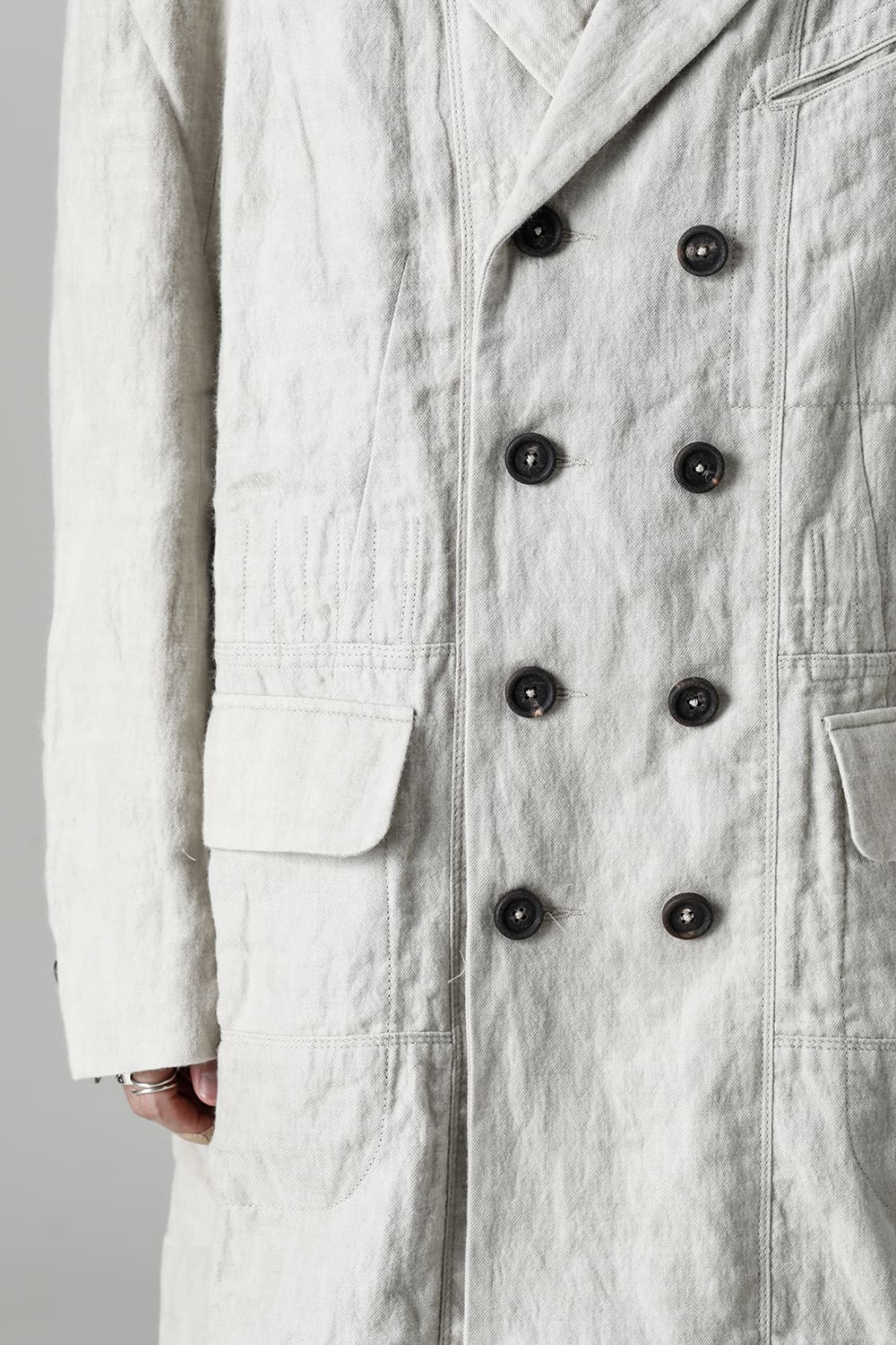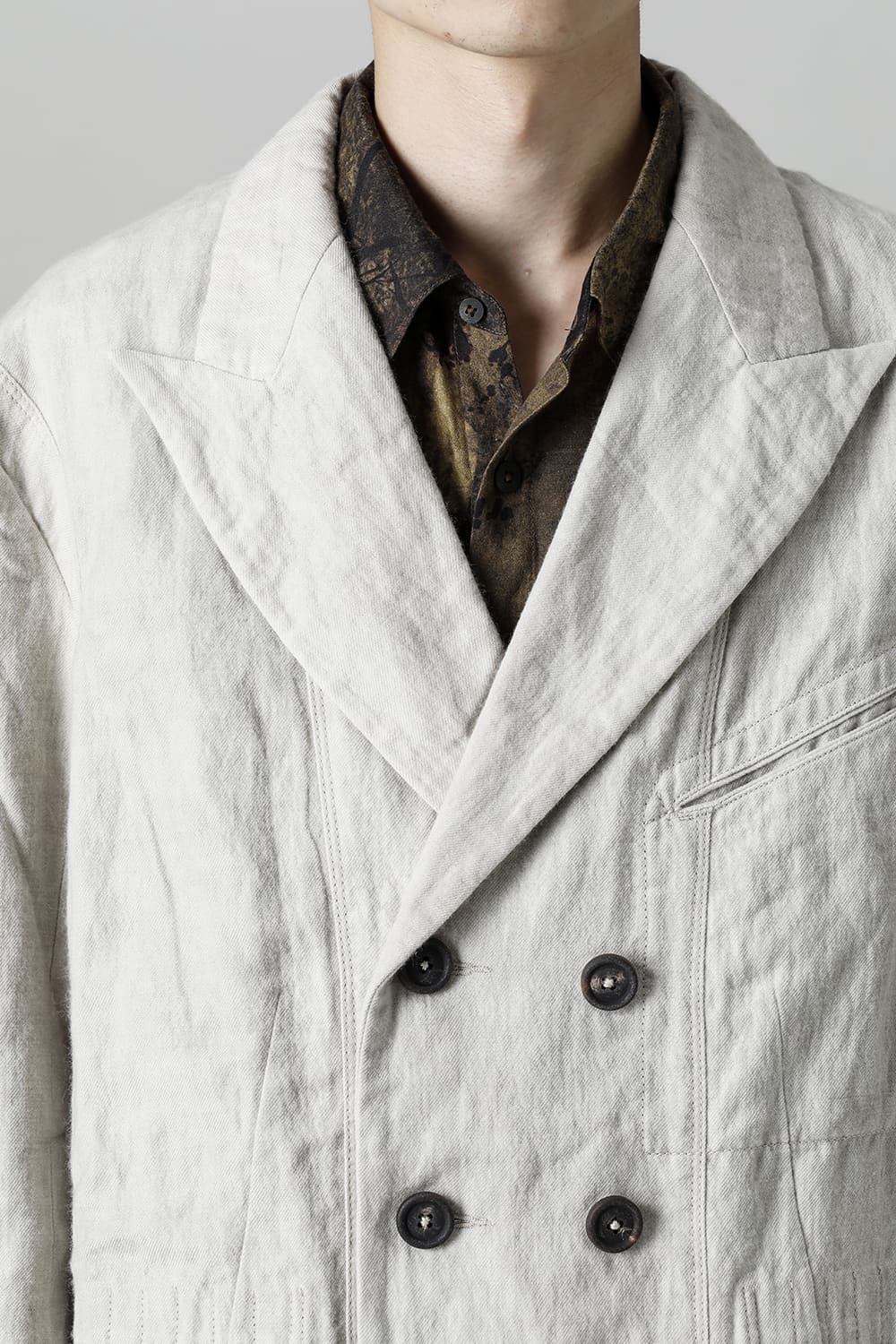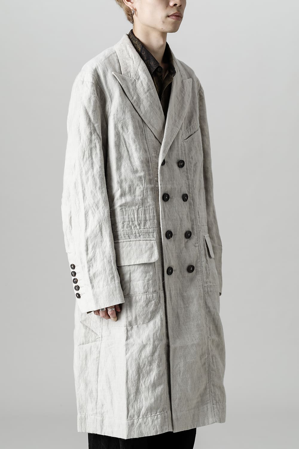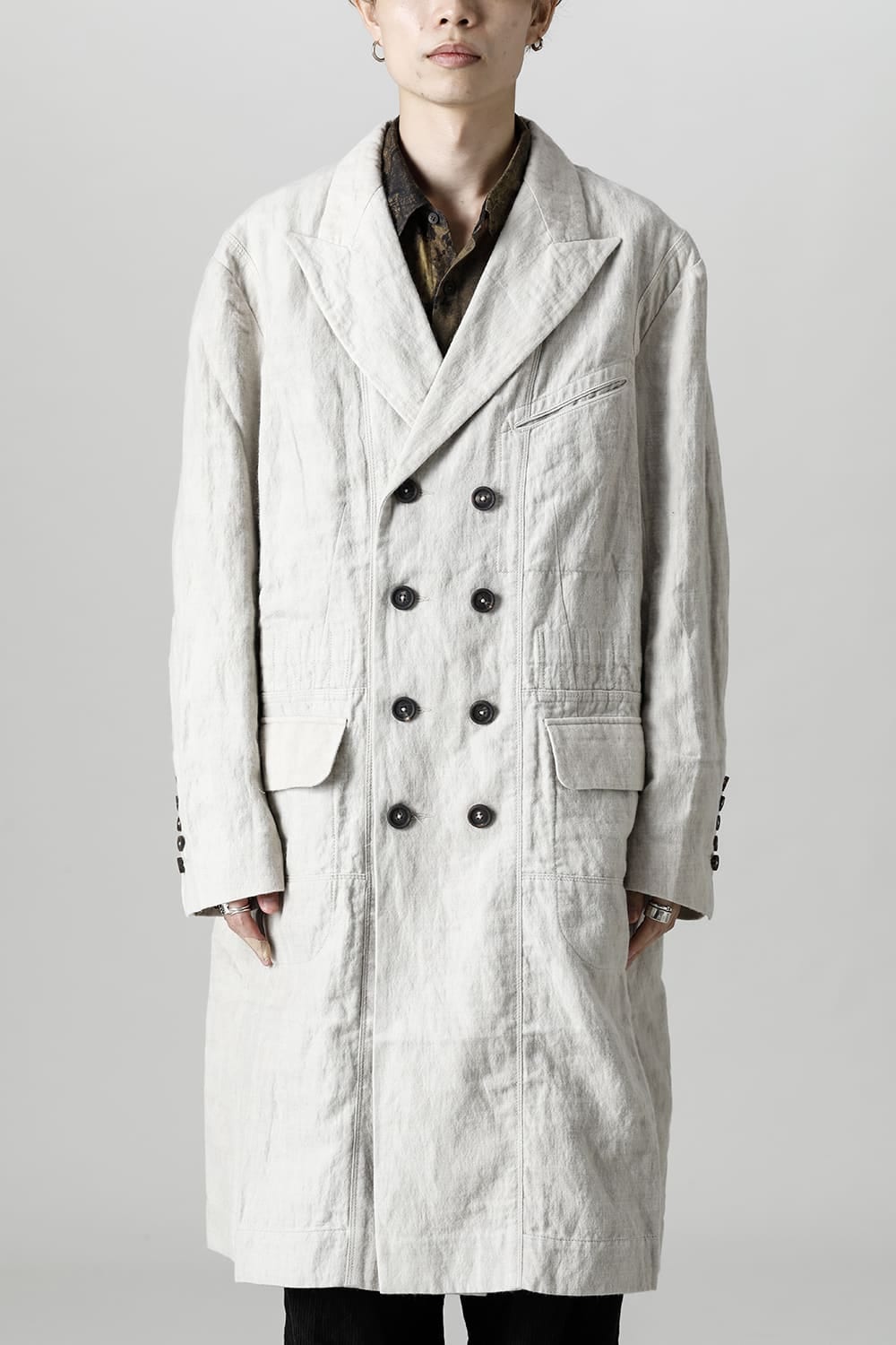 肌触りの良い柔らかなウール素材にコールドダイを施したダブルブレストコート。ゆとりのあるボディとアームに、広目のピークラペルと膝下ほどのロング丈が相まってとてもクラシカルな印象です。胸元にはジェットポケット、サイド下部にはフラップポケットのフロントディテール、本切迫5つボタン仕様。バックはセンタースリットとウエスト部に仕込まれたやや伸縮性のあるラバーバンドによるストレスフリーな仕上げ。内部はバレットホルダーをモチーフとしたZIGGY CHENらしい技巧を凝らしたデザインが施され、ホルダーを構成するステッチは表地に浮かび上がり、表情の変化を演出しています。目を惹くプリントライニングは今期のコンセプト「SUGARDENS」の由来となっている蘇州古典庭園の風景をデザイナーが自ら撮影した写真を元としたグラフィックです。