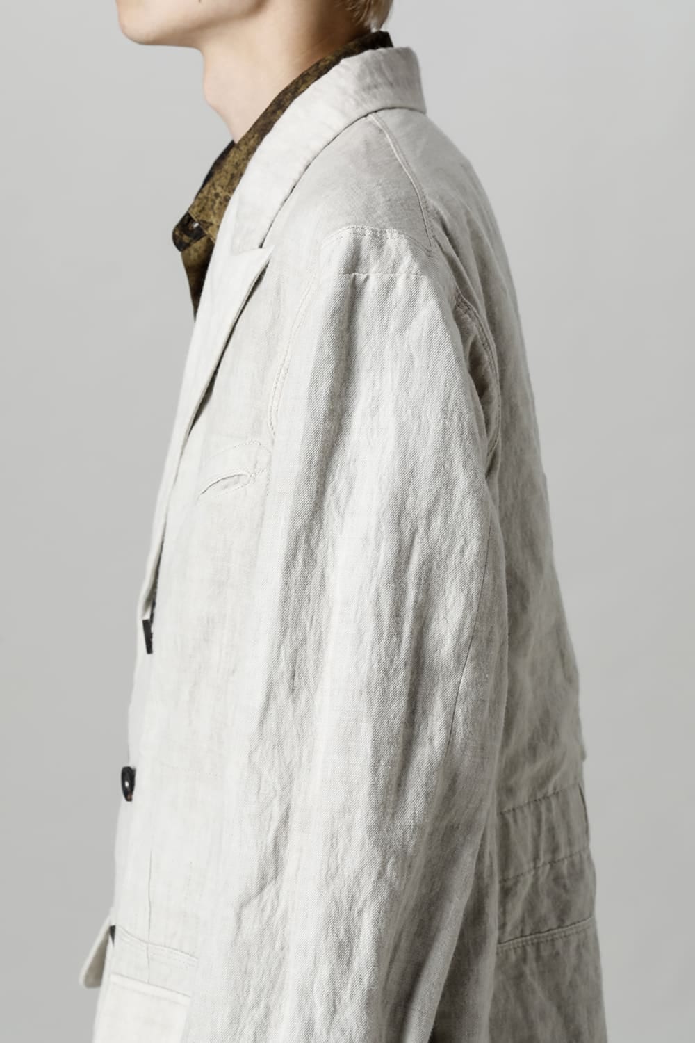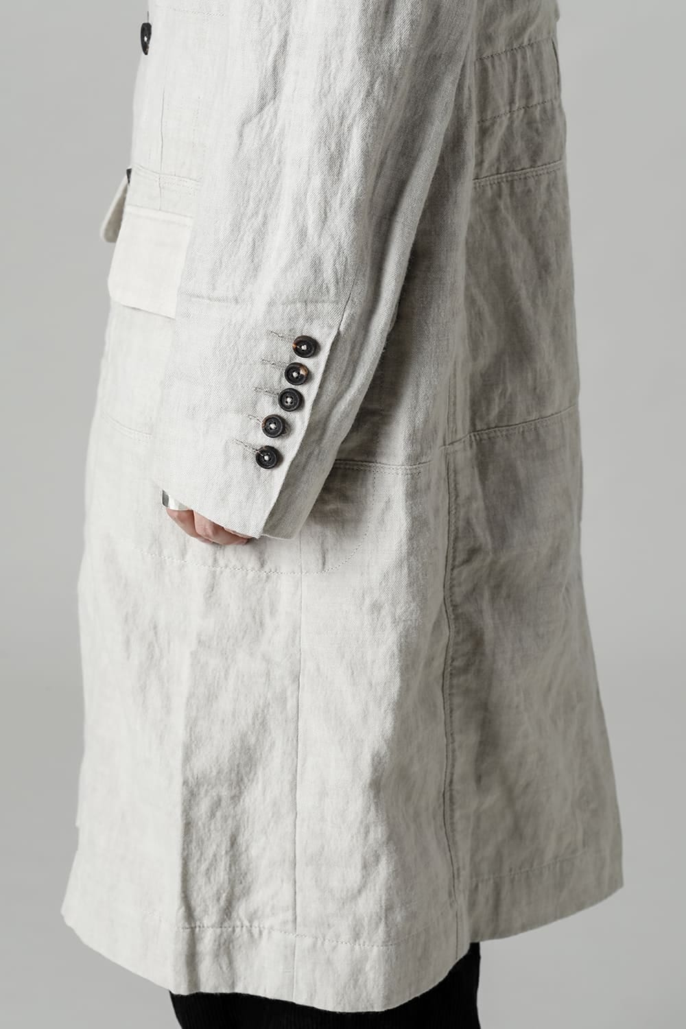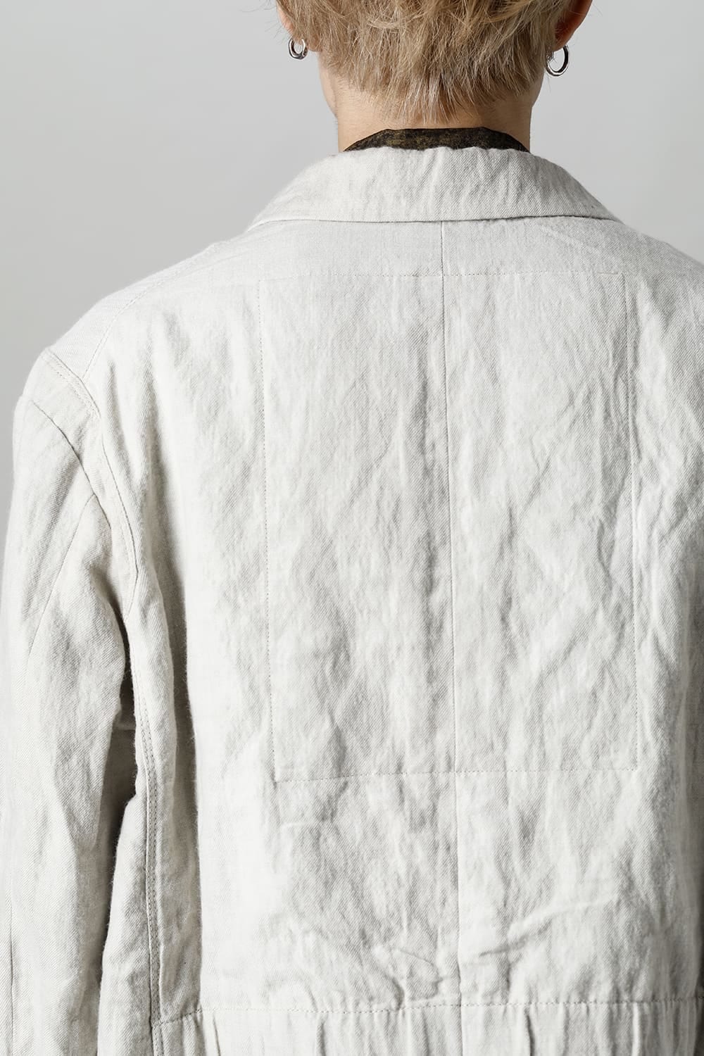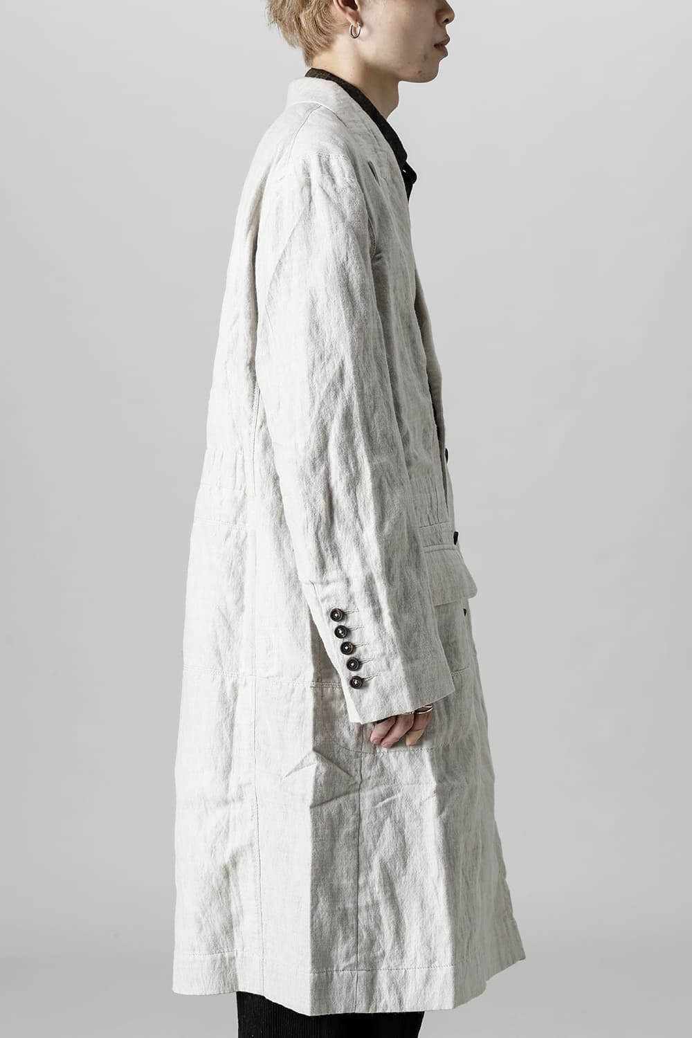 肌触りの良い柔らかなウール素材にコールドダイを施したダブルブレストコート。ゆとりのあるボディとアームに、広目のピークラペルと膝下ほどのロング丈が相まってとてもクラシカルな印象です。胸元にはジェットポケット、サイド下部にはフラップポケットのフロントディテール、本切迫5つボタン仕様。バックはセンタースリットとウエスト部に仕込まれたやや伸縮性のあるラバーバンドによるストレスフリーな仕上げ。内部はバレットホルダーをモチーフとしたZIGGY CHENらしい技巧を凝らしたデザインが施され、ホルダーを構成するステッチは表地に浮かび上がり、表情の変化を演出しています。目を惹くプリントライニングは今期のコンセプト「SUGARDENS」の由来となっている蘇州古典庭園の風景をデザイナーが自ら撮影した写真を元としたグラフィックです。