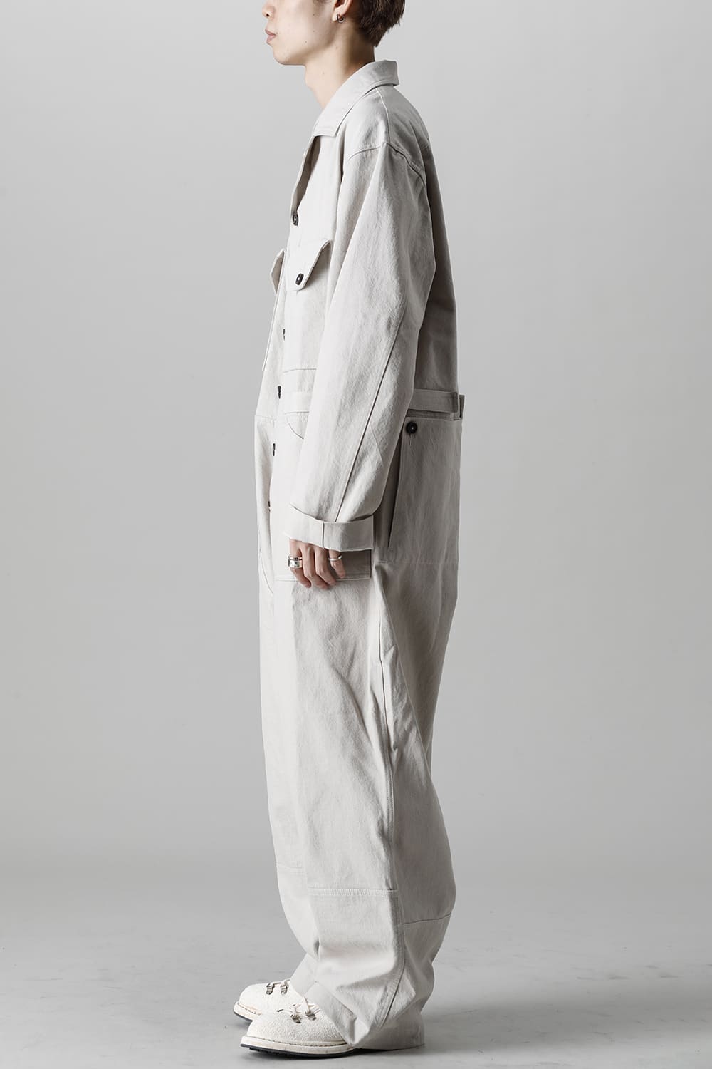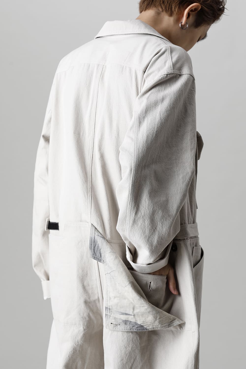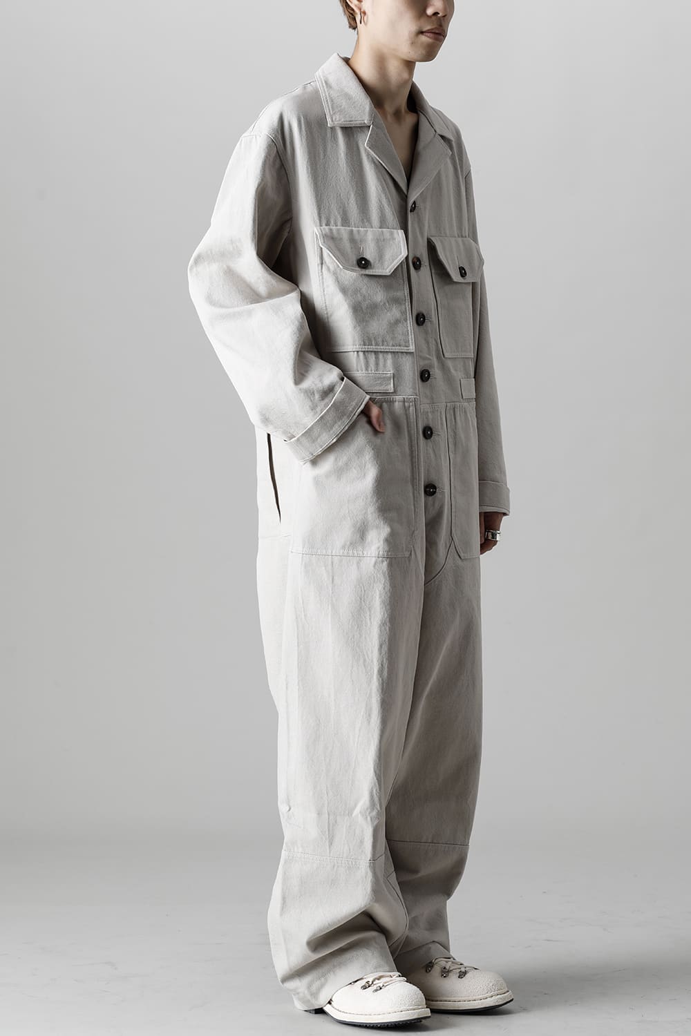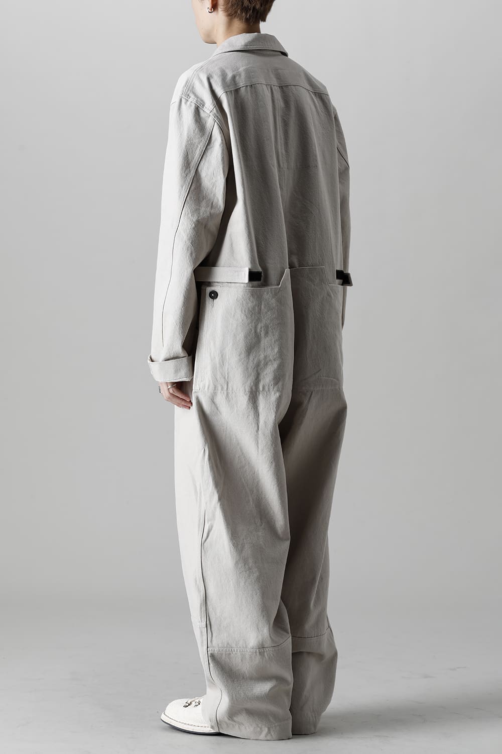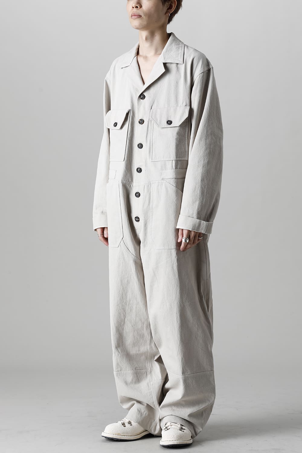 ベリーオーバーサイズフィットで製作されたジャンプスーツ。 生地は太番手のコットン糸で織り上げたドリル生地を使用しており、堅牢でドライタッチな質感。 襟元は下衿のあるスモールラペル仕様で今期展開しているスプレッドカラーシャツと相性良く合わせていただけます。 ヒップにはボタン着脱可能なラップディテールがデザインされており、今期のコンセプトのである"SUGARDEN"に由来する蘇州古典庭園の建造物からヒントを得て表現したかったという階層的構造をウェアのデザインとして取り入れた物です。 また、ラップディテールの内側には、太湖石をプリントした細番手コットンウールツイル生地が裏打ちされており、 裾裏地にはデザイナー自らが蘇州古典庭園の風景を撮影した写真を元にデジタルプリントを施したポリエステルツイル生地が使用されているなど、ロールアップやラップディテールの開閉によって様々な表情が楽しめる一着となっています。