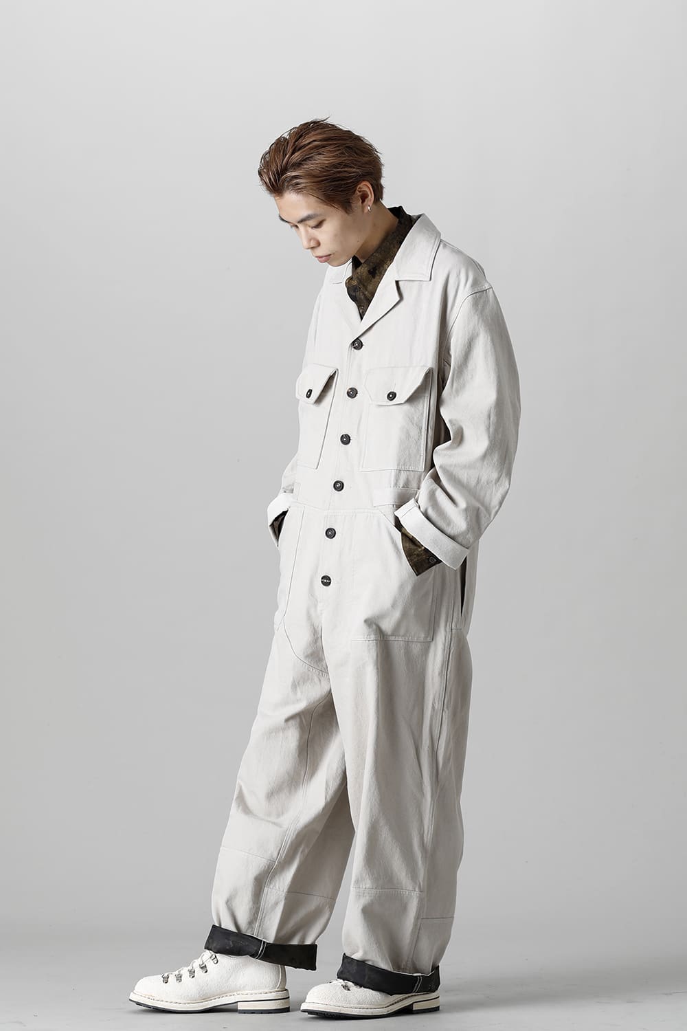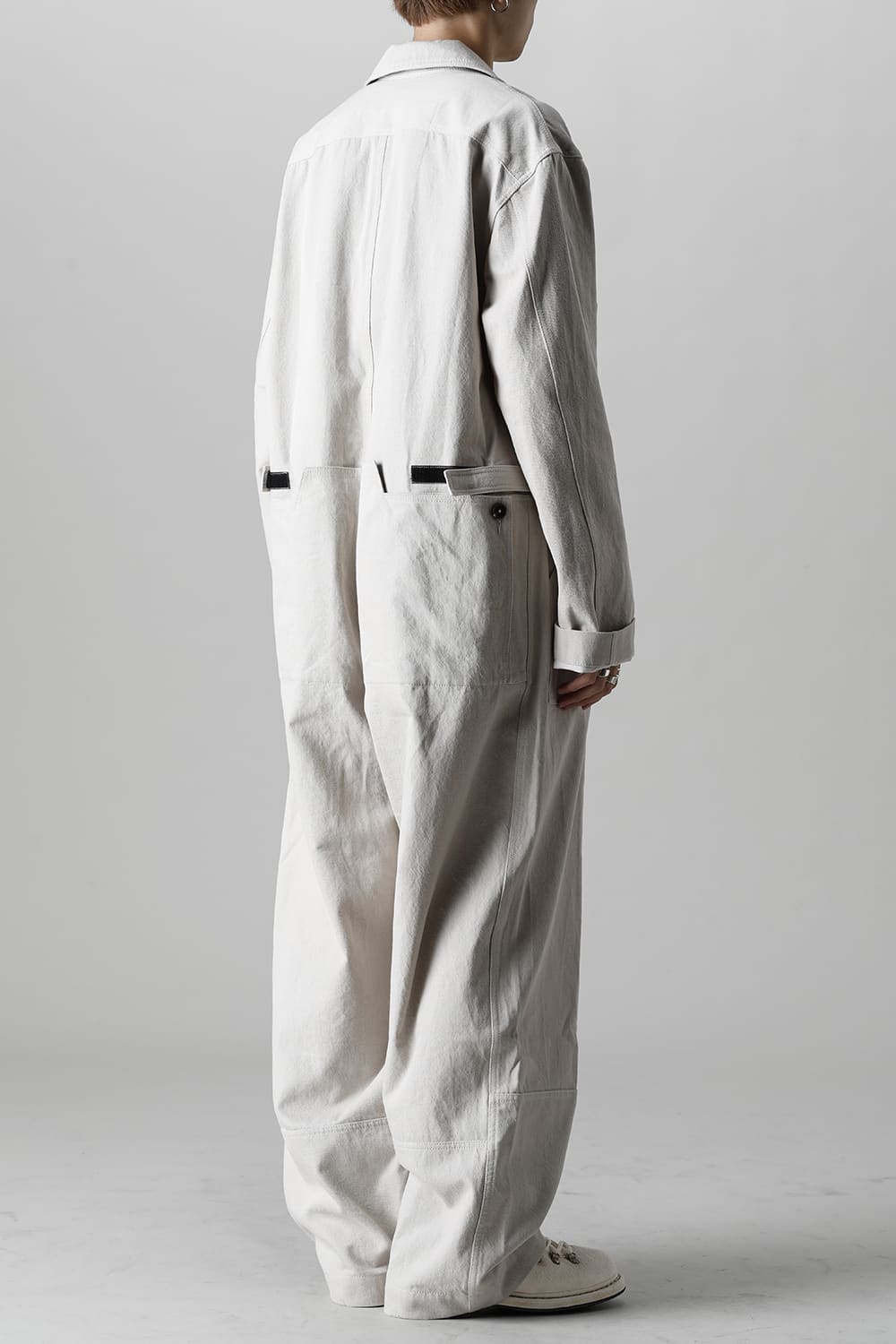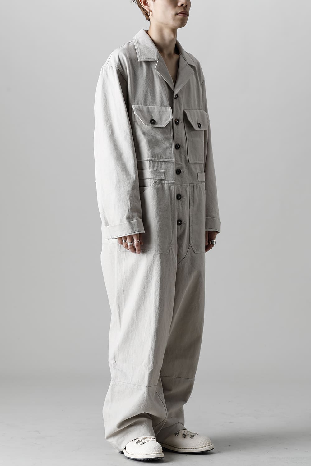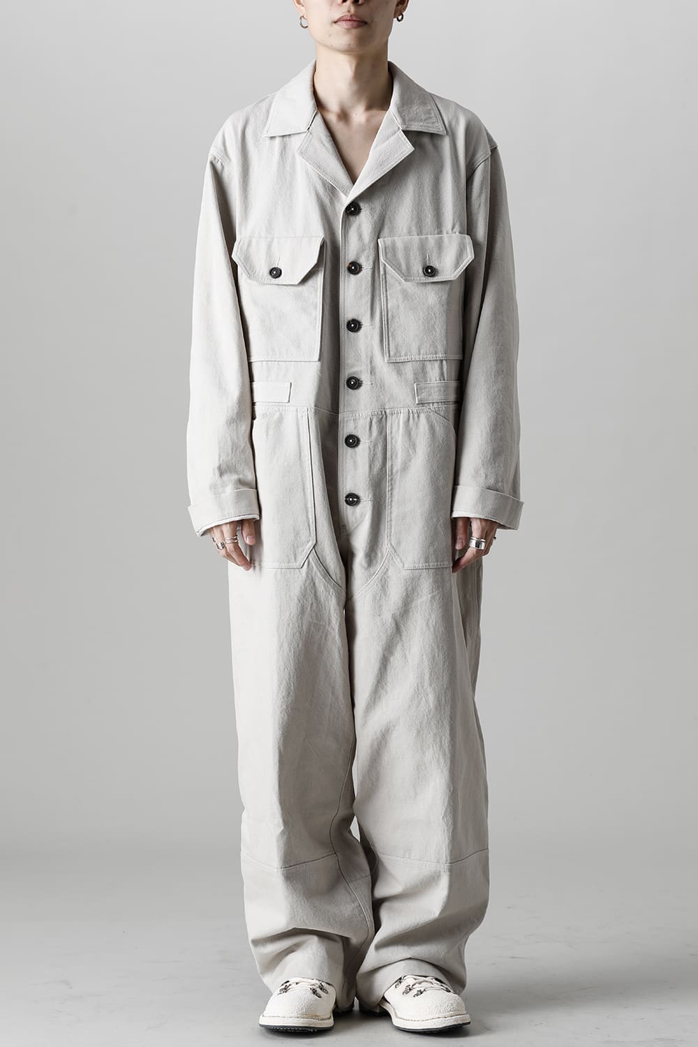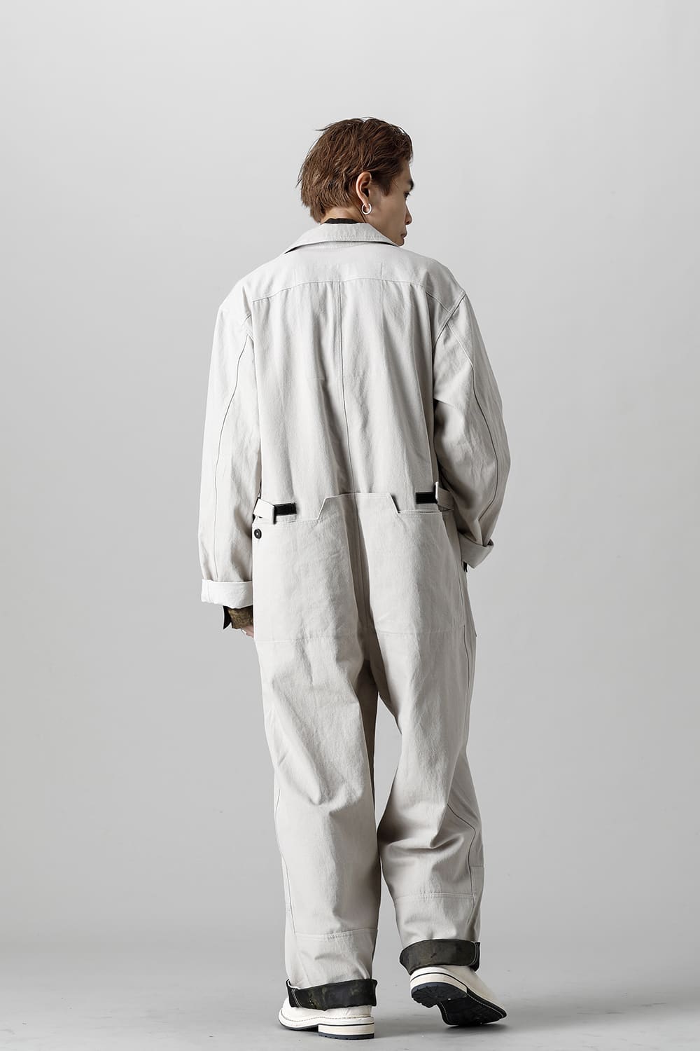 ベリーオーバーサイズフィットで製作されたジャンプスーツ。 生地は太番手のコットン糸で織り上げたドリル生地を使用しており、堅牢でドライタッチな質感。 襟元は下衿のあるスモールラペル仕様で今期展開しているスプレッドカラーシャツと相性良く合わせていただけます。 ヒップにはボタン着脱可能なラップディテールがデザインされており、今期のコンセプトのである"SUGARDEN"に由来する蘇州古典庭園の建造物からヒントを得て表現したかったという階層的構造をウェアのデザインとして取り入れた物です。 また、ラップディテールの内側には、太湖石をプリントした細番手コットンウールツイル生地が裏打ちされており、 裾裏地にはデザイナー自らが蘇州古典庭園の風景を撮影した写真を元にデジタルプリントを施したポリエステルツイル生地が使用されているなど、ロールアップやラップディテールの開閉によって様々な表情が楽しめる一着となっています。