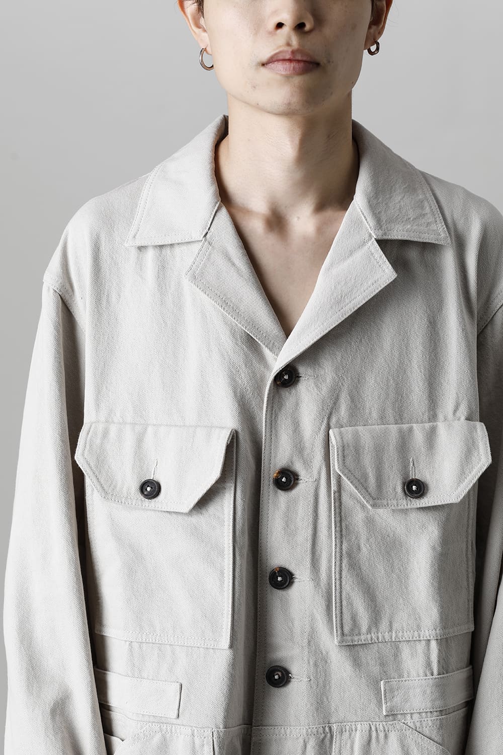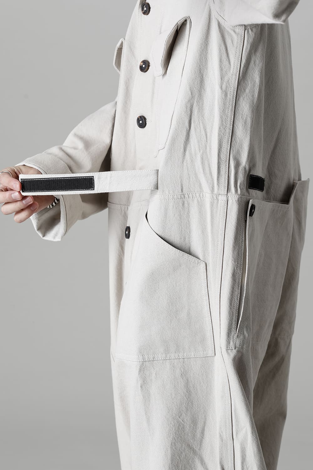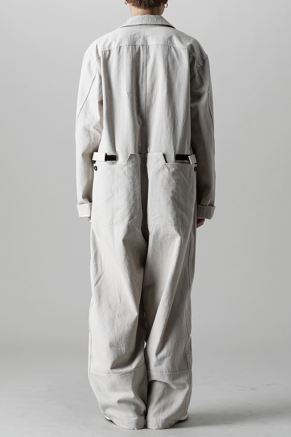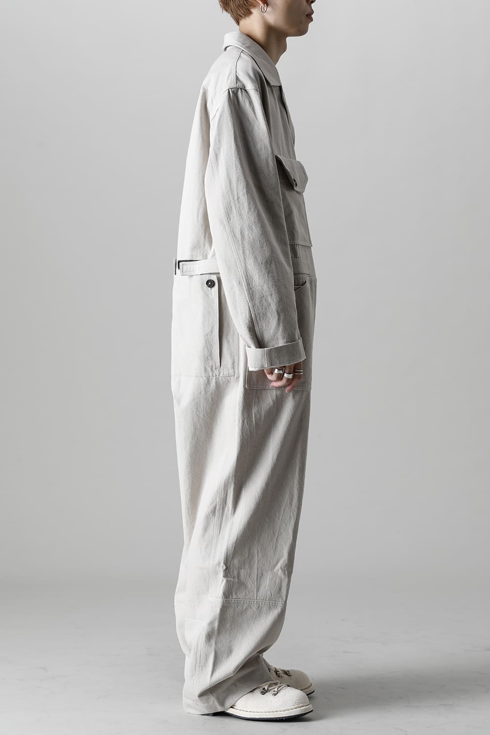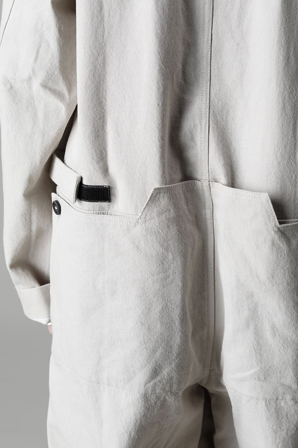 ベリーオーバーサイズフィットで製作されたジャンプスーツ。 生地は太番手のコットン糸で織り上げたドリル生地を使用しており、堅牢でドライタッチな質感。 襟元は下衿のあるスモールラペル仕様で今期展開しているスプレッドカラーシャツと相性良く合わせていただけます。 ヒップにはボタン着脱可能なラップディテールがデザインされており、今期のコンセプトのである"SUGARDEN"に由来する蘇州古典庭園の建造物からヒントを得て表現したかったという階層的構造をウェアのデザインとして取り入れた物です。 また、ラップディテールの内側には、太湖石をプリントした細番手コットンウールツイル生地が裏打ちされており、 裾裏地にはデザイナー自らが蘇州古典庭園の風景を撮影した写真を元にデジタルプリントを施したポリエステルツイル生地が使用されているなど、ロールアップやラップディテールの開閉によって様々な表情が楽しめる一着となっています。