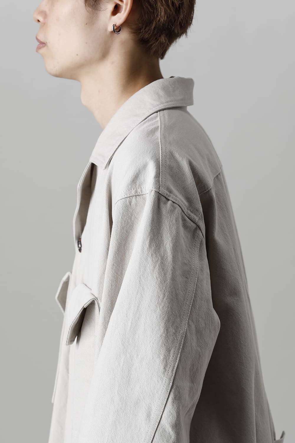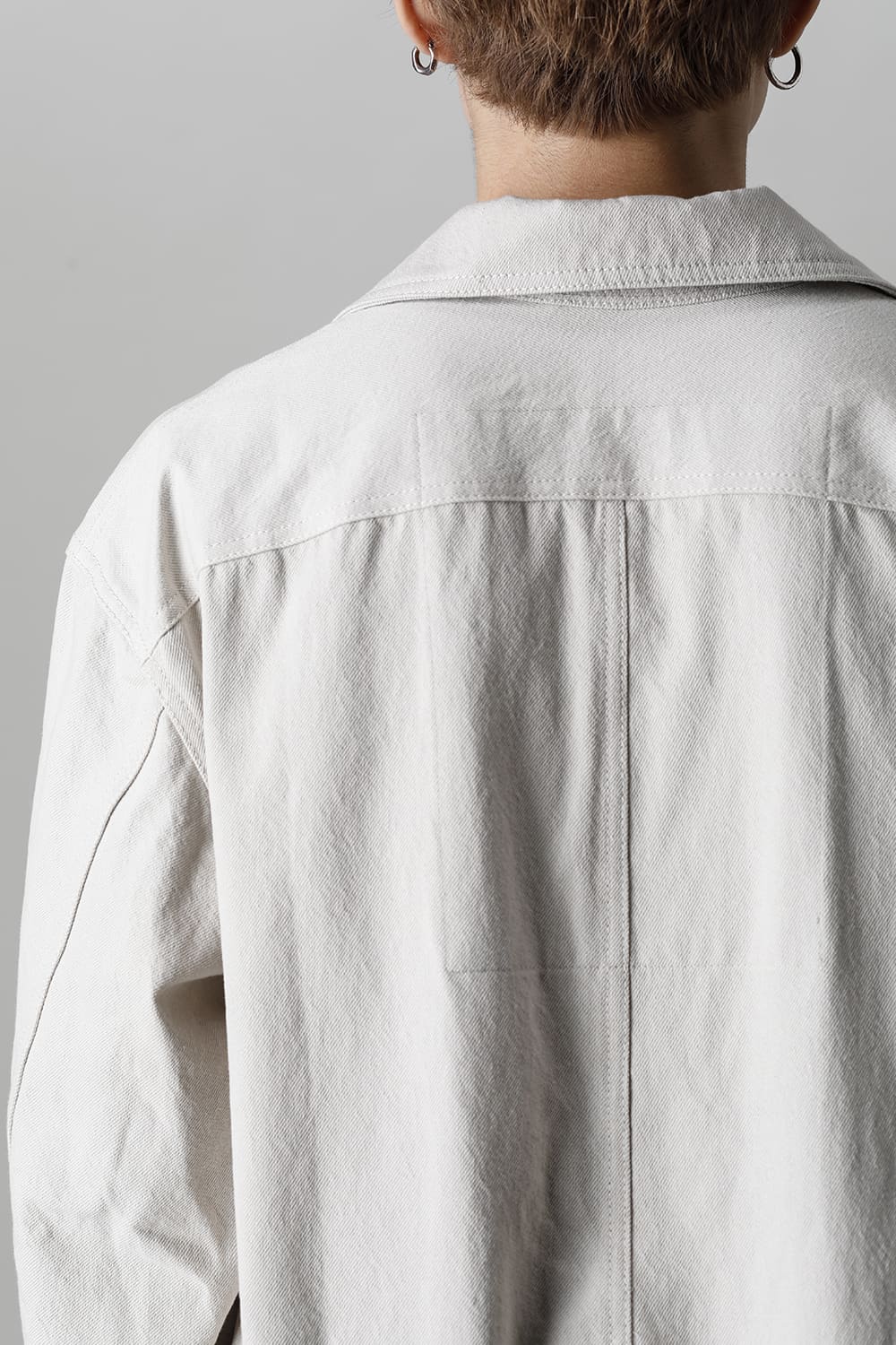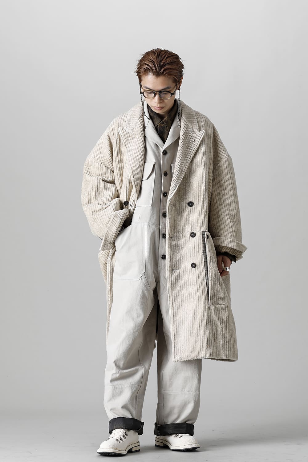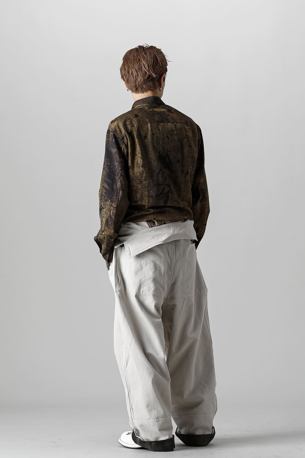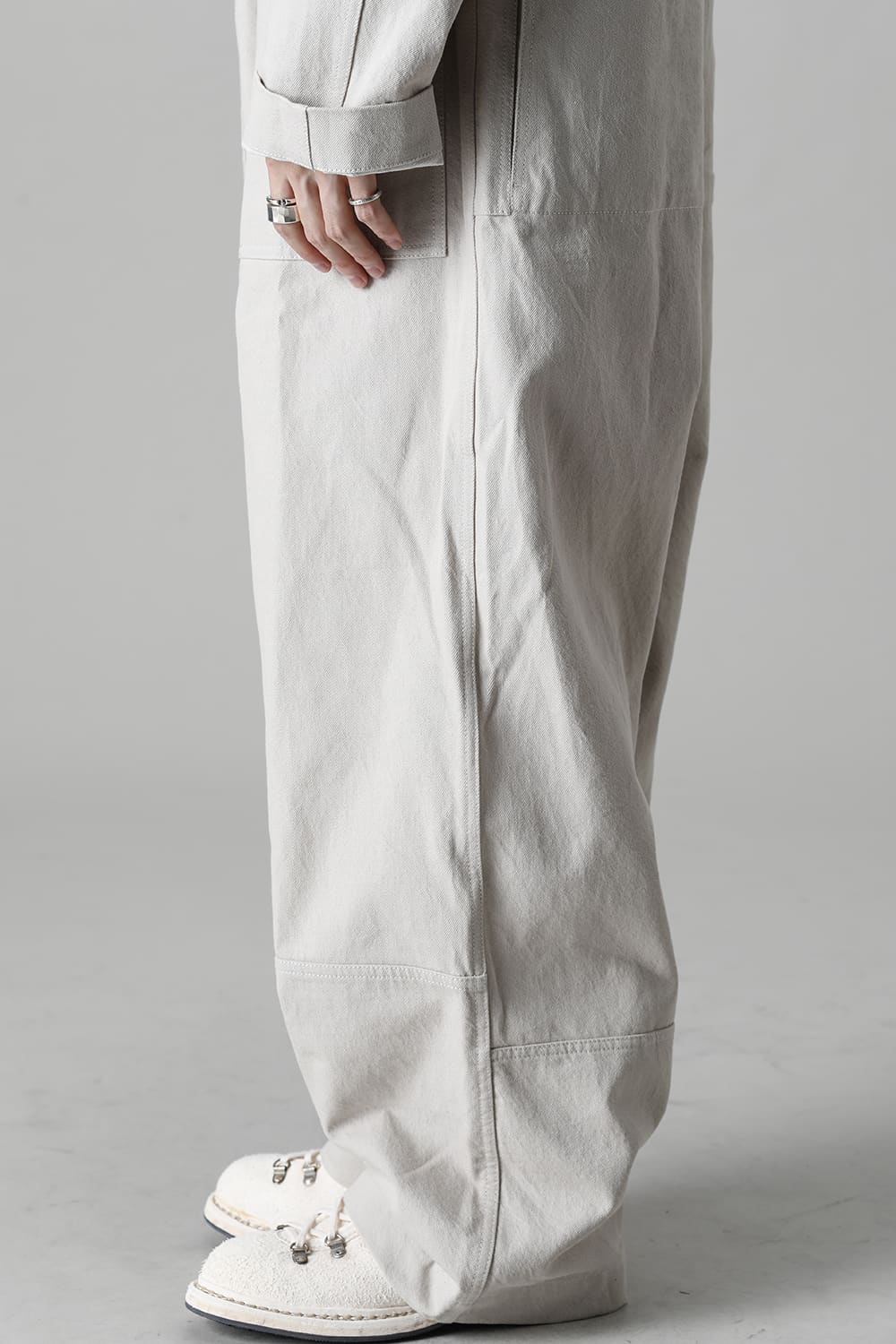 ベリーオーバーサイズフィットで製作されたジャンプスーツ。 生地は太番手のコットン糸で織り上げたドリル生地を使用しており、堅牢でドライタッチな質感。 襟元は下衿のあるスモールラペル仕様で今期展開しているスプレッドカラーシャツと相性良く合わせていただけます。 ヒップにはボタン着脱可能なラップディテールがデザインされており、今期のコンセプトのである"SUGARDEN"に由来する蘇州古典庭園の建造物からヒントを得て表現したかったという階層的構造をウェアのデザインとして取り入れた物です。 また、ラップディテールの内側には、太湖石をプリントした細番手コットンウールツイル生地が裏打ちされており、 裾裏地にはデザイナー自らが蘇州古典庭園の風景を撮影した写真を元にデジタルプリントを施したポリエステルツイル生地が使用されているなど、ロールアップやラップディテールの開閉によって様々な表情が楽しめる一着となっています。