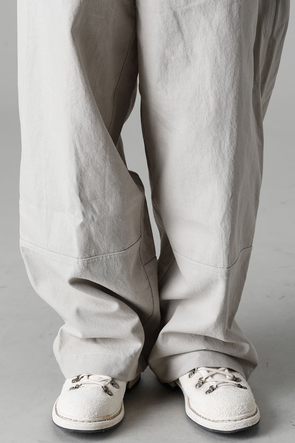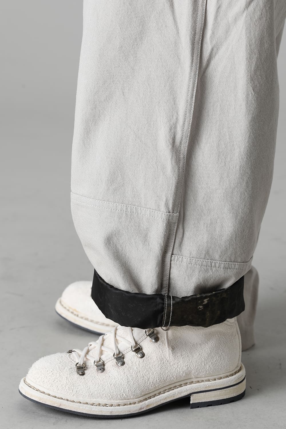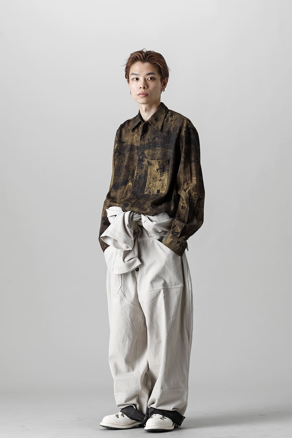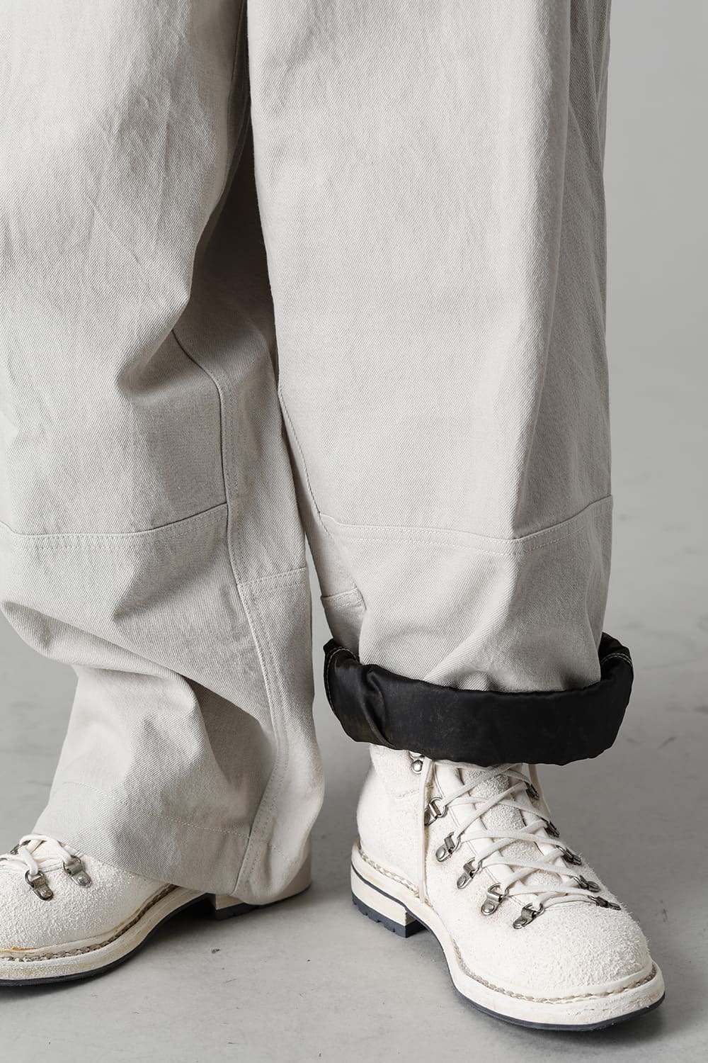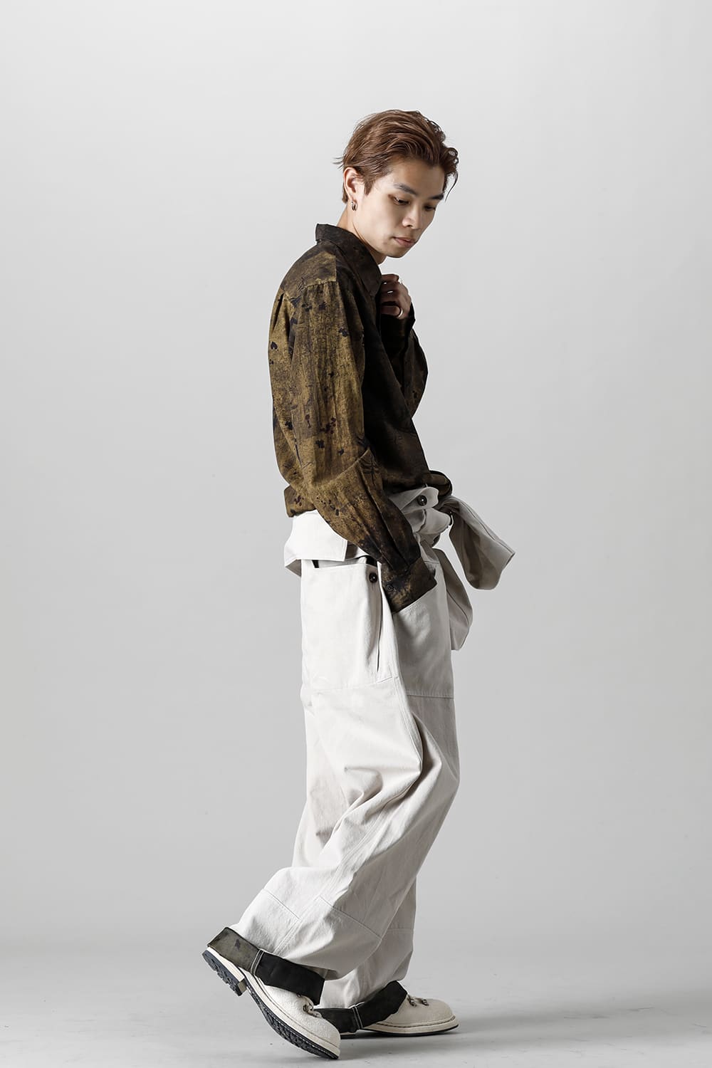 ベリーオーバーサイズフィットで製作されたジャンプスーツ。 生地は太番手のコットン糸で織り上げたドリル生地を使用しており、堅牢でドライタッチな質感。 襟元は下衿のあるスモールラペル仕様で今期展開しているスプレッドカラーシャツと相性良く合わせていただけます。 ヒップにはボタン着脱可能なラップディテールがデザインされており、今期のコンセプトのである"SUGARDEN"に由来する蘇州古典庭園の建造物からヒントを得て表現したかったという階層的構造をウェアのデザインとして取り入れた物です。 また、ラップディテールの内側には、太湖石をプリントした細番手コットンウールツイル生地が裏打ちされており、 裾裏地にはデザイナー自らが蘇州古典庭園の風景を撮影した写真を元にデジタルプリントを施したポリエステルツイル生地が使用されているなど、ロールアップやラップディテールの開閉によって様々な表情が楽しめる一着となっています。