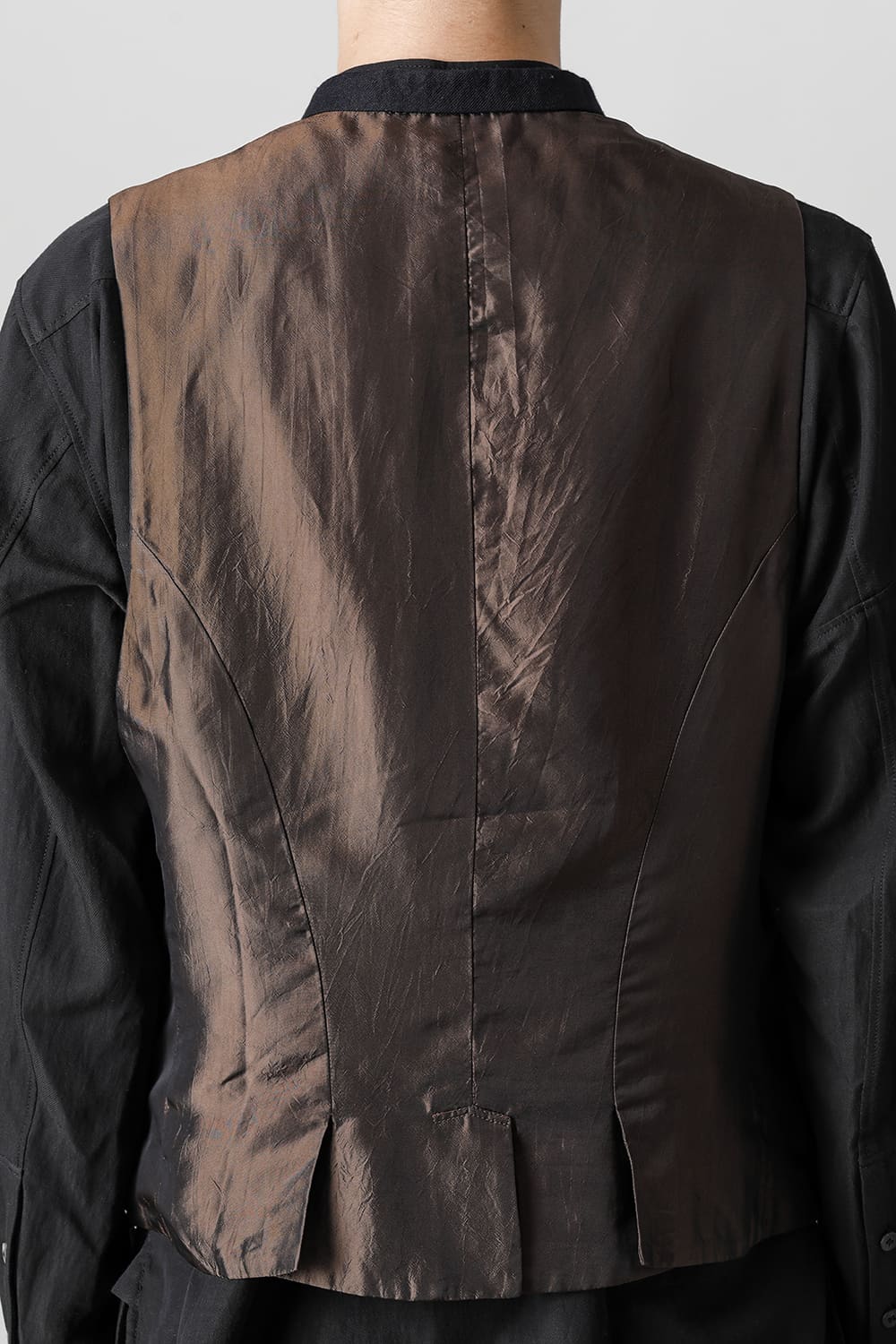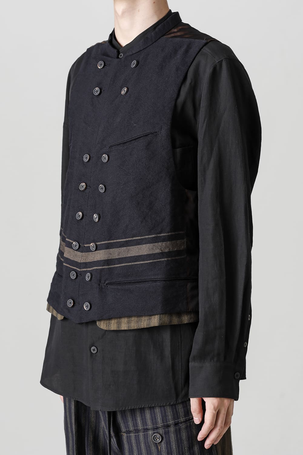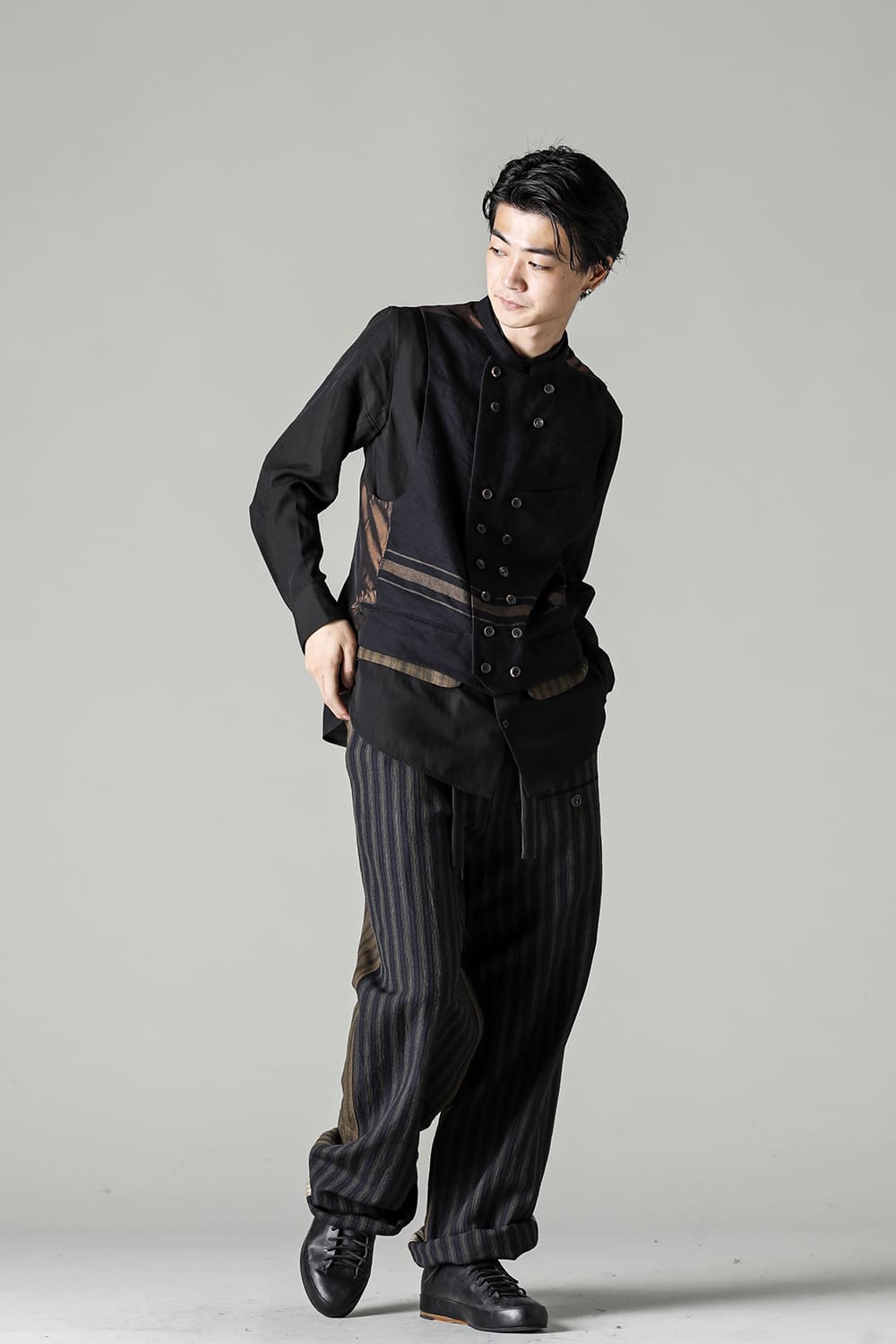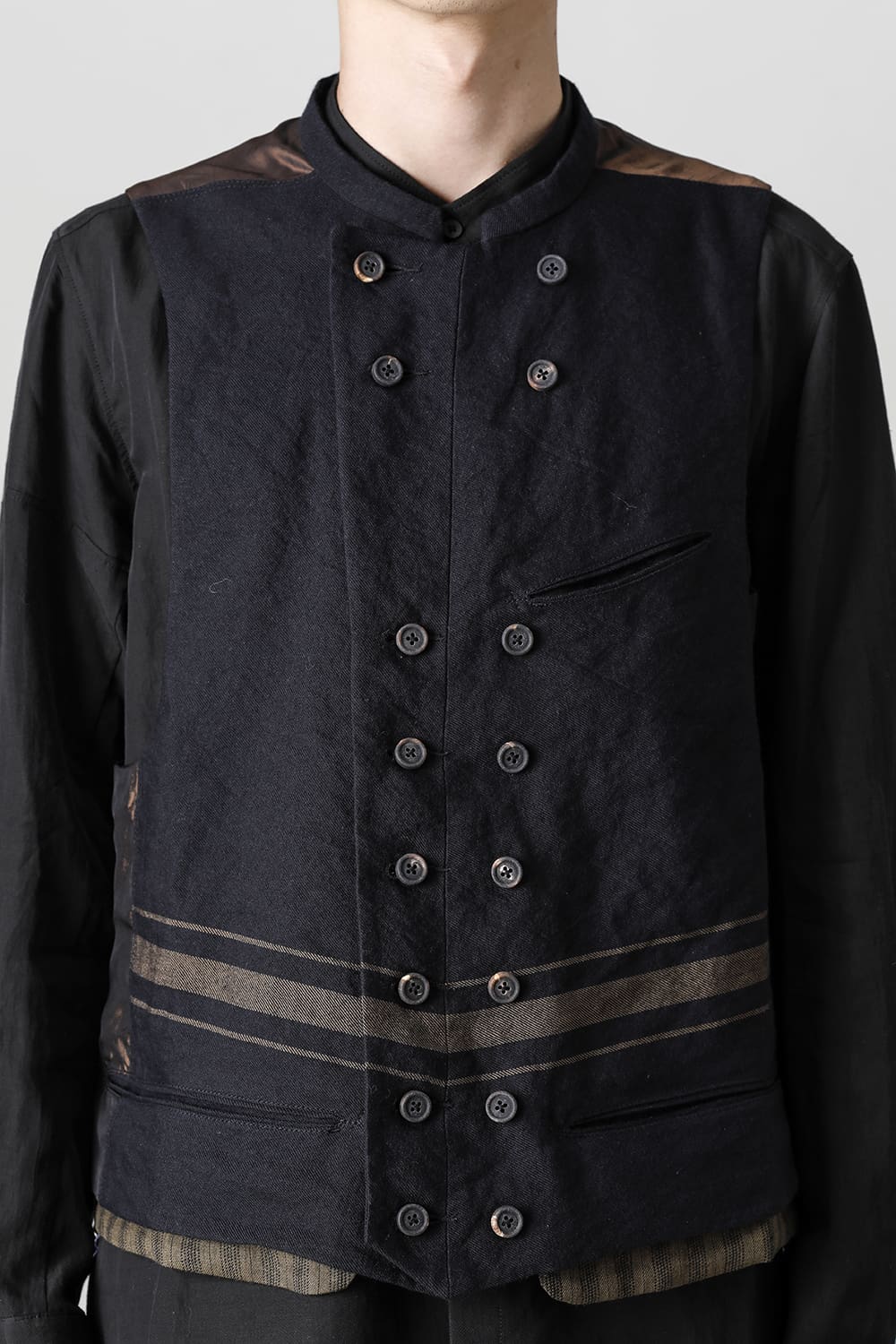 マンダリンカラー、レギュラーフィットのダブルブレストベスト。多くのボタンで構成されたフロントデザインが印象的ですが、バックはキュプラ素材の3スリットのみというシンプルなデザイン。ポケットはスタイリッシュなジェッテッドポケットを3ヶ所に配置し、全体のデザインを引き立てつつユーザビリティが確保されています。フロントポケットの袋生地が裾から見えるようデザインされています。素材はコットン、ヴァージンウール、金属繊維がブレンドされたギャバジンで、深みのあるブラックとストライプデザインが美しく際立つように染色されています。裏地は非常にクールで滑らかな手触りの軽量キュプラカルゼ。