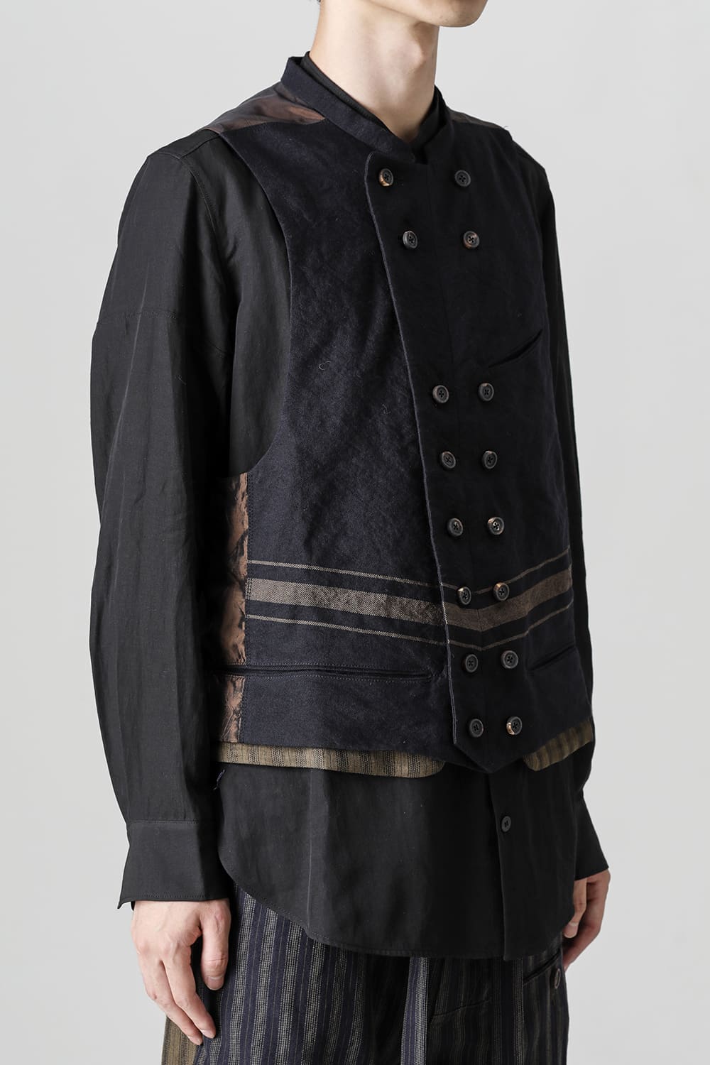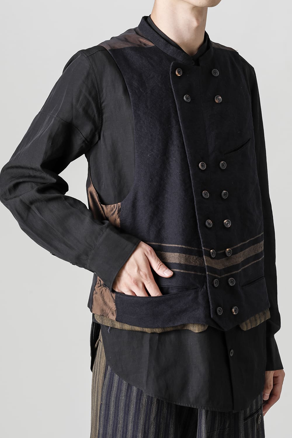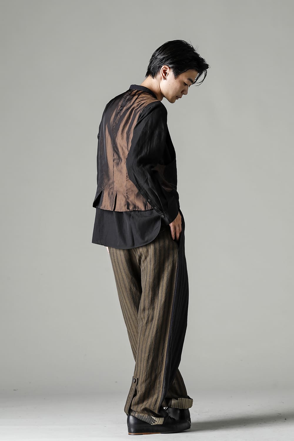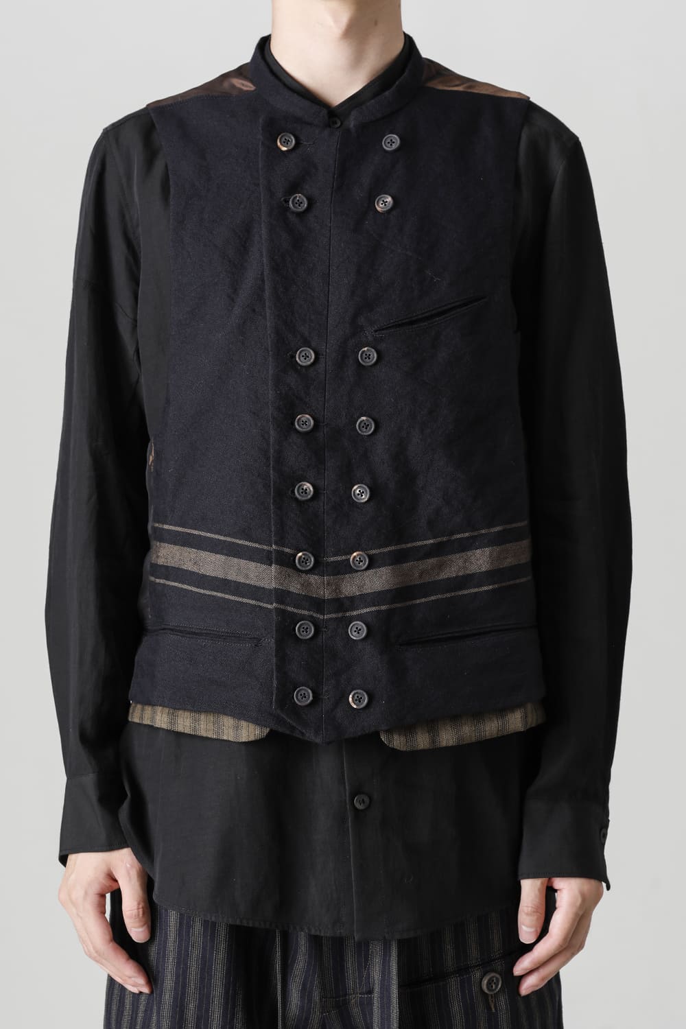 マンダリンカラー、レギュラーフィットのダブルブレストベスト。多くのボタンで構成されたフロントデザインが印象的ですが、バックはキュプラ素材の3スリットのみというシンプルなデザイン。ポケットはスタイリッシュなジェッテッドポケットを3ヶ所に配置し、全体のデザインを引き立てつつユーザビリティが確保されています。フロントポケットの袋生地が裾から見えるようデザインされています。素材はコットン、ヴァージンウール、金属繊維がブレンドされたギャバジンで、深みのあるブラックとストライプデザインが美しく際立つように染色されています。裏地は非常にクールで滑らかな手触りの軽量キュプラカルゼ。