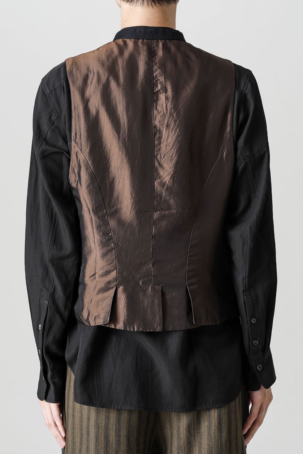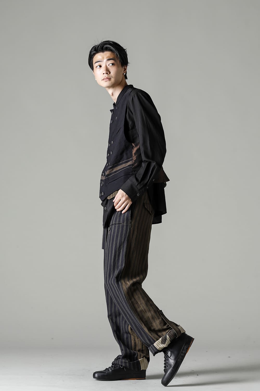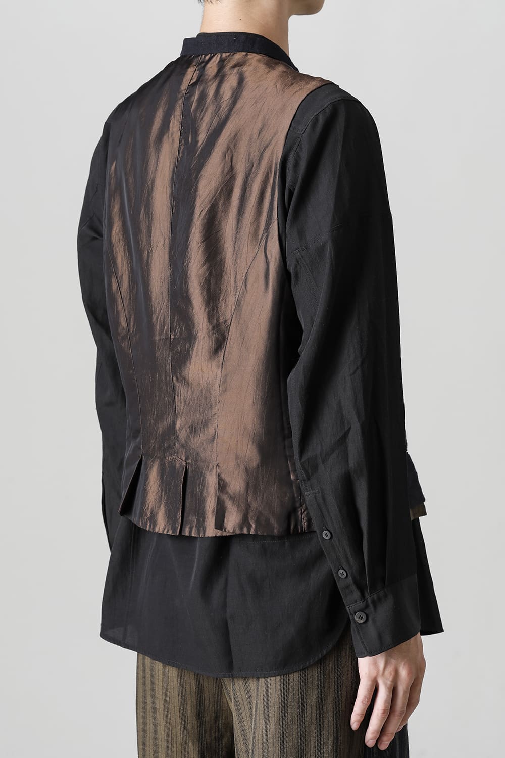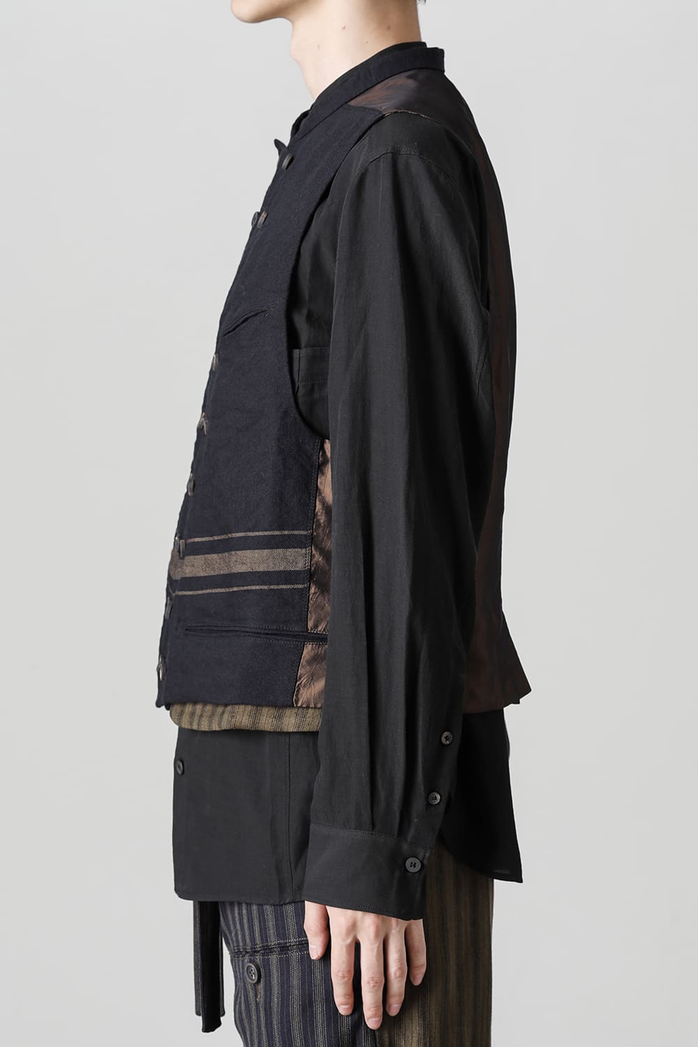マンダリンカラー、レギュラーフィットのダブルブレストベスト。多くのボタンで構成されたフロントデザインが印象的ですが、バックはキュプラ素材の3スリットのみというシンプルなデザイン。ポケットはスタイリッシュなジェッテッドポケットを3ヶ所に配置し、全体のデザインを引き立てつつユーザビリティが確保されています。フロントポケットの袋生地が裾から見えるようデザインされています。素材はコットン、ヴァージンウール、金属繊維がブレンドされたギャバジンで、深みのあるブラックとストライプデザインが美しく際立つように染色されています。裏地は非常にクールで滑らかな手触りの軽量キュプラカルゼ。