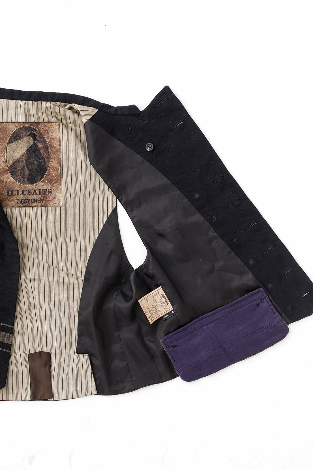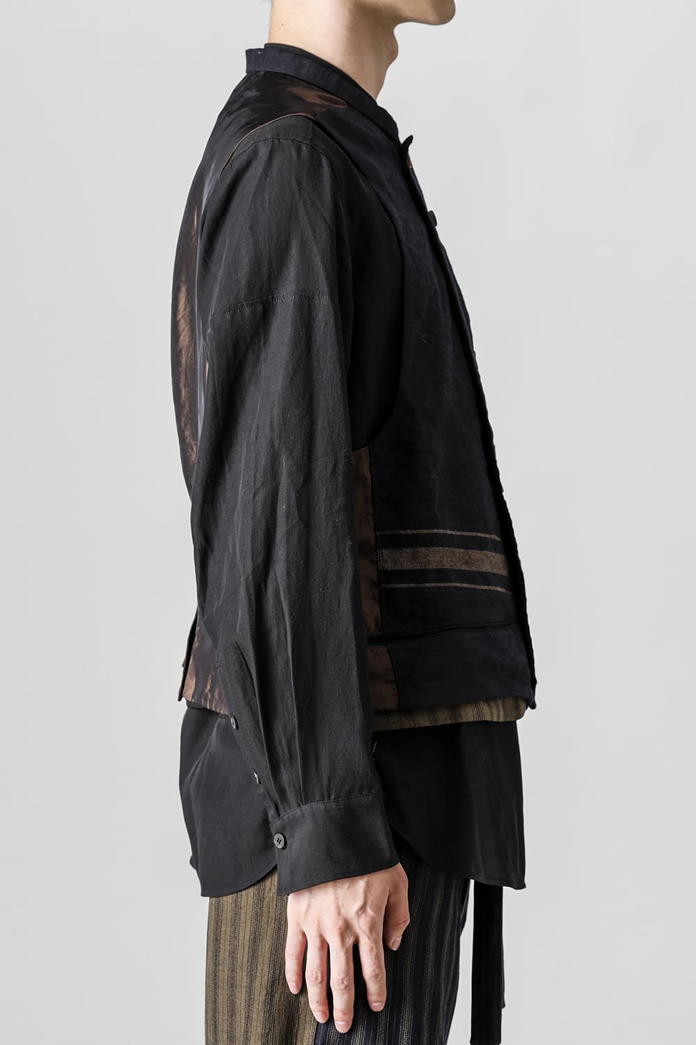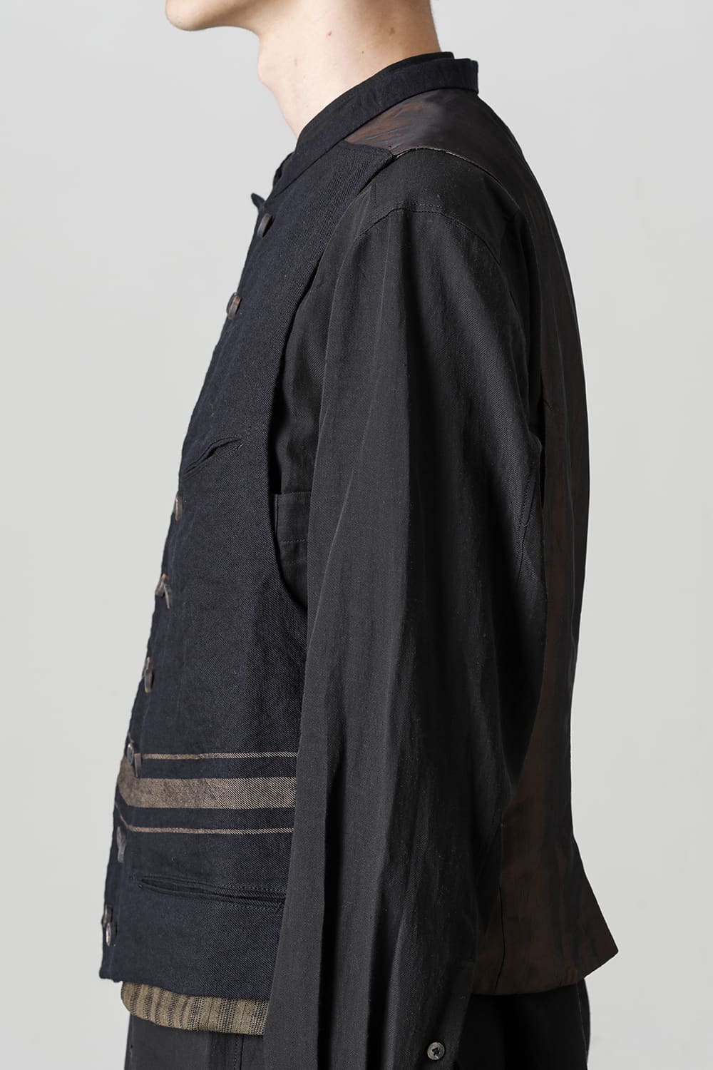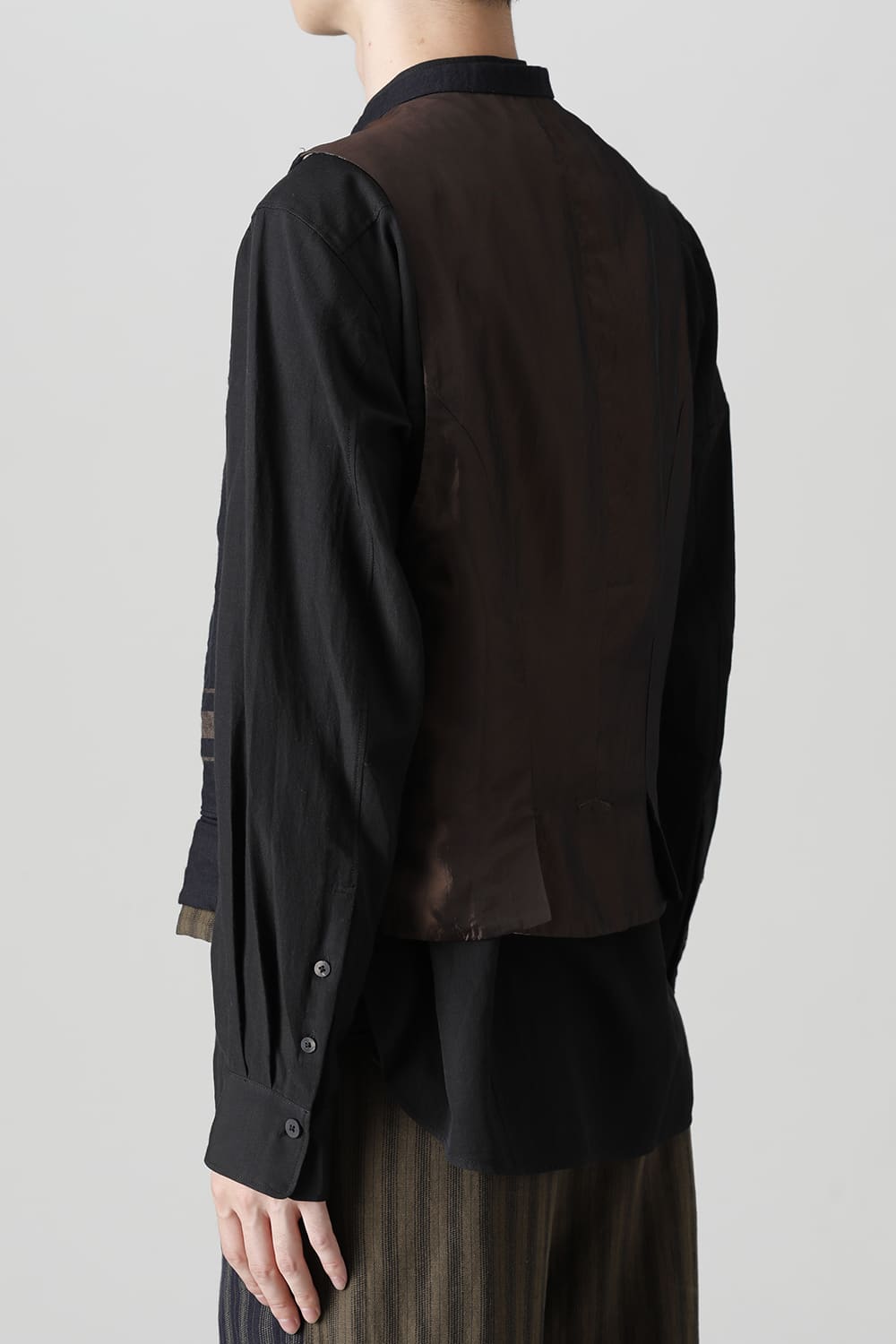 マンダリンカラー、レギュラーフィットのダブルブレストベスト。多くのボタンで構成されたフロントデザインが印象的ですが、バックはキュプラ素材の3スリットのみというシンプルなデザイン。ポケットはスタイリッシュなジェッテッドポケットを3ヶ所に配置し、全体のデザインを引き立てつつユーザビリティが確保されています。フロントポケットの袋生地が裾から見えるようデザインされています。素材はコットン、ヴァージンウール、金属繊維がブレンドされたギャバジンで、深みのあるブラックとストライプデザインが美しく際立つように染色されています。裏地は非常にクールで滑らかな手触りの軽量キュプラカルゼ。
