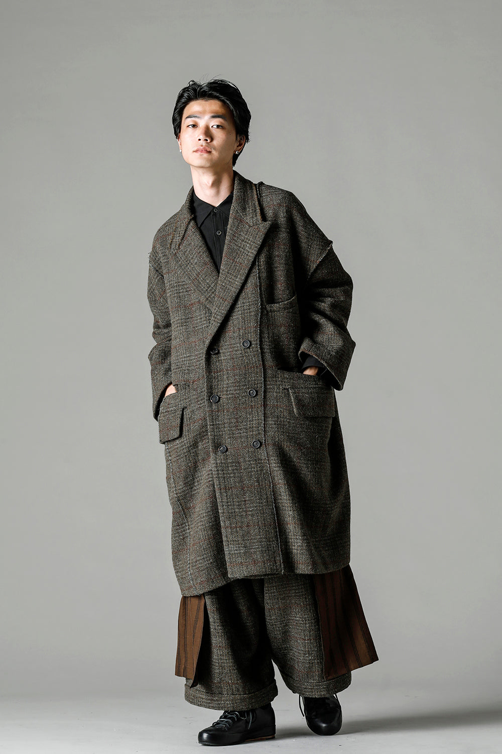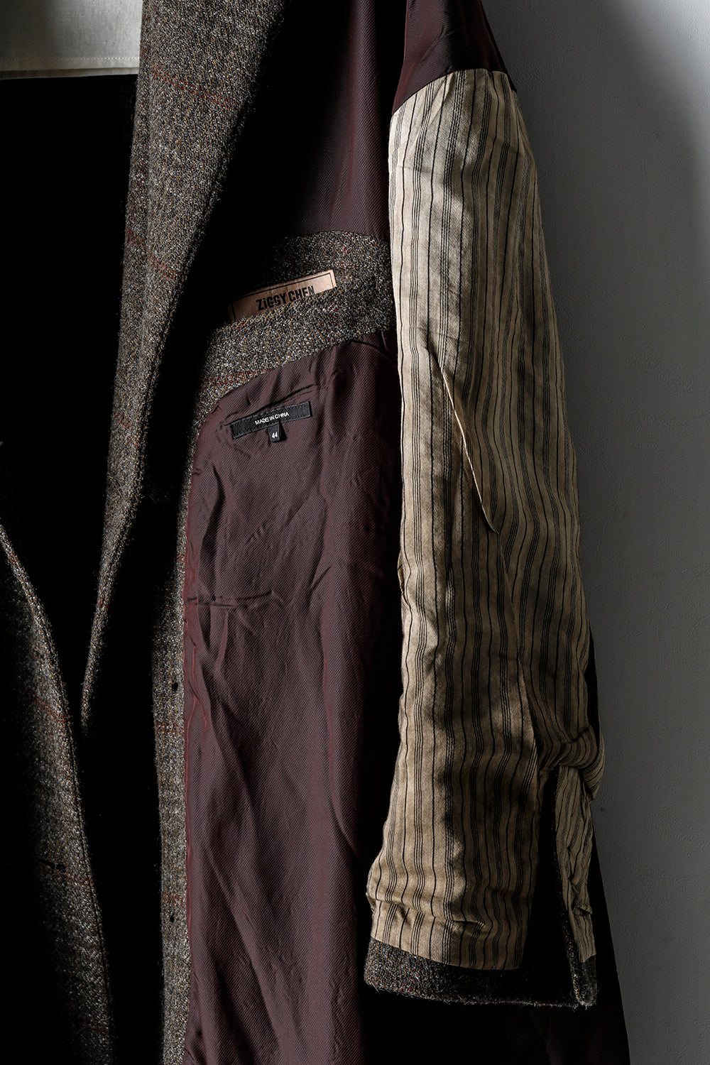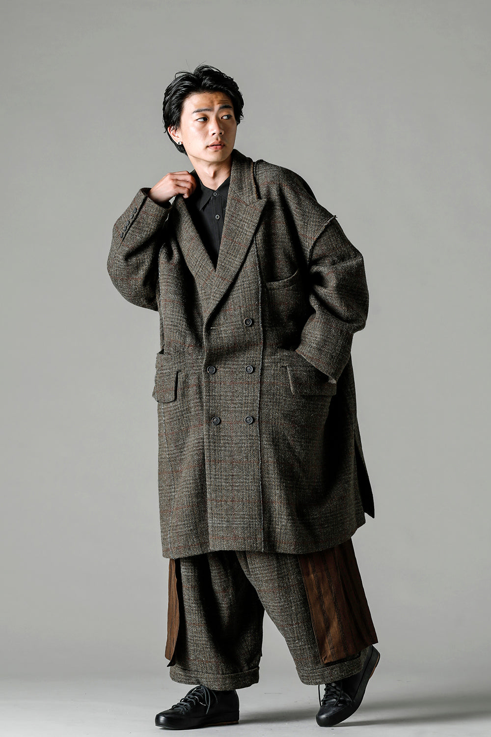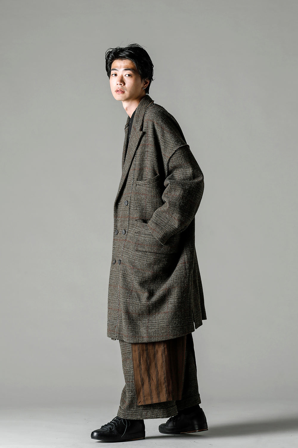 ZIGGY CHEN では21-22AWコレクション以降パターンや素材、細やかなディテールを変更しながらも継続展開され続けているダブルブレステッドのピークドラペルオーバーサイズコート。