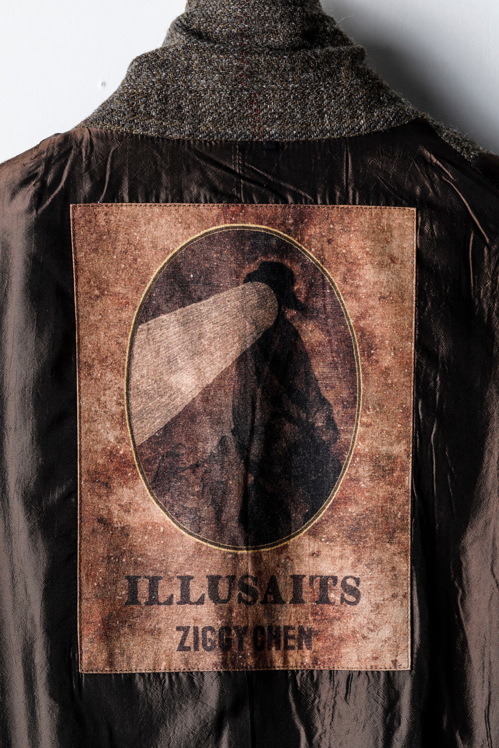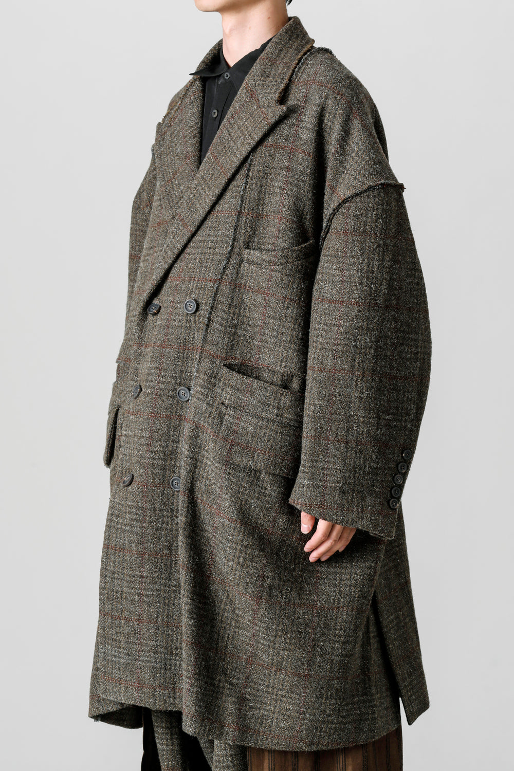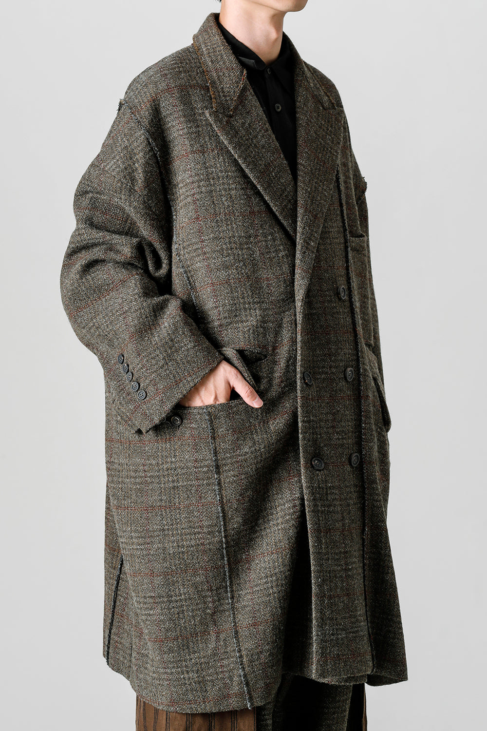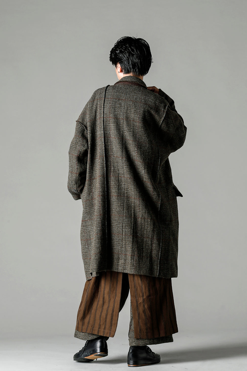 ZIGGY CHEN では21-22AWコレクション以降パターンや素材、細やかなディテールを変更しながらも継続展開され続けているダブルブレステッドのピークドラペルオーバーサイズコート。