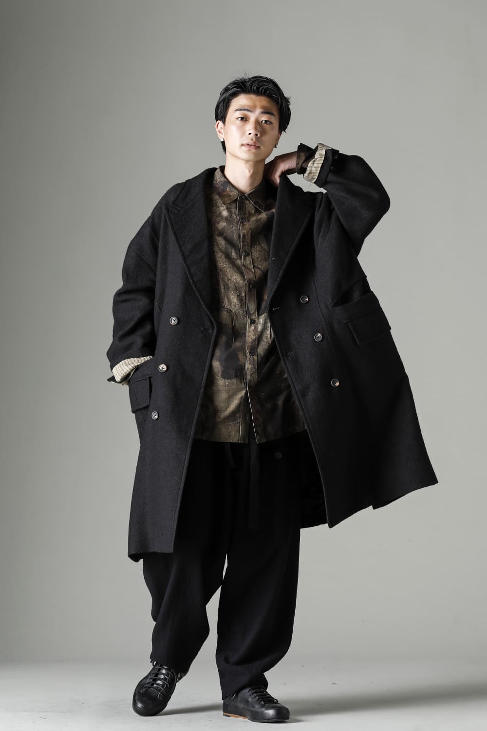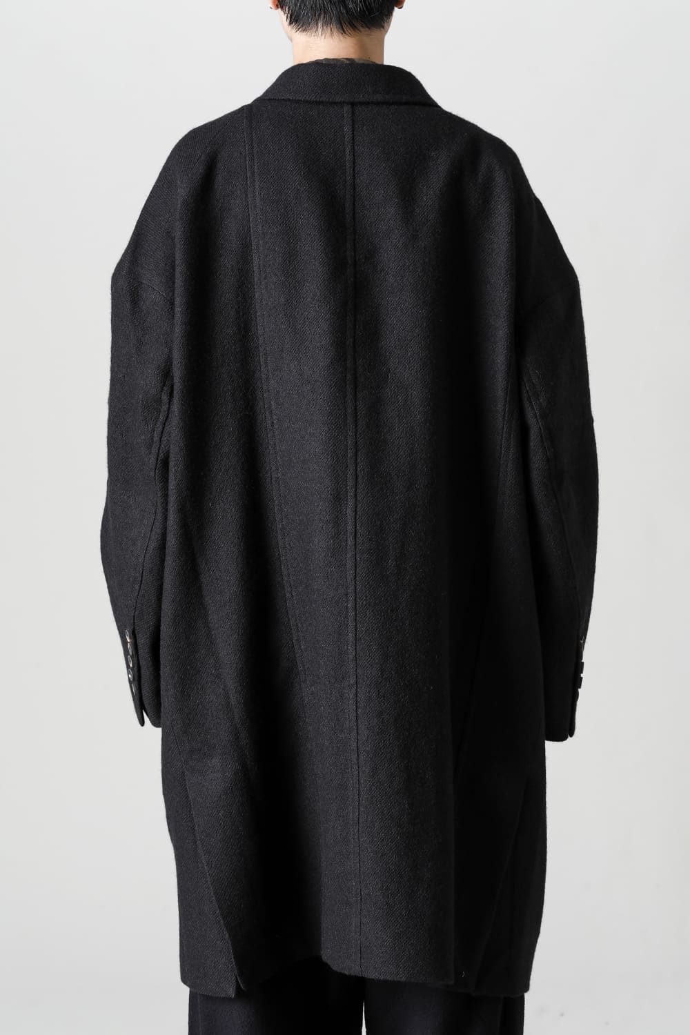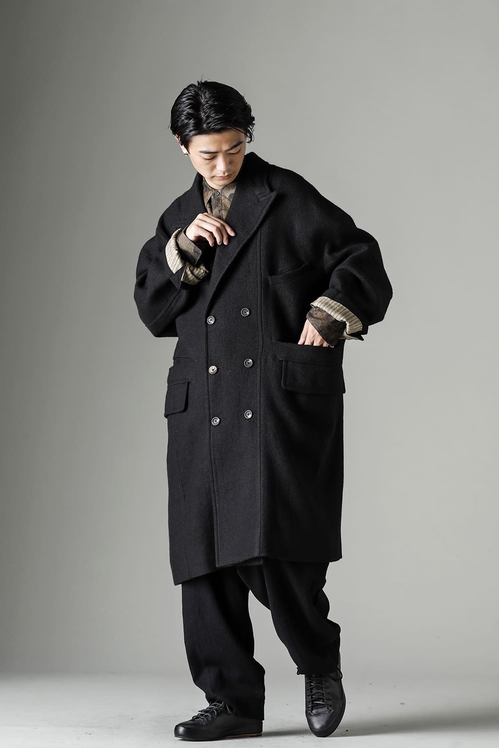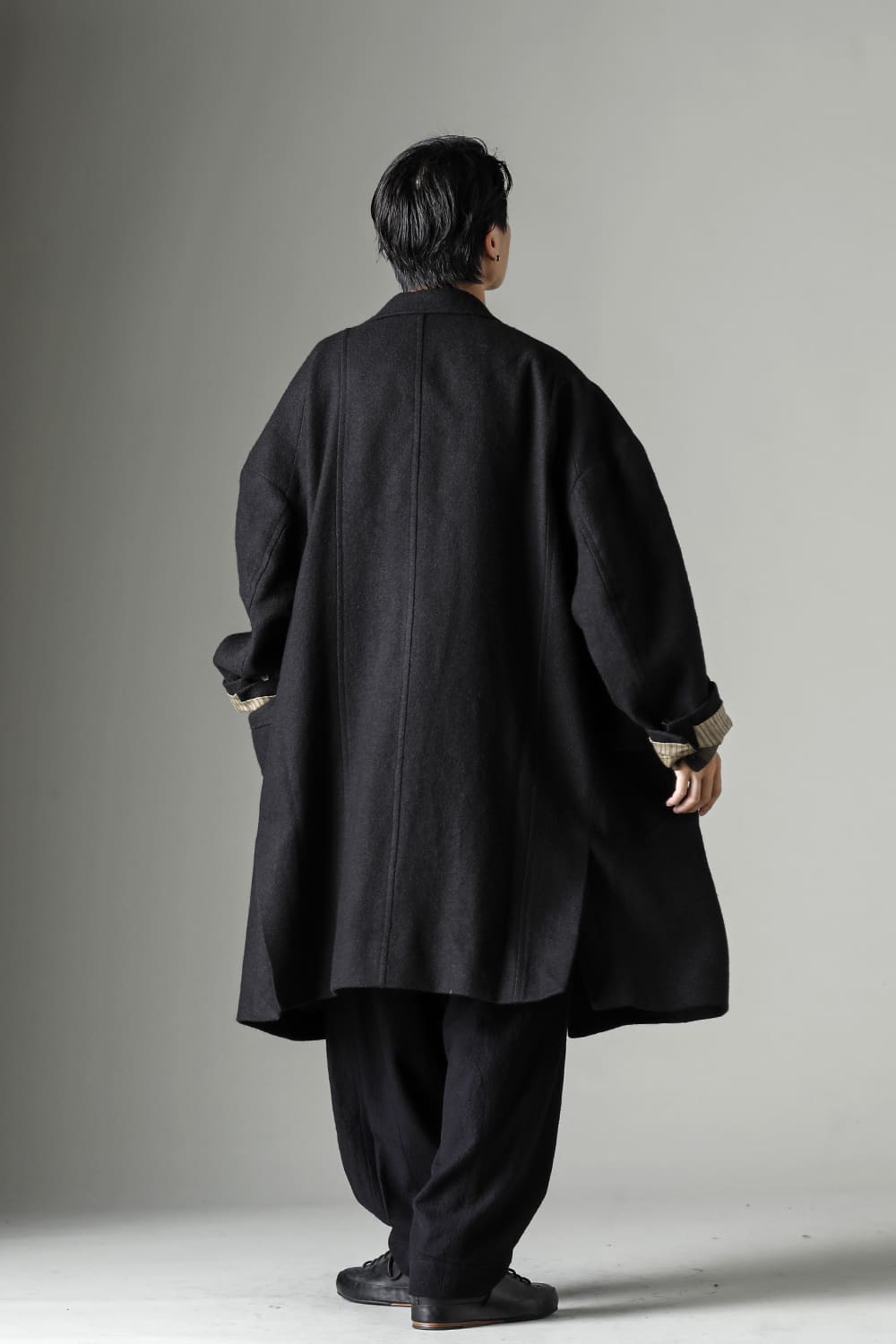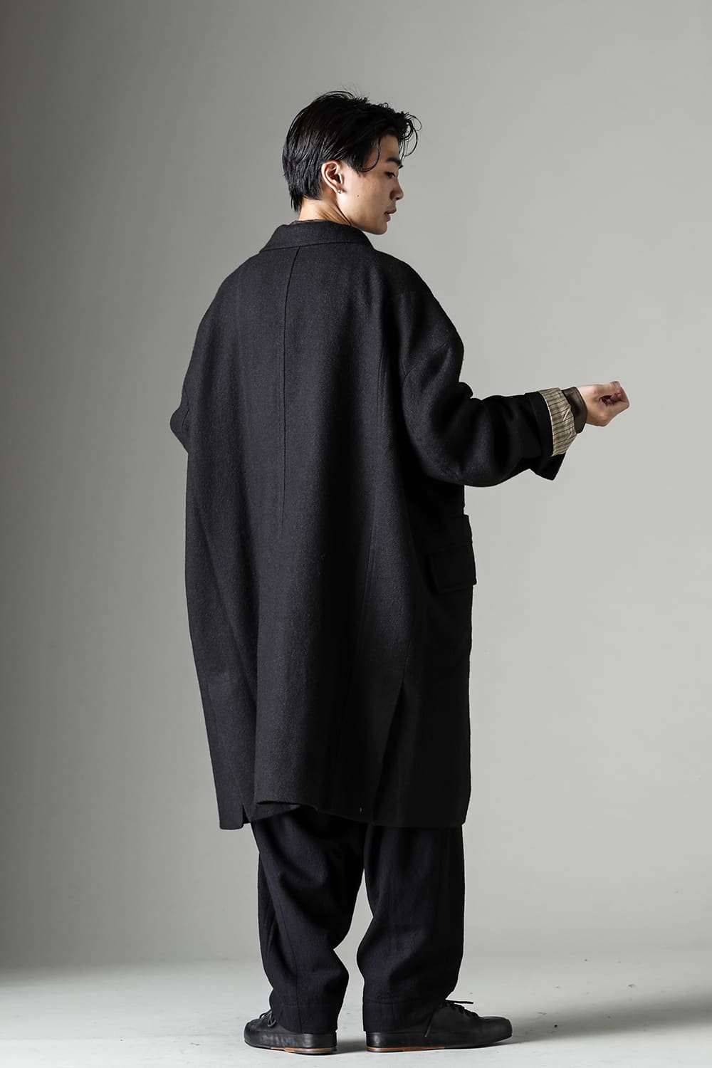 同ブランドを象徴するアウターウェアの一つともいえるオーバーサイズのダブルブレステッドピークドラペルコート。毎シーズン細かくパターンやデザイン、ファブリックを変更して展開されているコクーンシルエットが特徴のコートです。今期はヴァージンウール リネンの重厚なブラッシュドツイルを使用したベーシックなBLACKカラーで展開。柔らかなタッチとしっかりとした肉感のある生地ですので、冬本番でも安心感のある着用感です。一見ベーシックなオーバーサイズコートでありながら、左右のパターンが全く異なるアシンメトリーなパターンワークは同ブランドらしい遊び心のあるデザインです。身頃のサイドにはこれまで通りデザインされたフラップポケットに加えてジェッティドポケットを配置。しっかりと厚みがあり、ストーンウォッシュがかけられたホーンボタンと、シーズン性を曖昧にする意図で毎シーズン継続使用されているコットンキュプラのスリーブライニングなど、クラシックなZIGGY CHENのディテールも健在です。