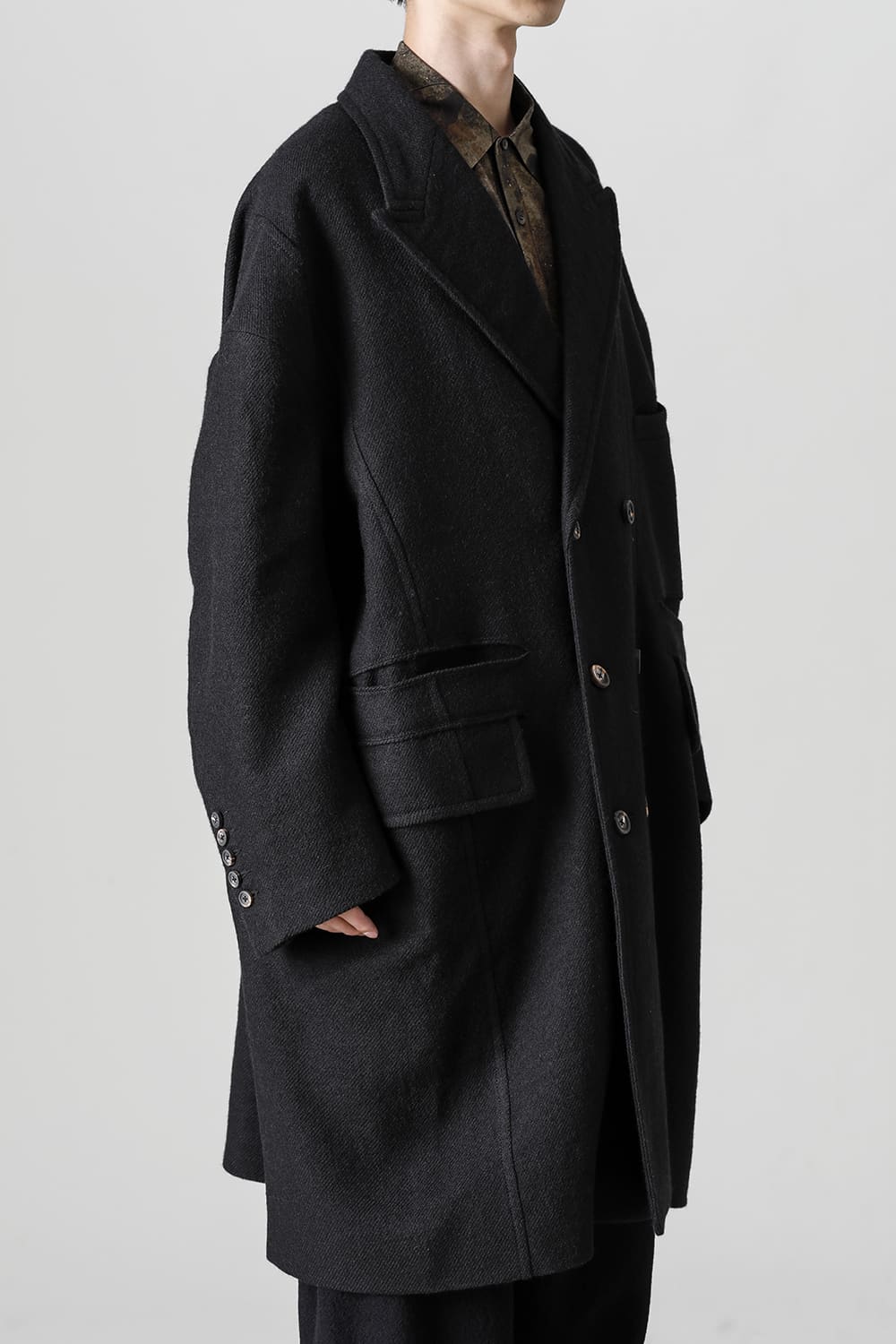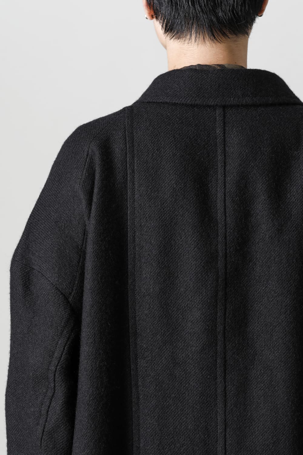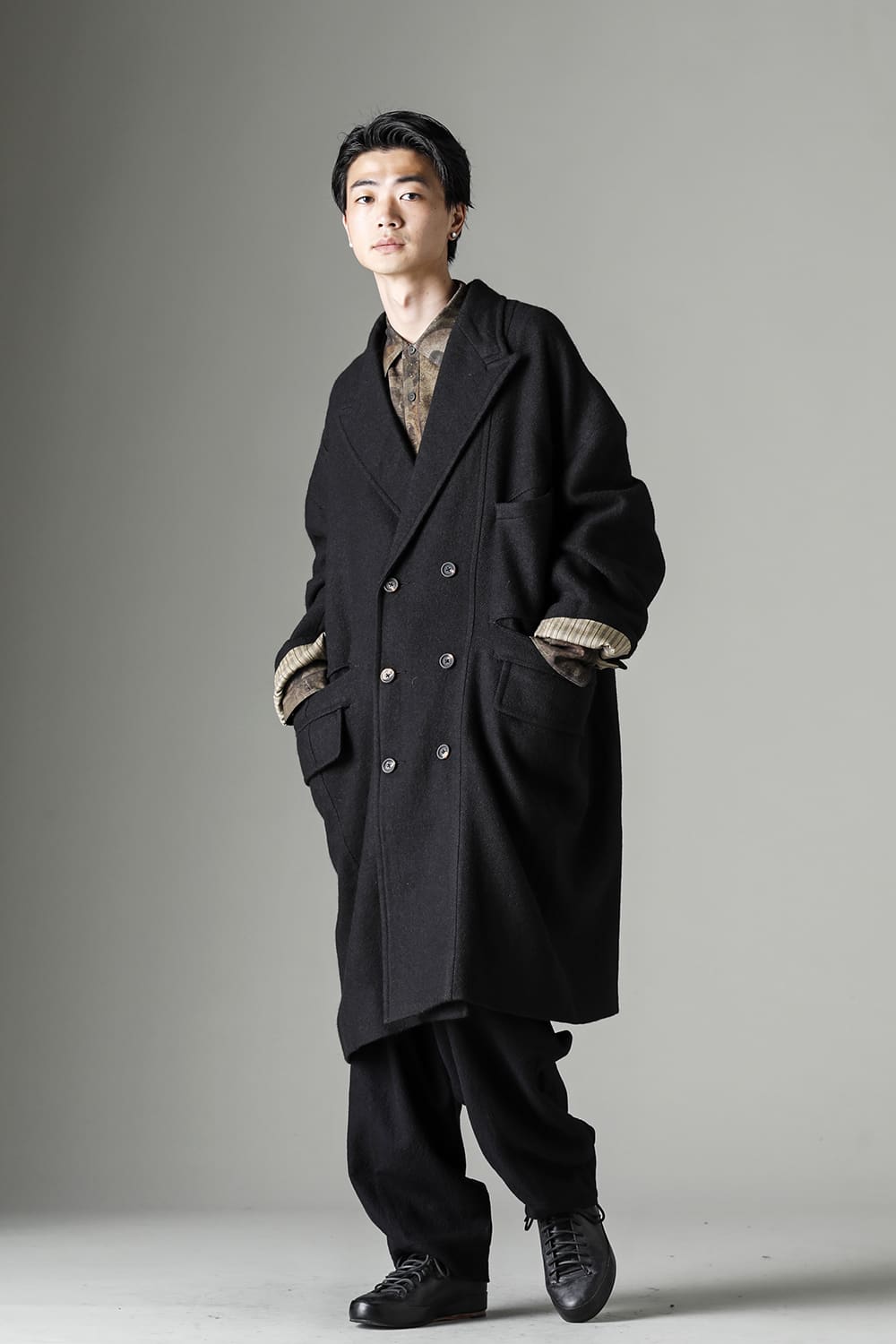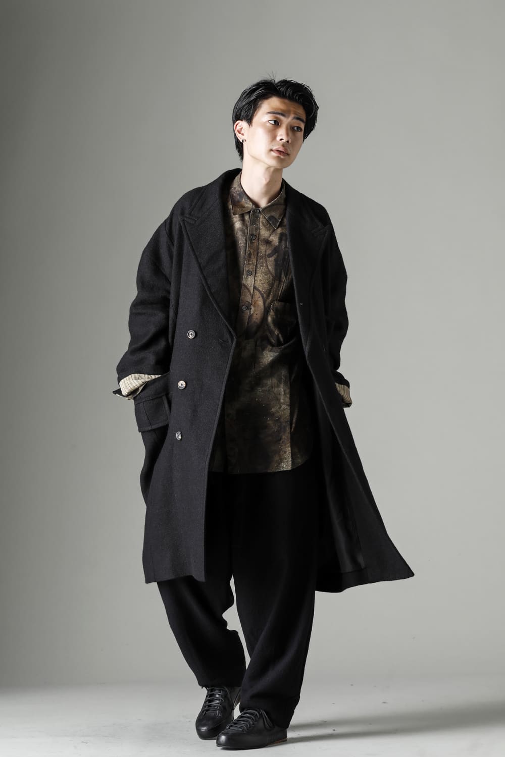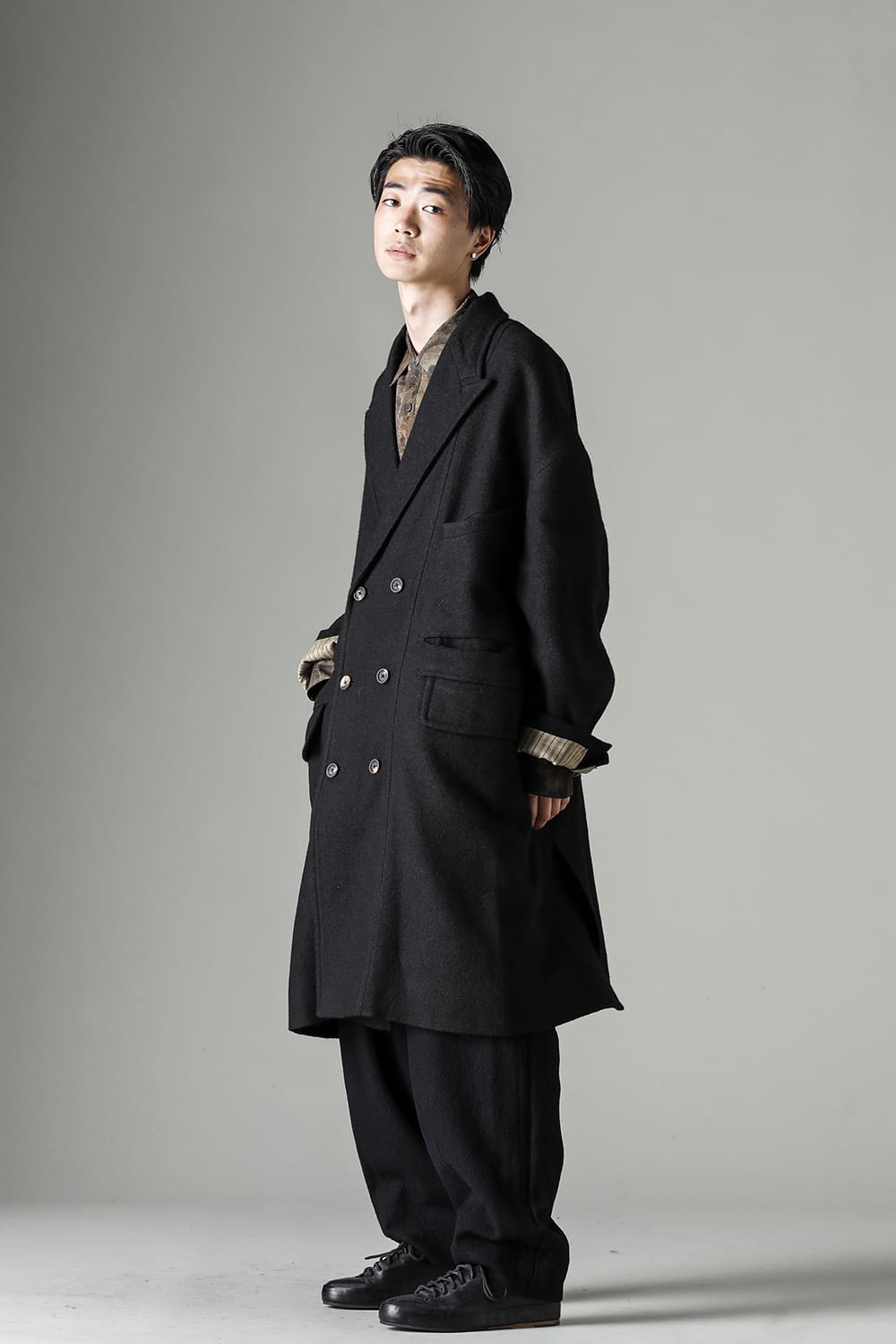 同ブランドを象徴するアウターウェアの一つともいえるオーバーサイズのダブルブレステッドピークドラペルコート。毎シーズン細かくパターンやデザイン、ファブリックを変更して展開されているコクーンシルエットが特徴のコートです。今期はヴァージンウール リネンの重厚なブラッシュドツイルを使用したベーシックなBLACKカラーで展開。柔らかなタッチとしっかりとした肉感のある生地ですので、冬本番でも安心感のある着用感です。一見ベーシックなオーバーサイズコートでありながら、左右のパターンが全く異なるアシンメトリーなパターンワークは同ブランドらしい遊び心のあるデザインです。身頃のサイドにはこれまで通りデザインされたフラップポケットに加えてジェッティドポケットを配置。しっかりと厚みがあり、ストーンウォッシュがかけられたホーンボタンと、シーズン性を曖昧にする意図で毎シーズン継続使用されているコットンキュプラのスリーブライニングなど、クラシックなZIGGY CHENのディテールも健在です。