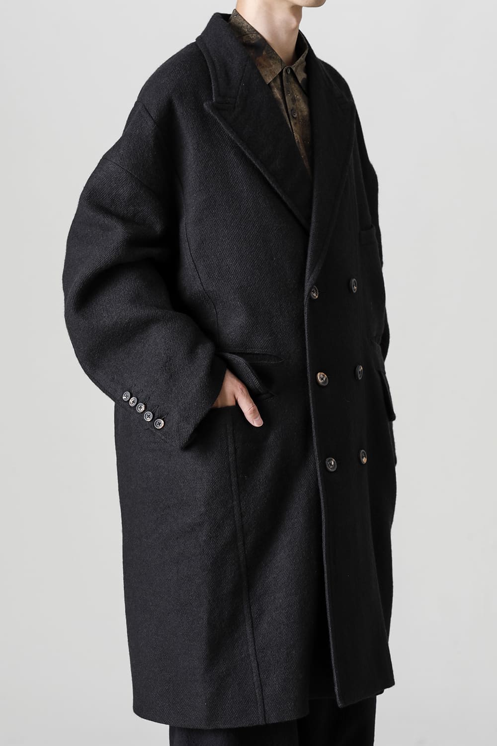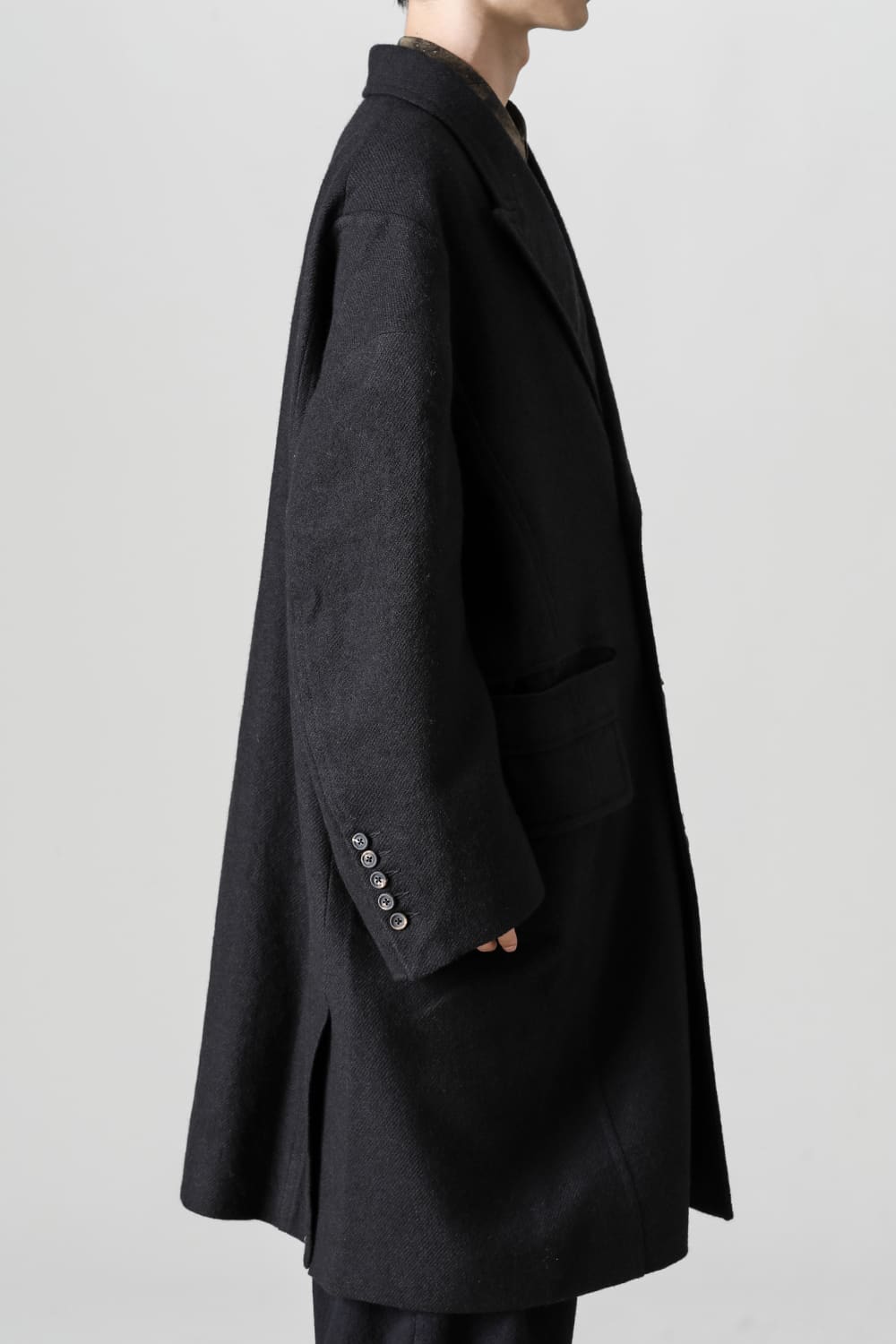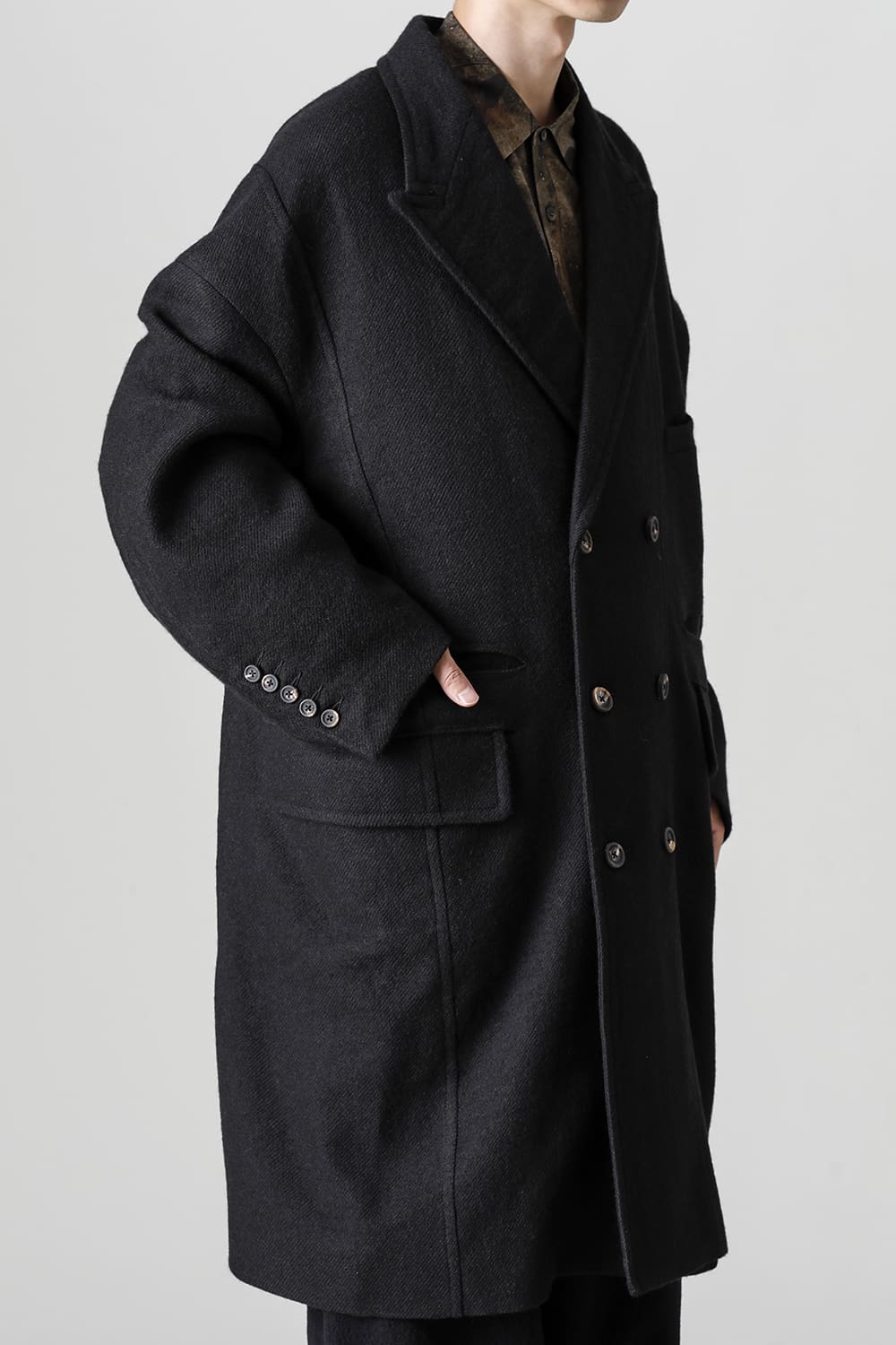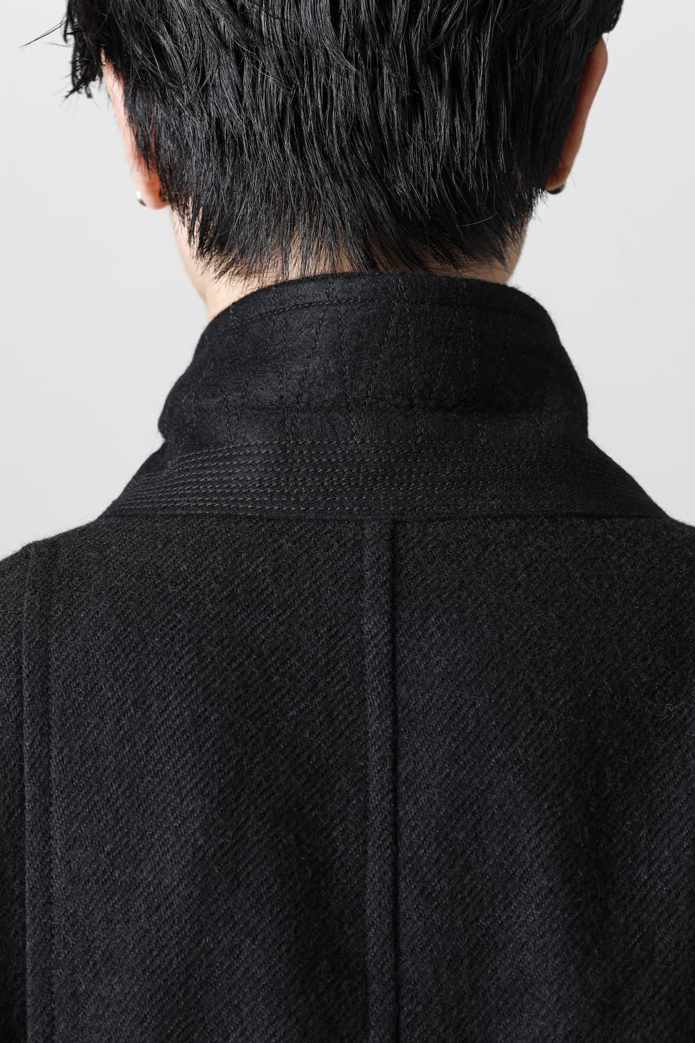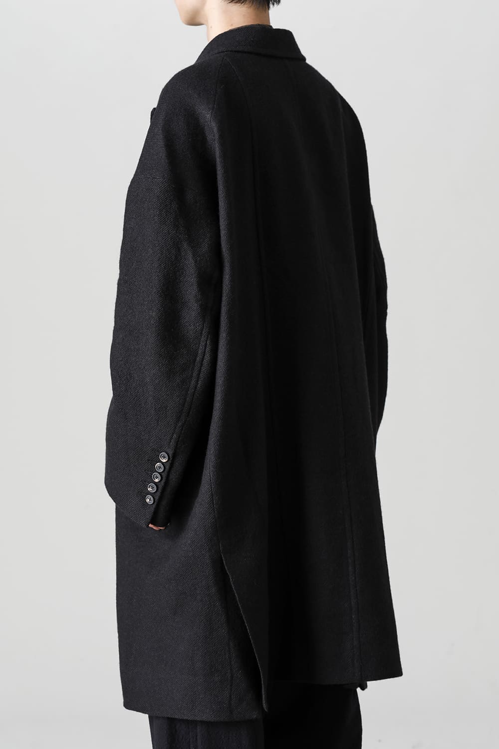 同ブランドを象徴するアウターウェアの一つともいえるオーバーサイズのダブルブレステッドピークドラペルコート。毎シーズン細かくパターンやデザイン、ファブリックを変更して展開されているコクーンシルエットが特徴のコートです。今期はヴァージンウール リネンの重厚なブラッシュドツイルを使用したベーシックなBLACKカラーで展開。柔らかなタッチとしっかりとした肉感のある生地ですので、冬本番でも安心感のある着用感です。一見ベーシックなオーバーサイズコートでありながら、左右のパターンが全く異なるアシンメトリーなパターンワークは同ブランドらしい遊び心のあるデザインです。身頃のサイドにはこれまで通りデザインされたフラップポケットに加えてジェッティドポケットを配置。しっかりと厚みがあり、ストーンウォッシュがかけられたホーンボタンと、シーズン性を曖昧にする意図で毎シーズン継続使用されているコットンキュプラのスリーブライニングなど、クラシックなZIGGY CHENのディテールも健在です。