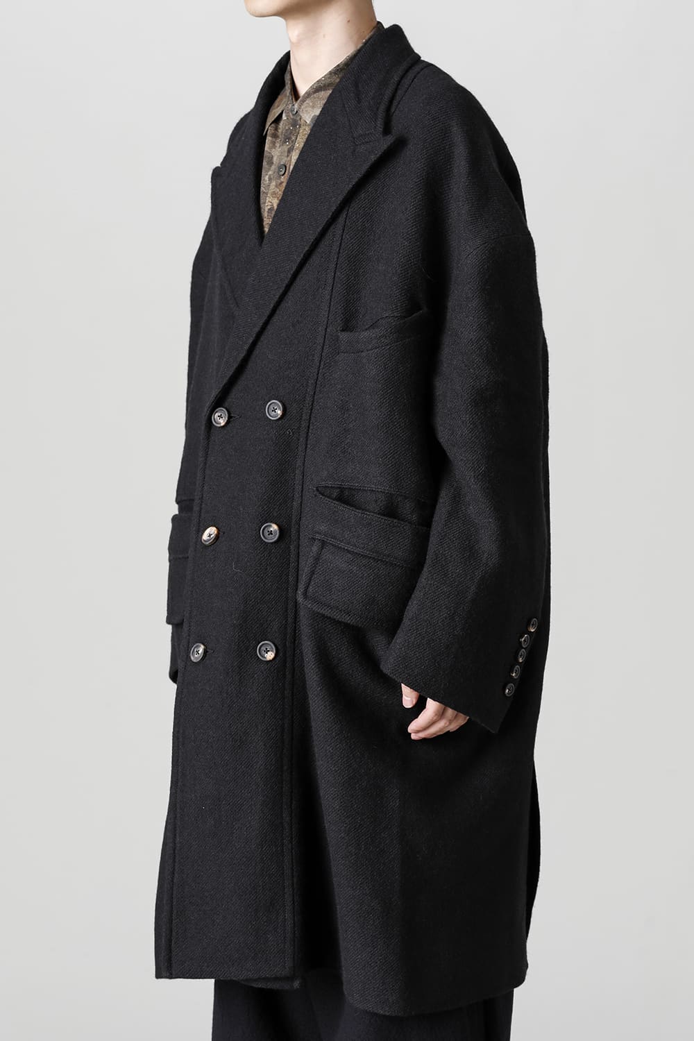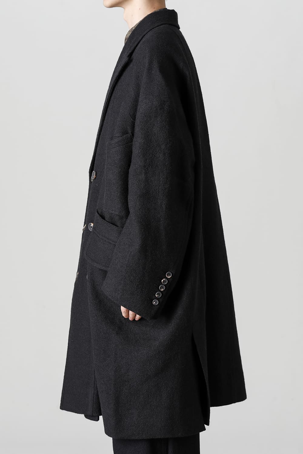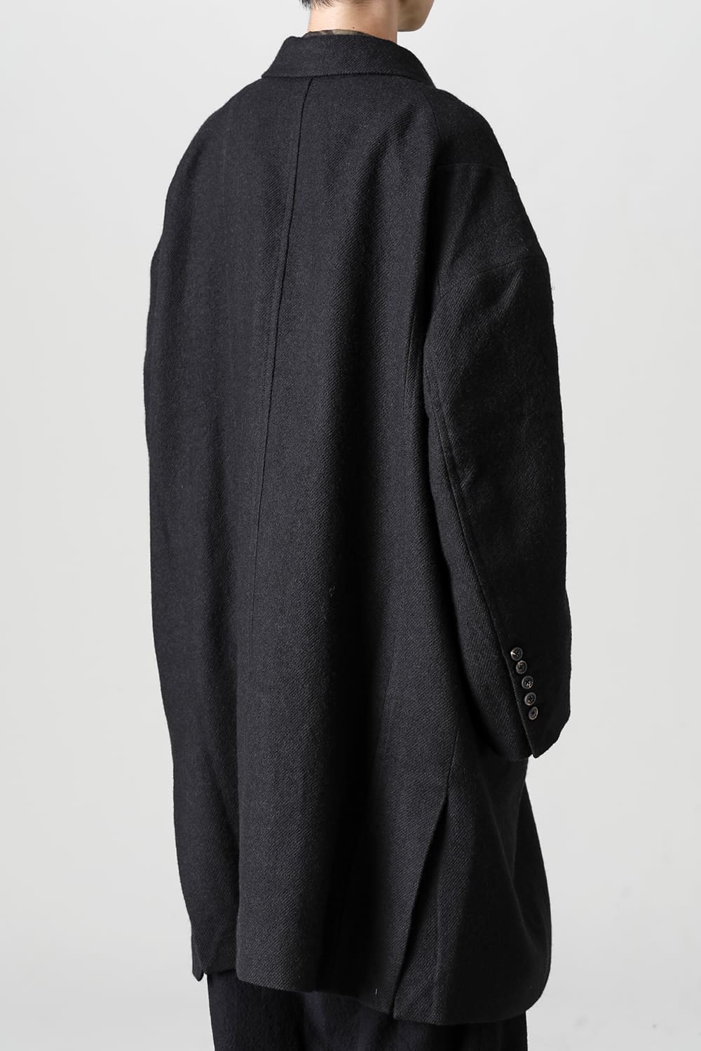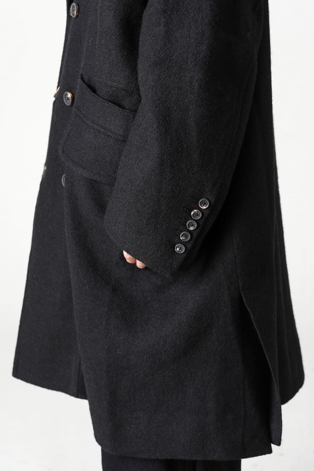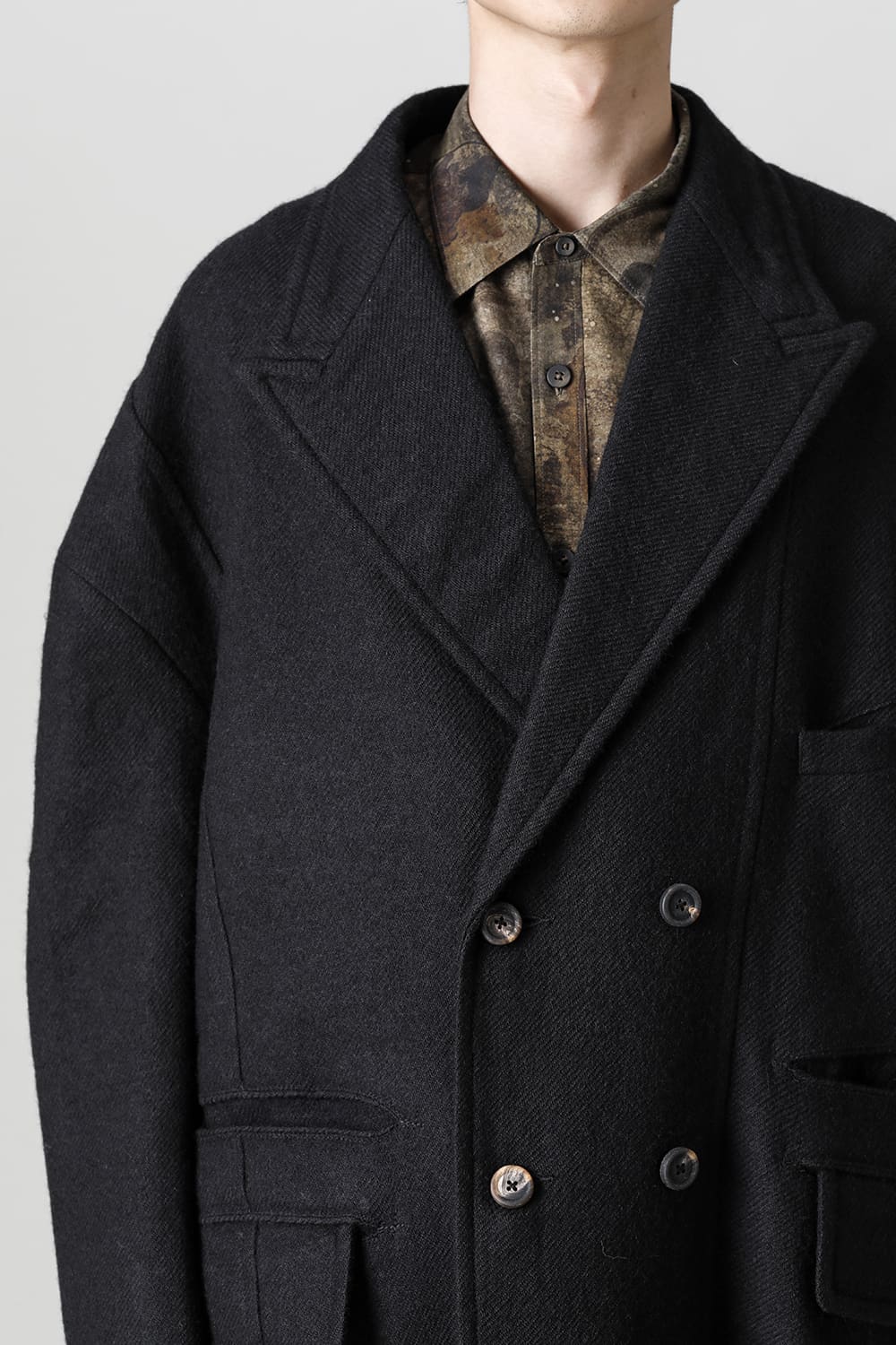 同ブランドを象徴するアウターウェアの一つともいえるオーバーサイズのダブルブレステッドピークドラペルコート。毎シーズン細かくパターンやデザイン、ファブリックを変更して展開されているコクーンシルエットが特徴のコートです。今期はヴァージンウール リネンの重厚なブラッシュドツイルを使用したベーシックなBLACKカラーで展開。柔らかなタッチとしっかりとした肉感のある生地ですので、冬本番でも安心感のある着用感です。一見ベーシックなオーバーサイズコートでありながら、左右のパターンが全く異なるアシンメトリーなパターンワークは同ブランドらしい遊び心のあるデザインです。身頃のサイドにはこれまで通りデザインされたフラップポケットに加えてジェッティドポケットを配置。しっかりと厚みがあり、ストーンウォッシュがかけられたホーンボタンと、シーズン性を曖昧にする意図で毎シーズン継続使用されているコットンキュプラのスリーブライニングなど、クラシックなZIGGY CHENのディテールも健在です。