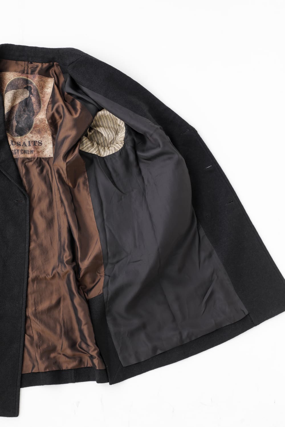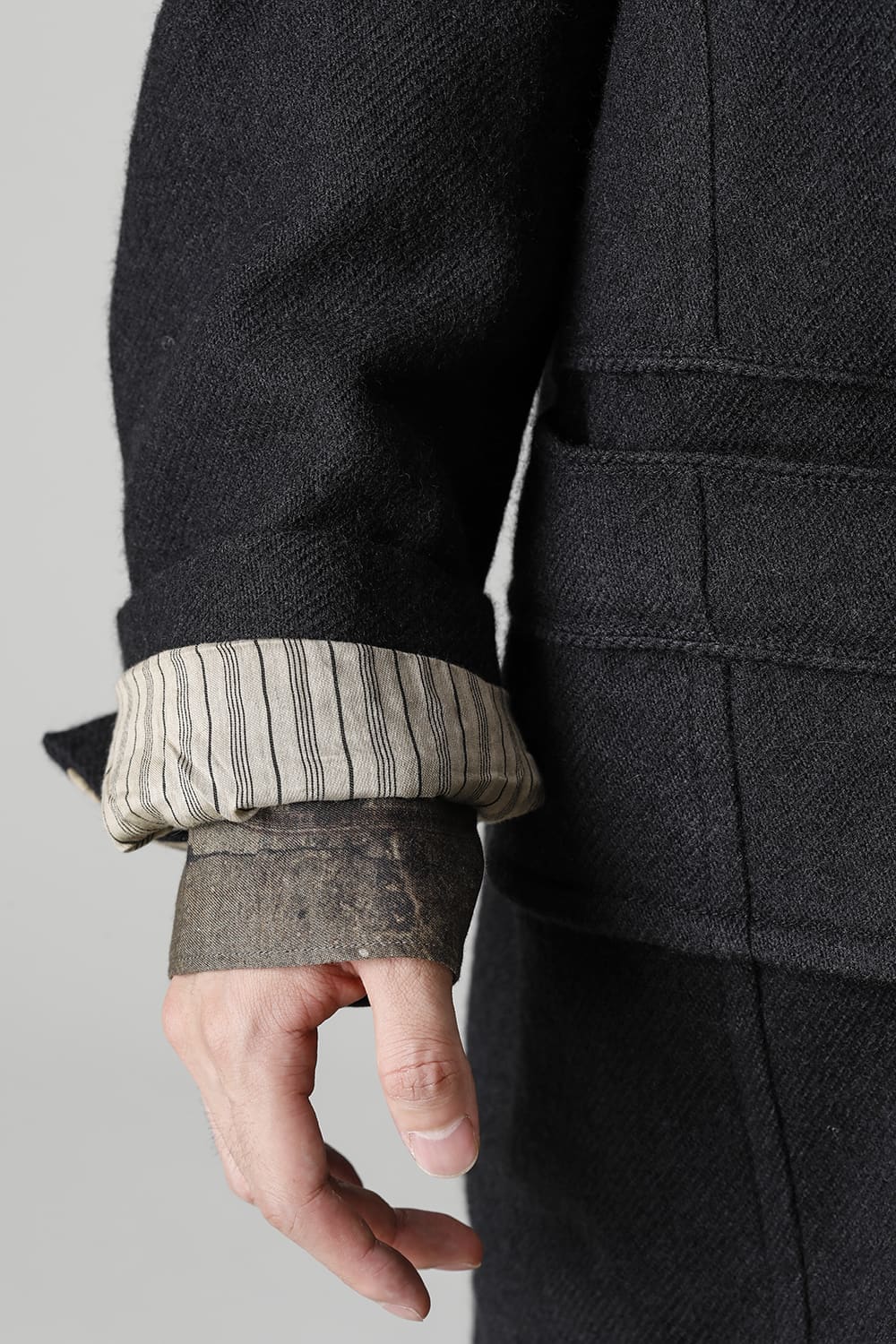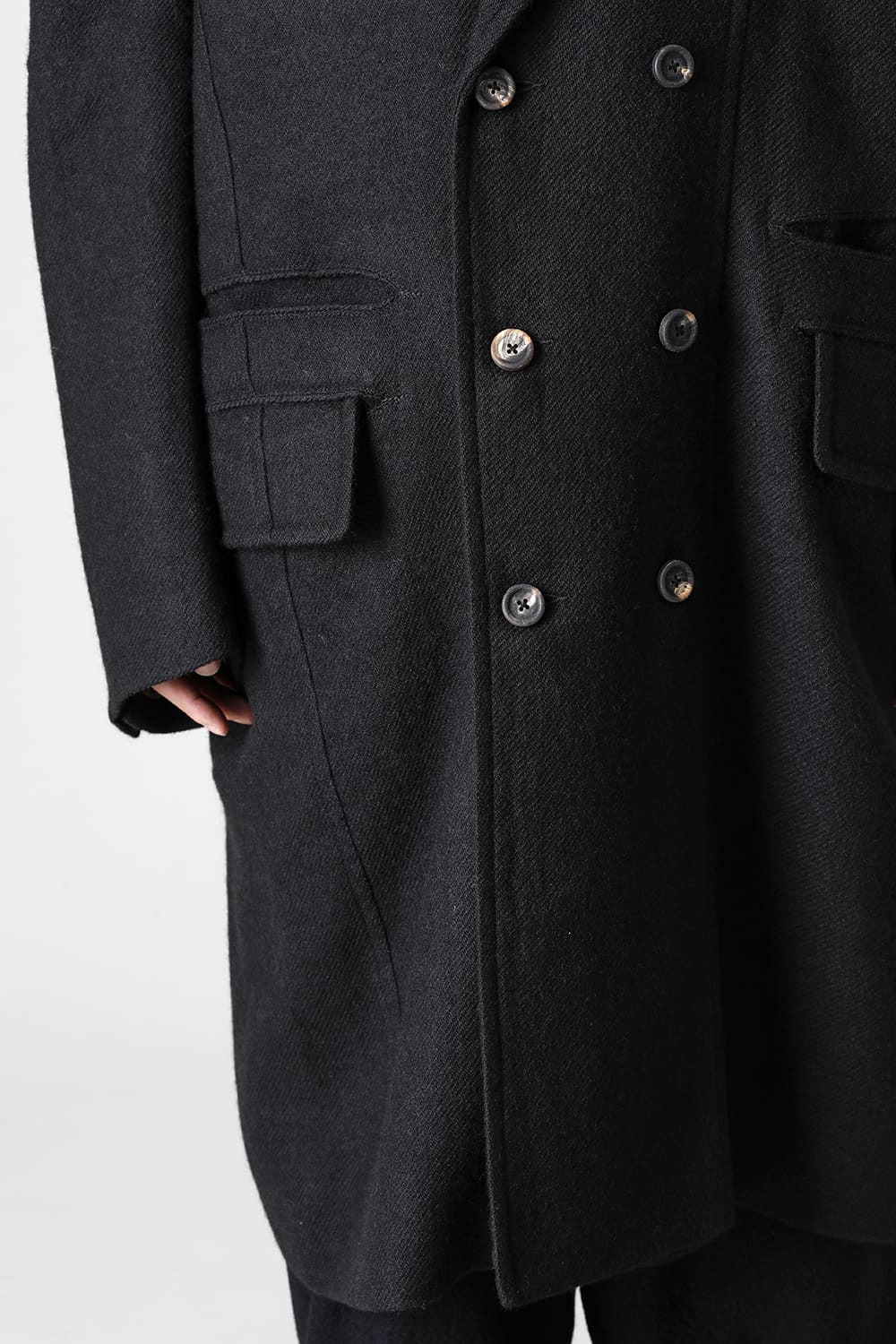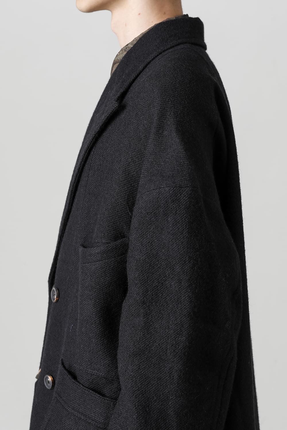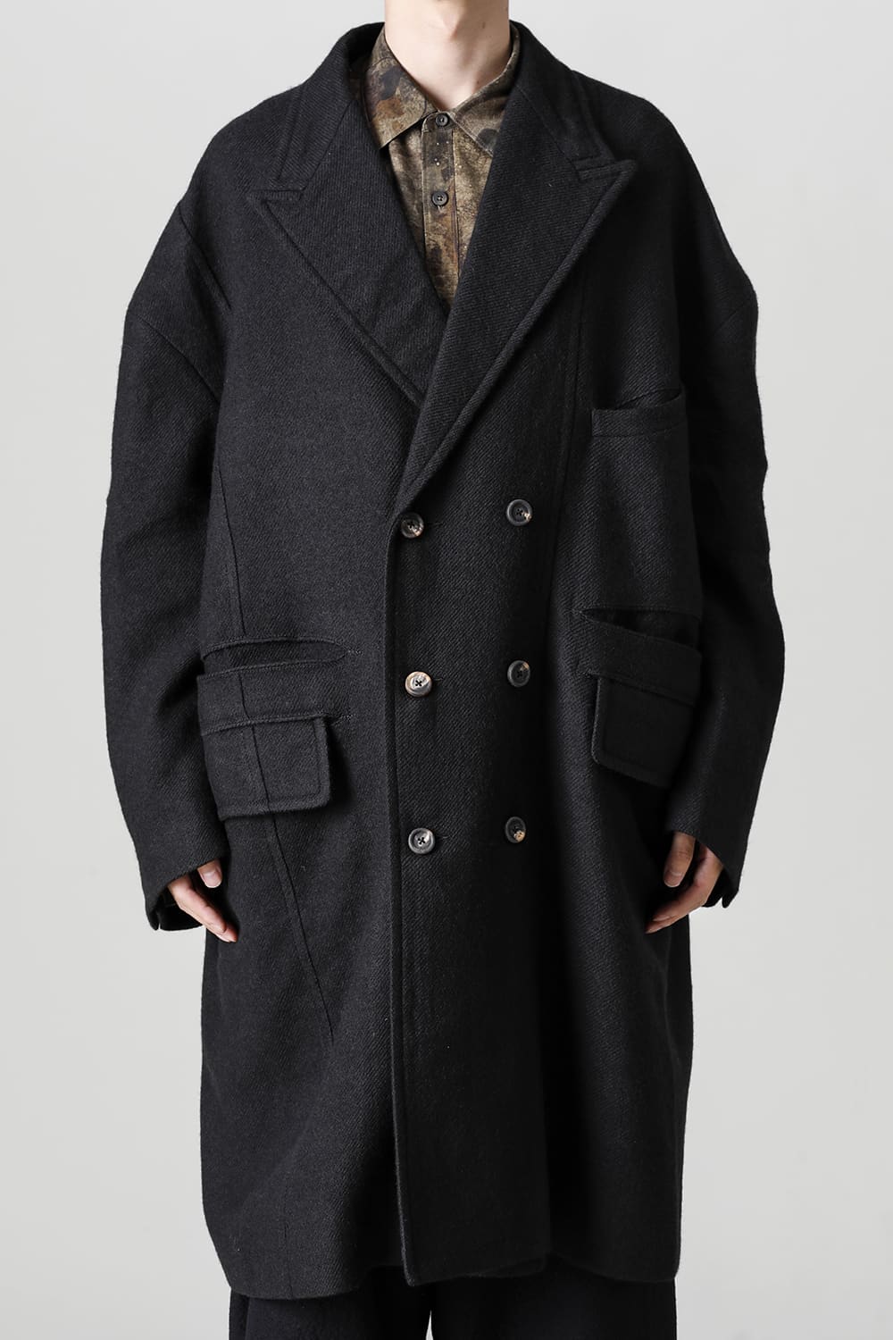 同ブランドを象徴するアウターウェアの一つともいえるオーバーサイズのダブルブレステッドピークドラペルコート。毎シーズン細かくパターンやデザイン、ファブリックを変更して展開されているコクーンシルエットが特徴のコートです。今期はヴァージンウール リネンの重厚なブラッシュドツイルを使用したベーシックなBLACKカラーで展開。柔らかなタッチとしっかりとした肉感のある生地ですので、冬本番でも安心感のある着用感です。一見ベーシックなオーバーサイズコートでありながら、左右のパターンが全く異なるアシンメトリーなパターンワークは同ブランドらしい遊び心のあるデザインです。身頃のサイドにはこれまで通りデザインされたフラップポケットに加えてジェッティドポケットを配置。しっかりと厚みがあり、ストーンウォッシュがかけられたホーンボタンと、シーズン性を曖昧にする意図で毎シーズン継続使用されているコットンキュプラのスリーブライニングなど、クラシックなZIGGY CHENのディテールも健在です。