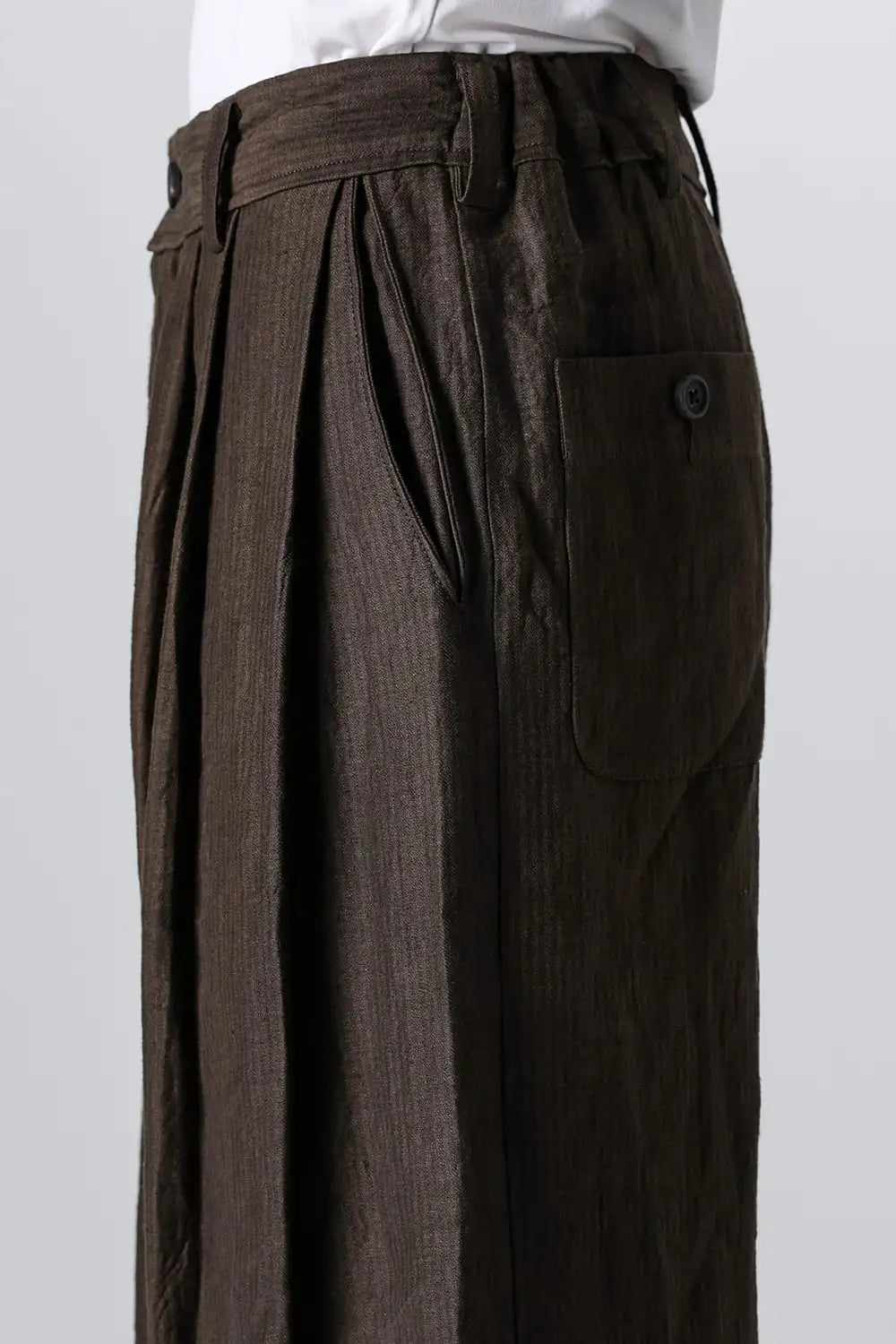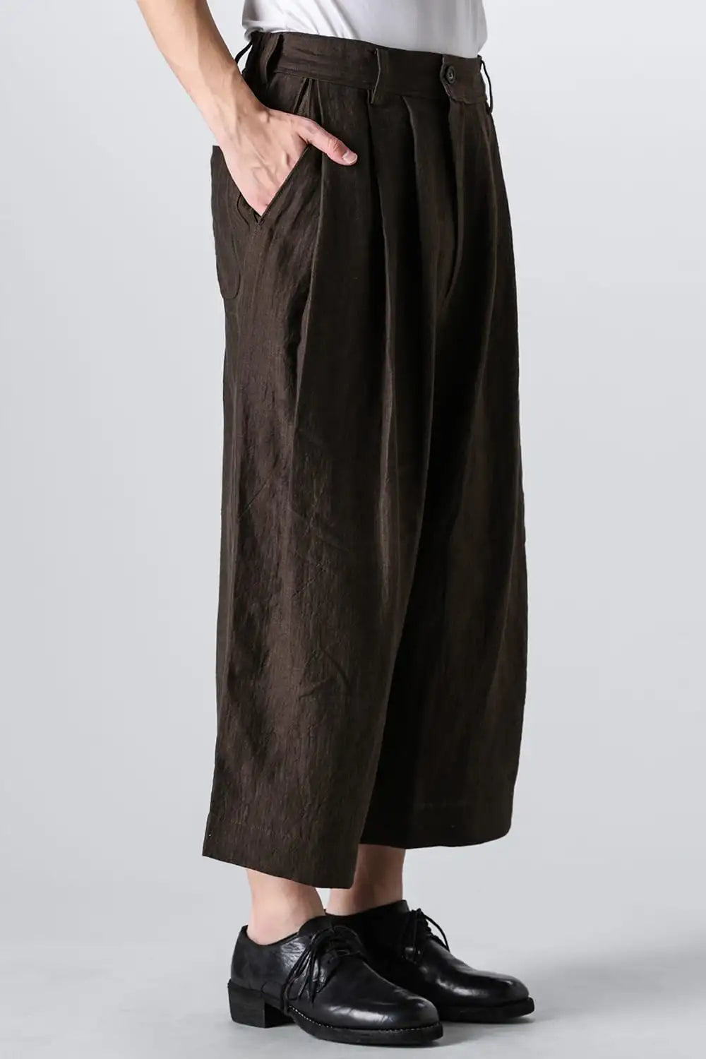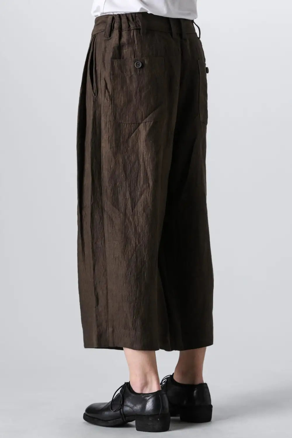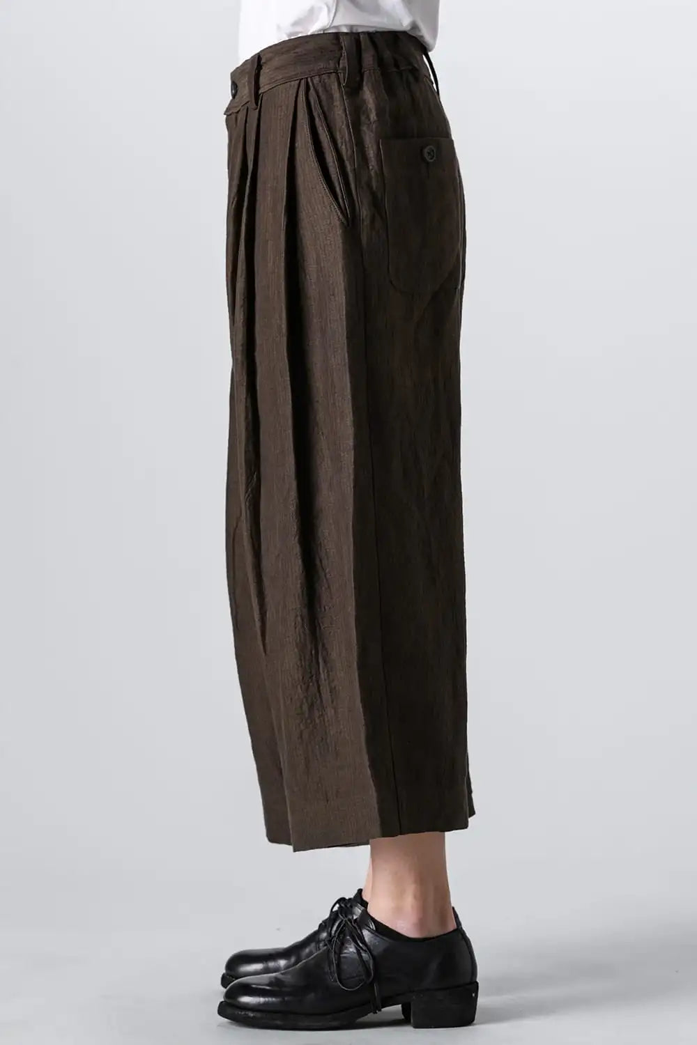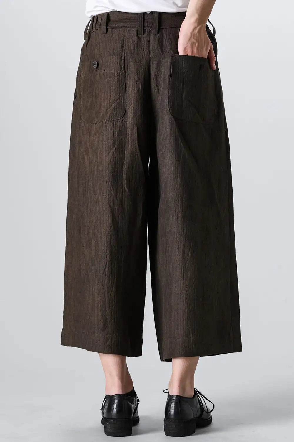 3タックのワイドシルエットのクロップドパンツ。 ベルトループ付きですが、ウエストの両サイドにゴムが着用者のサイズに合わせて伸縮するので、1つのサイズで幅広くカバーできます。 両サイドにポケット、バックポケットは水牛ボタン付きのパッチポケットがついています。 素材はリネンで透け感はないですが薄手で通気性も良く、腿から裾にかけてテーパードの少ないシルエットがしなやかなドレープ性のある生地感とよくマッチしています。