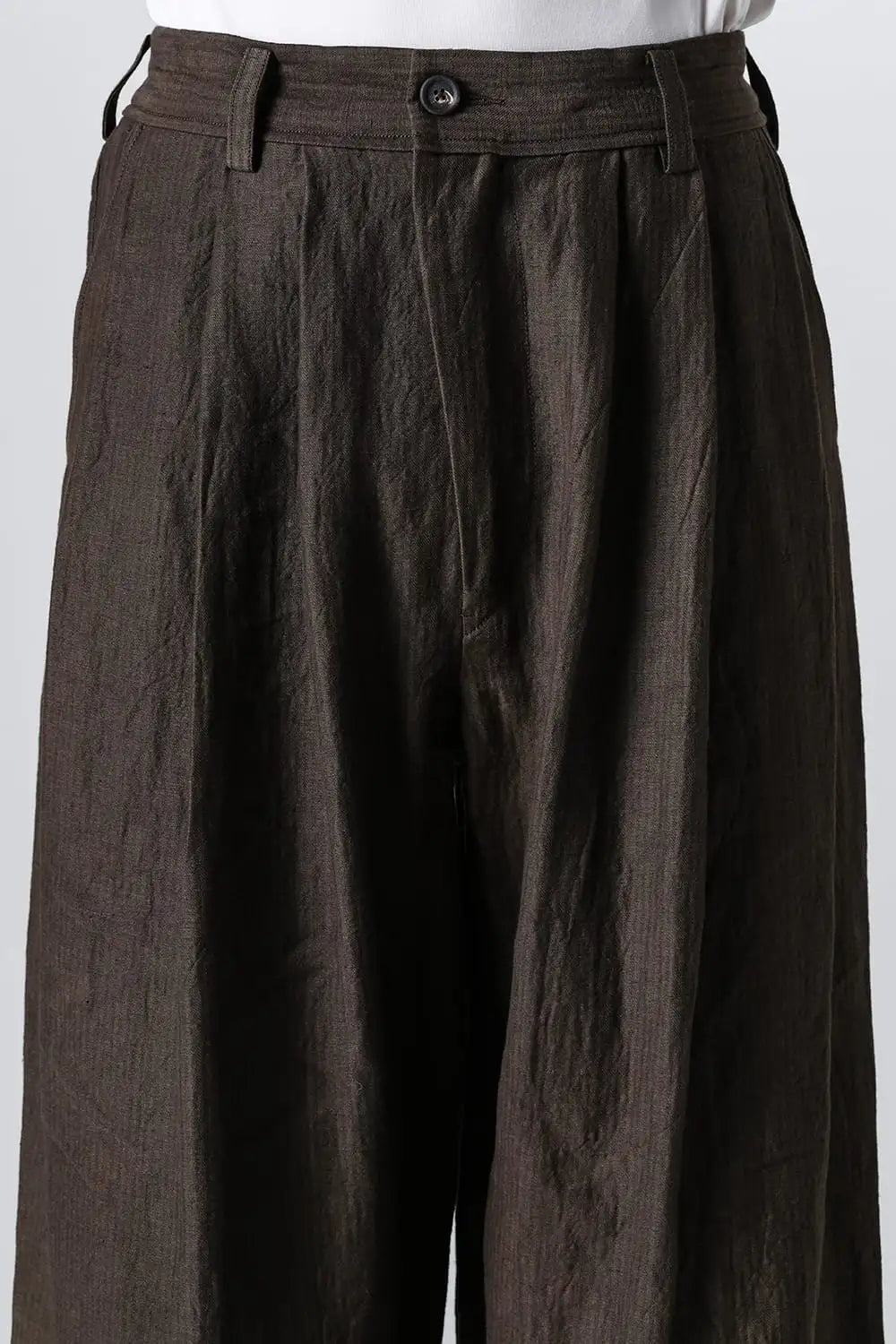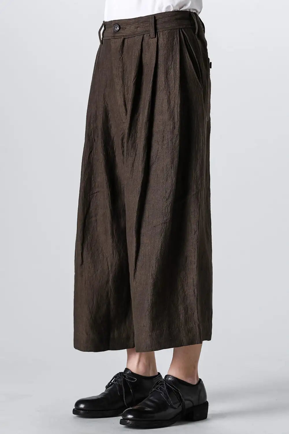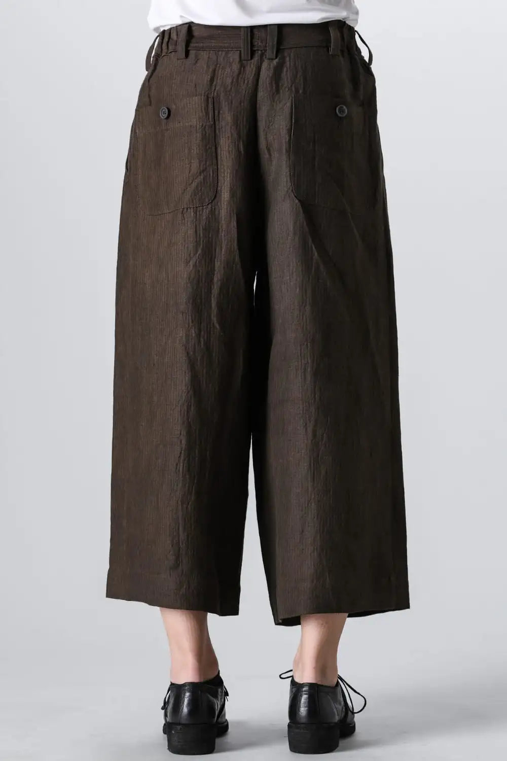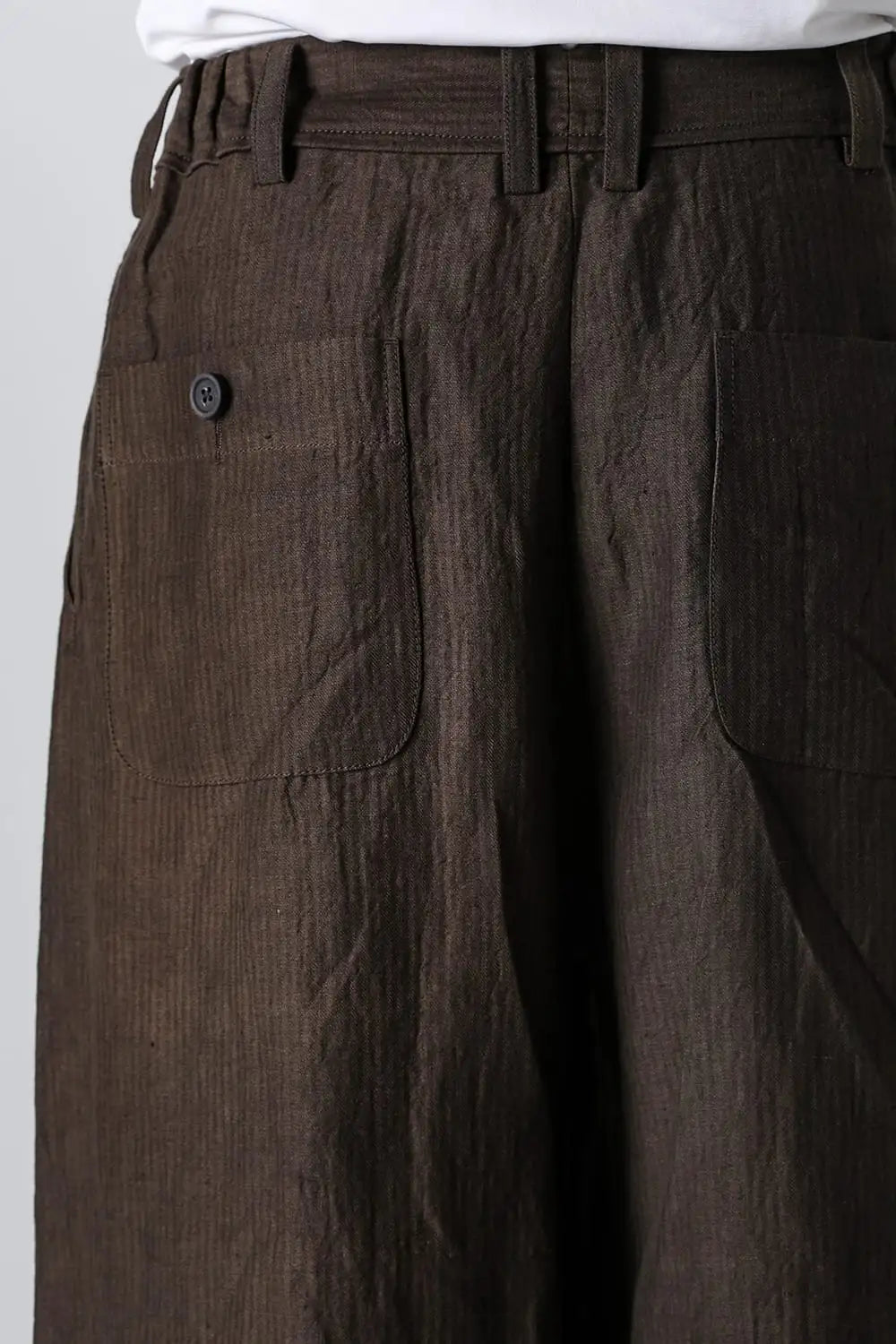 3タックのワイドシルエットのクロップドパンツ。 ベルトループ付きですが、ウエストの両サイドにゴムが着用者のサイズに合わせて伸縮するので、1つのサイズで幅広くカバーできます。 両サイドにポケット、バックポケットは水牛ボタン付きのパッチポケットがついています。 素材はリネンで透け感はないですが薄手で通気性も良く、腿から裾にかけてテーパードの少ないシルエットがしなやかなドレープ性のある生地感とよくマッチしています。